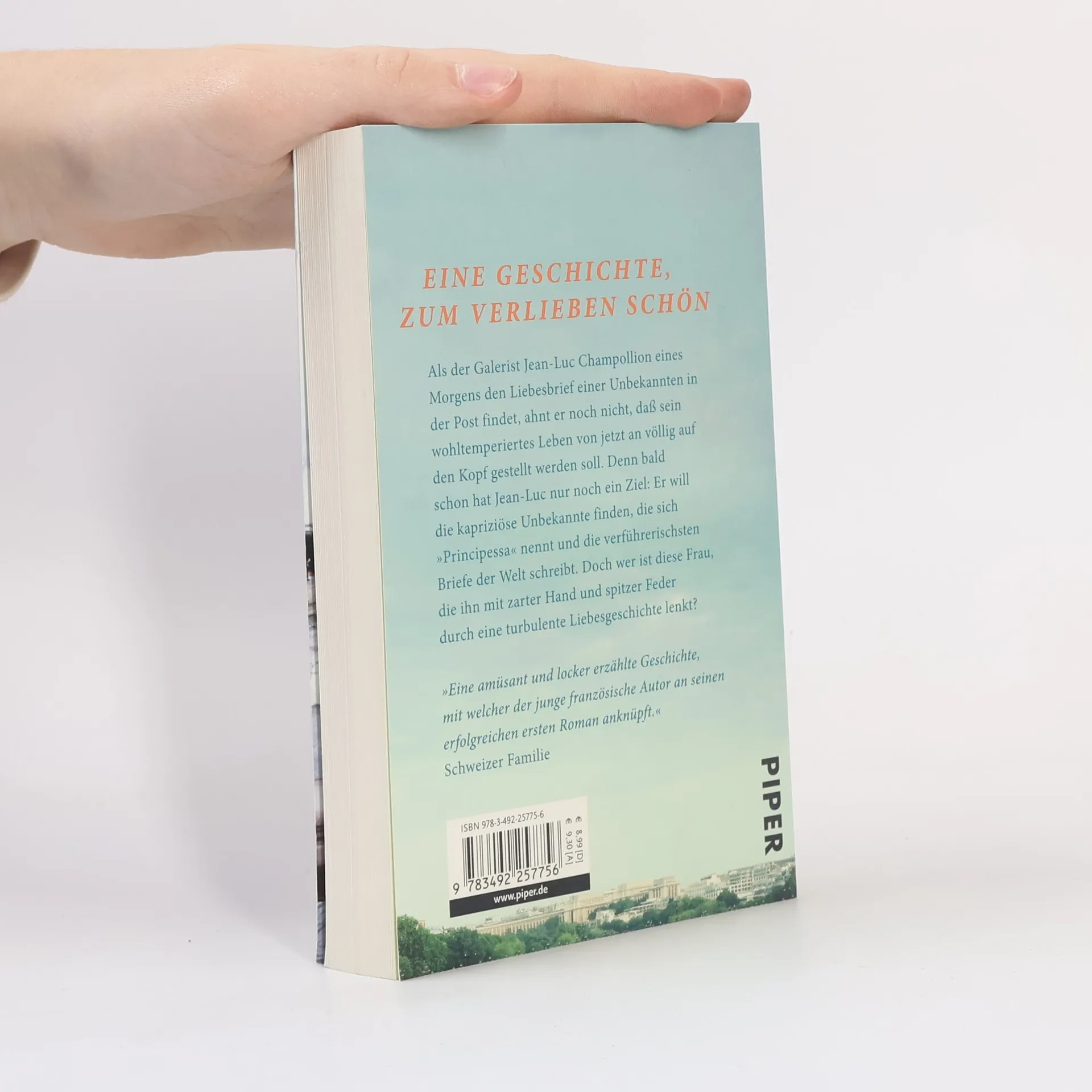 Als der Galerist Jean-Luc Champollion eines Morgens den Liebesbrief einer Unbekannten in der Post findet, ahnt er noch nicht, dass sein wohltemperiertes Leben von jetzt an völlig auf den Kopf gestellt werden soll. Denn bald schon hat Jean-Luc nur noch ein Ziel: Er will die kapriziöse Unbekannte finden, die sich »Principessa« nennt und die verführerischsten Briefe der Welt schreibt. Doch wer ist diese Frau, die ihn mit zarter Hand und spitzer Feder durch eine turbulente Liebesgeschichte lenkt?