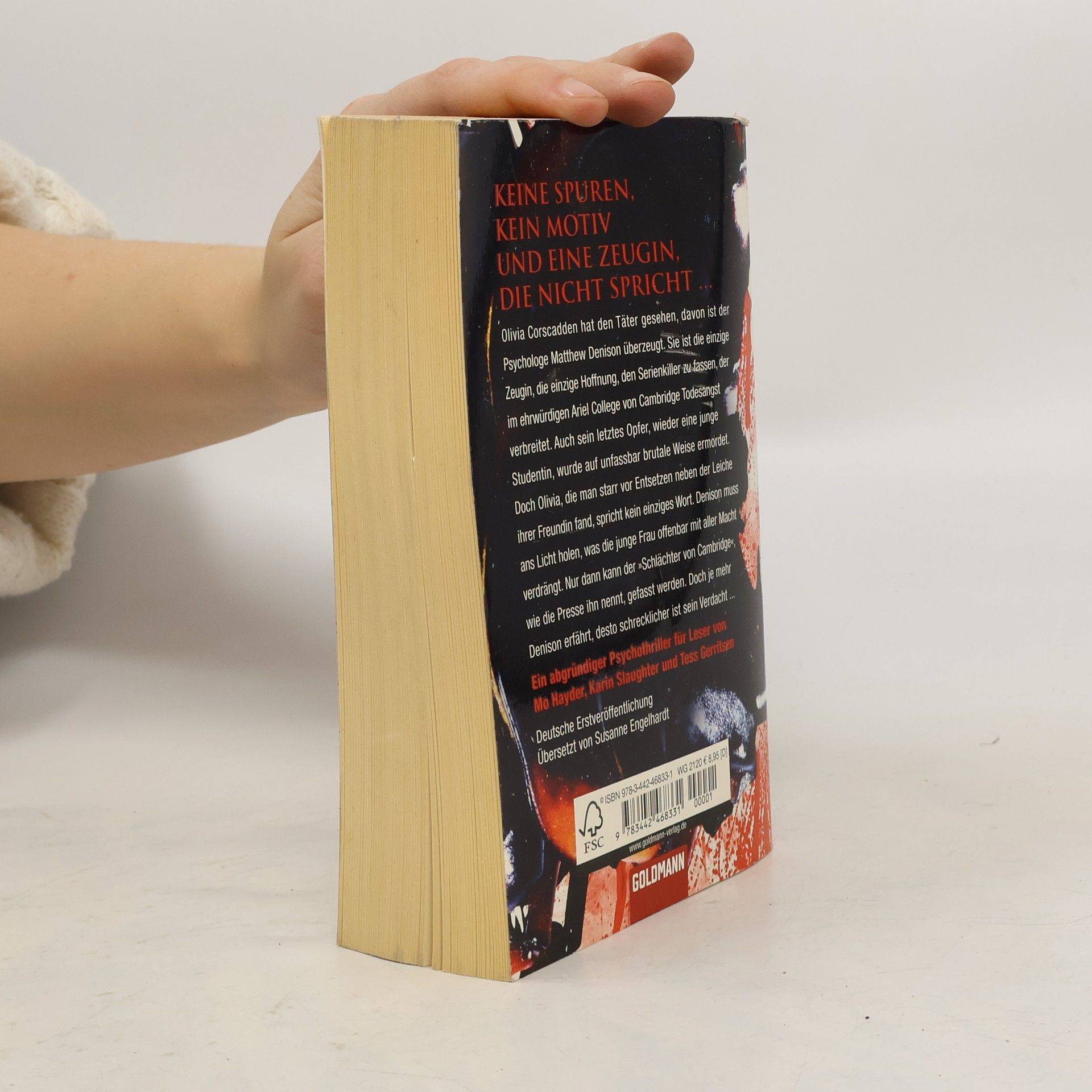 Olivia Corscadden ist die einzige Zeugin eines brutalen Mordes an einer Studentin am Ariel College in Cambridge. Psychologe Matthew Denison ist überzeugt, dass sie den Serienkiller gesehen hat, doch Olivia spricht kein Wort. Um den als „Schlächter von Cambridge“ bekannten Täter zu fassen, muss Denison Olivia zum Reden bringen und die Erinnerungen an die schrecklichen Ereignisse ans Licht holen. Der Anblick der grausam zugerichteten Leiche einer jungen Frau verstört Denison, der an den Anblick von Leichen nicht gewöhnt ist. Es ist bereits der dritte Mord am College, und die Polizei hat Denisons Verdacht auf einen Serienkiller zunächst nicht ernst genommen. Mit dem Bekanntwerden der Morde in der Presse wird der Druck größer. Olivia, die in einem Schockzustand gefunden wurde, bleibt stumm, während ihr Freund Nick Hardcastle ebenfalls unter Schock steht. Blut und menschliche Eingeweide sind auf seiner Kleidung sichtbar, und er murmelt verwirrte Worte. Denison steht vor der Herausforderung, Olivias Starre zu durchbrechen und herauszufinden, was sie wirklich gesehen hat. Er muss schnell handeln, bevor der Mörder erneut zuschlägt und möglicherweise alle Zeugen beseitigt.