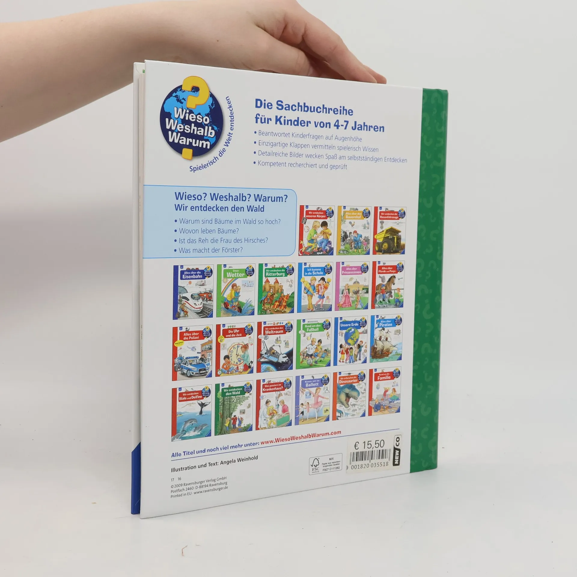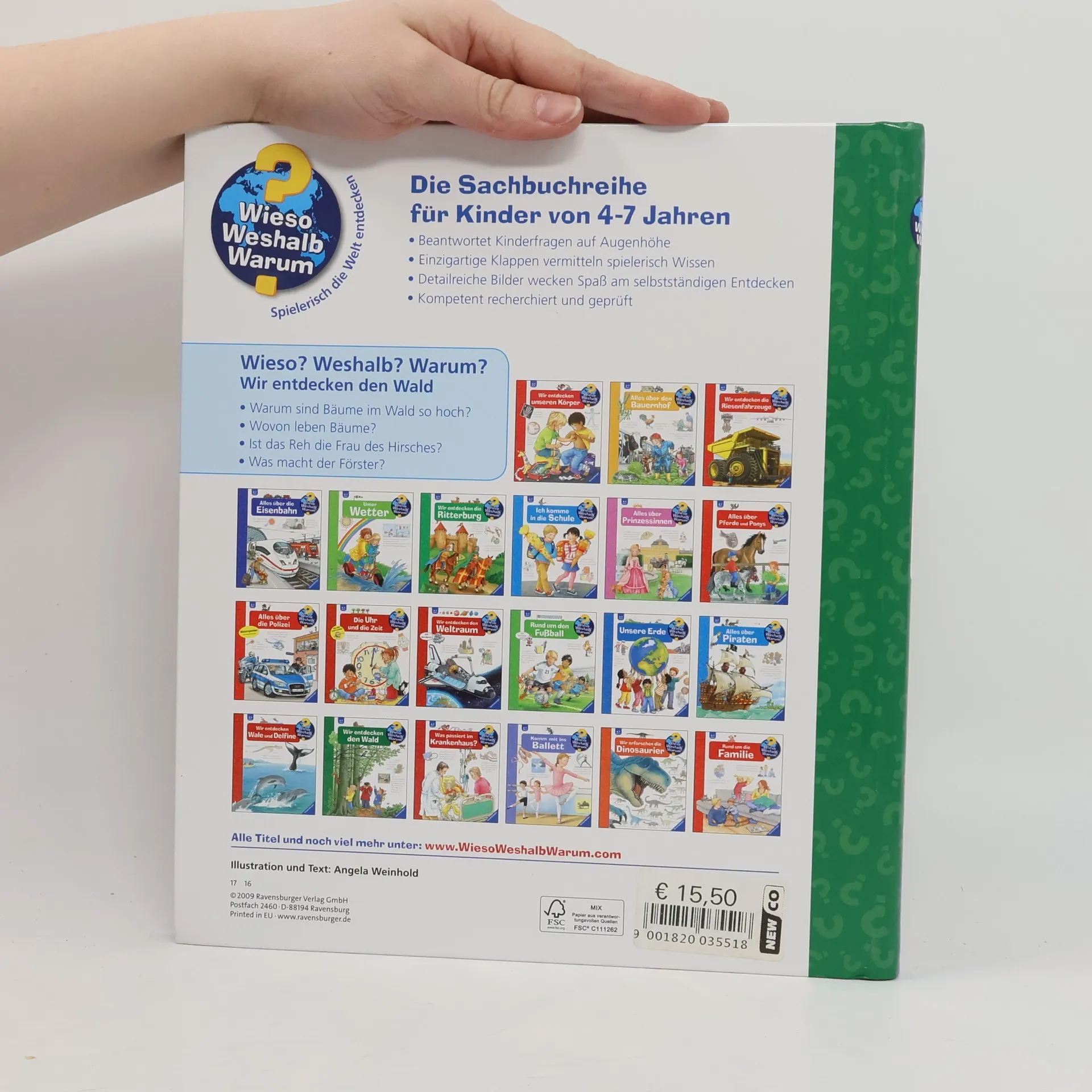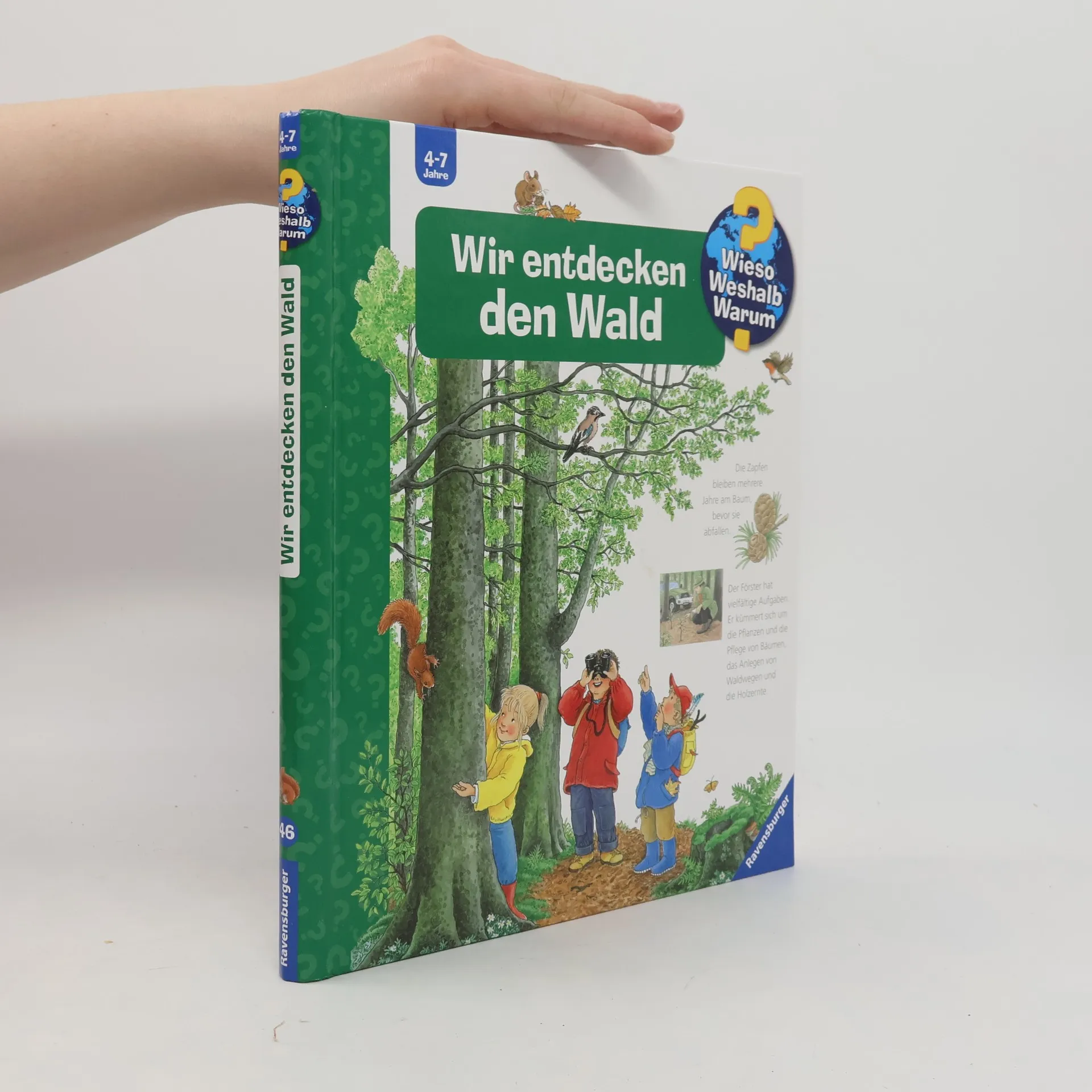 Auf Wanderwegen toben, Eicheln und Zapfen aufsammeln und mit etwas Glück ein Reh erspähen – ein Besuch im Wald lohnt sich immer. Wer den Geheimnissen des Waldes auf den Grund gehen möchte, braucht dieses Buch: Welches Blatt gehört zu welchem Baum? Ist das Reh die Frau des Hirsches? Was macht ein Förster? Hier entdecken Kinder in detailreichen Bildern mit vielen Klappen jede Menge Sachwissen über die Pflanzen- und Tierwelt des Waldes. Wieso? Weshalb? Warum? Die Sachbuchreihe für Kinder von 4–7 Jahren Jeden Tag entdecken Kinder etwas Neues – da kommen viele Fragen auf. Warum sind die Dinosaurier ausgestorben? Wo ist die Sonne in der Nacht? Wozu brauchen wir das Blut? Die beliebte Sachbuchreihe Wieso? Weshalb? Warum? gibt Kindern Antworten auf Augenhöhe. Dabei werden die unterschiedlichsten Themen aus der Alltags- und Interessenswelt der Kinder altersgerecht und mit viel Liebe zum Detail unter die Lupe genommen. Detailreiche Bilder, verständliche Sachtexte und überraschende Klappen, die Bewegungen oder Abläufe veranschaulichen und hinter die Dinge blicken lassen, ermöglichen Kindern, sich ihre Themen selbst zu erschließen. Der Spaß am eigenhändigen Entdecken, die liebevolle Umsetzung und die qualitativ hochwertige Ausstattung garantieren langanhaltende Freude an jedem einzelnen Buch.