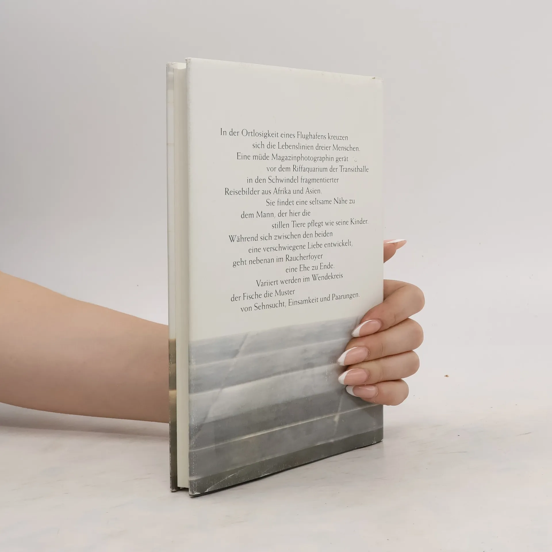 Im Ortlosigkeit eines Flughafens kreuzen sich die Lebenslinien dreier Menschen. Eine müde Magazinfotografin steht vor dem Riffaquarium der Transithalle und wird von fragmentierten Reisebildern aus Afrika und Asien überwältigt. Sie entwickelt eine seltsame Nähe zu einem Mann, der die stillen Tiere wie seine Kinder pflegt. Während zwischen ihnen eine verschwiegene Liebe entsteht, geht im Raucherfoyer eine Ehe zu Ende. Die Geschichte variiert die Muster von Sehnsucht, Einsamkeit und Paarungen. Elis, ohne Anschlussflug, zweifelt an ihrem Leben als Magazinfotografin und bleibt vor einem riesigen Aquarium stehen. Fische aus tropischen Meeren ziehen über Korallenbänke, während Passanten den Glaskörper umfließen. Als sie Tobias entdeckt, der die Scheiben reinigt, beginnt sie, sich für ihn zu interessieren. Auch er hat sie beobachtet, aus einem Grund, den sie nicht ahnt. Sie sprechen über Fischsymbiosen und ihre unglücklichen Liebesgeschichten. Trotz der Missverständnisse entsteht eine vorsichtige Vertrautheit, die alles verändern könnte. Im Raucherfoyer führt ein alternder Biochemiker einen finalen Ehemonolog. Die Erzählung variiert im Transit eines futuristischen Flughafens die zeitlosen Themen Liebe und Tod und öffnet irritierende und berührende Innenräume.