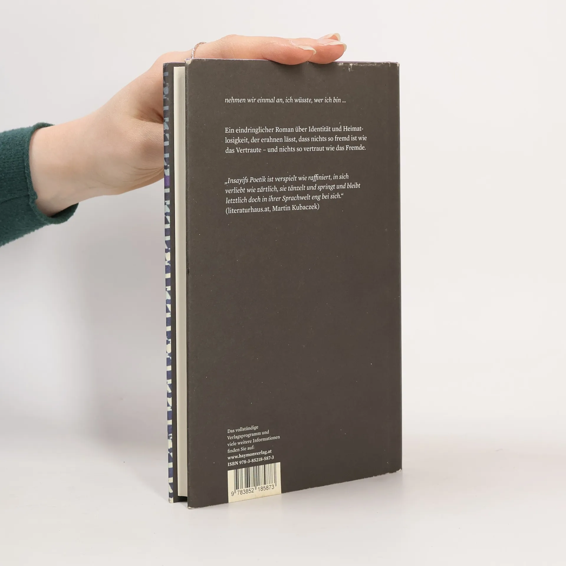 Wien, um 1950: Ein junger Mann macht sich aus seiner Heimat Bagdad auf nach Wien; er will Medizin studieren, eine neue Zukunft aufbauen, fern von der Heimat. Jahrzehnte später: Ein anderer junger Mann begibt sich, einen Schritt vor den anderen setzend, auf den Weg zu seinen Wurzeln, in die Geschichte seiner Familie. Seine Erinnerung führt ihn zurück nach Bagdad, in die Heimat des Vaters. Entlang arabischer Worte, Zeichen und Satzfetzen, die wie aus einem Nebelschleier auftauchen, tritt er ein in eine fremdvertraute Sprache und Kultur; und er begegnet einer Frau, die unendlich weit entfernt ist, und vielleicht zugleich unendlich nahe.Semier Insayif erzählt in rhythmisierter Prosa, in einem Strom von Handlungssträngen, die an- und abschwellen, sich überlagern und kommentieren. Erinnerung wird zu Sprache, Sprache wird zu Erinnerung, sie fließen ineinander zu einem eindringlichen Bild von Heimat und Fremde und von einem Leben zwischen den Kulturen.