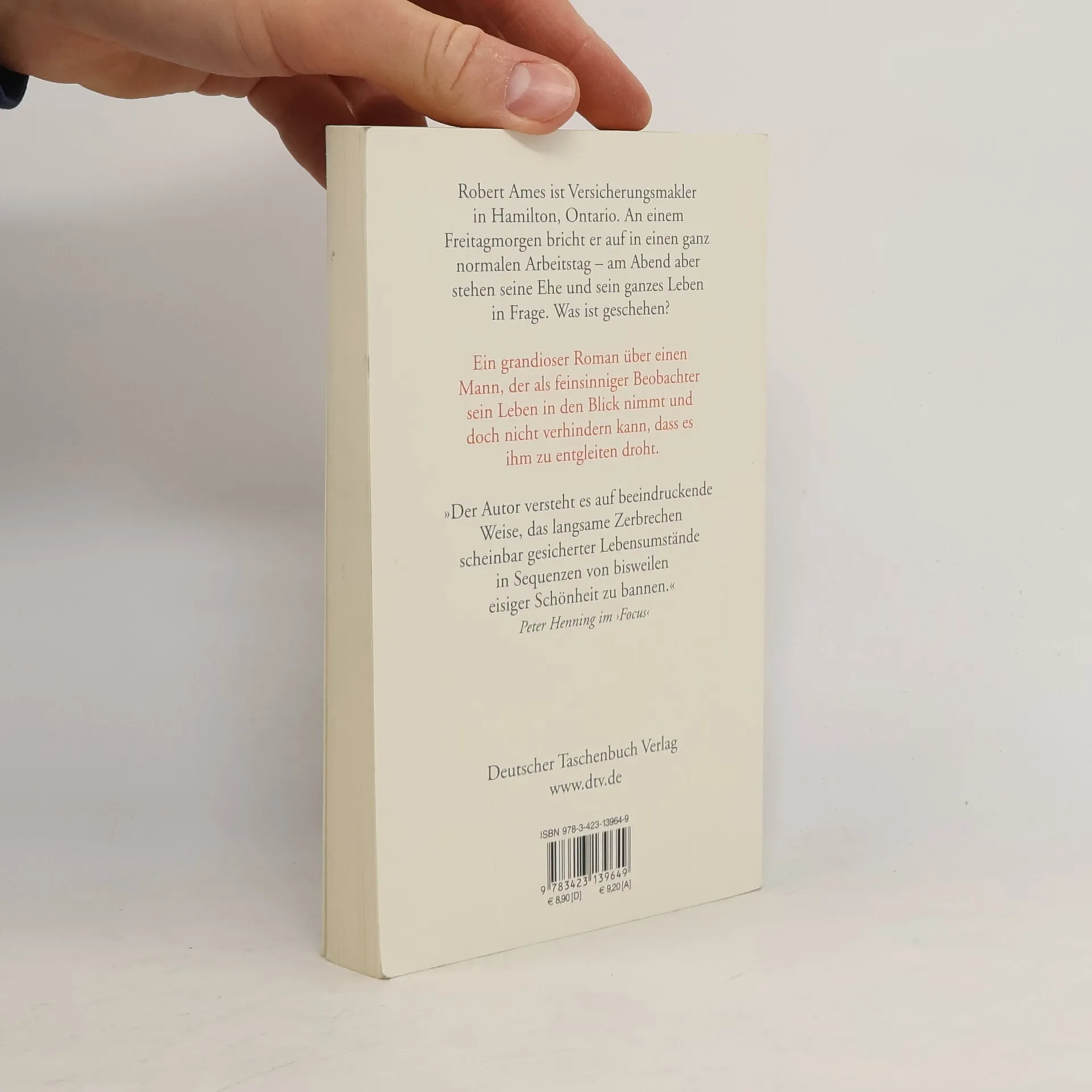 »Das soll dem Autor erst einmal einer nachmachen.« Lothar Müller, Süddeutsche Zeitung Robert Ames ist siebenunddreißig und Versicherungsmakler. Er lebt mit seiner Frau Kala und seinem Sohn Jonathan in einem kleinen Haus in Hamilton, Ontario. An einem Freitagmorgen bricht er auf in einen ganz normalen Arbeitstag – und doch wird alles anders sein als sonst. Am Abend steht plötzlich seine Ehe auf dem Spiel und Robert muss sich fragen, wo im Leben er eigentlich steht. Souverän zeichnet Stefan Mühldorfer das Porträt eines Mannes, der als feinsinniger Beobachter sein Leben in den Blick nimmt und doch nicht verhindern kann, dass es ihm zu entgleiten droht.