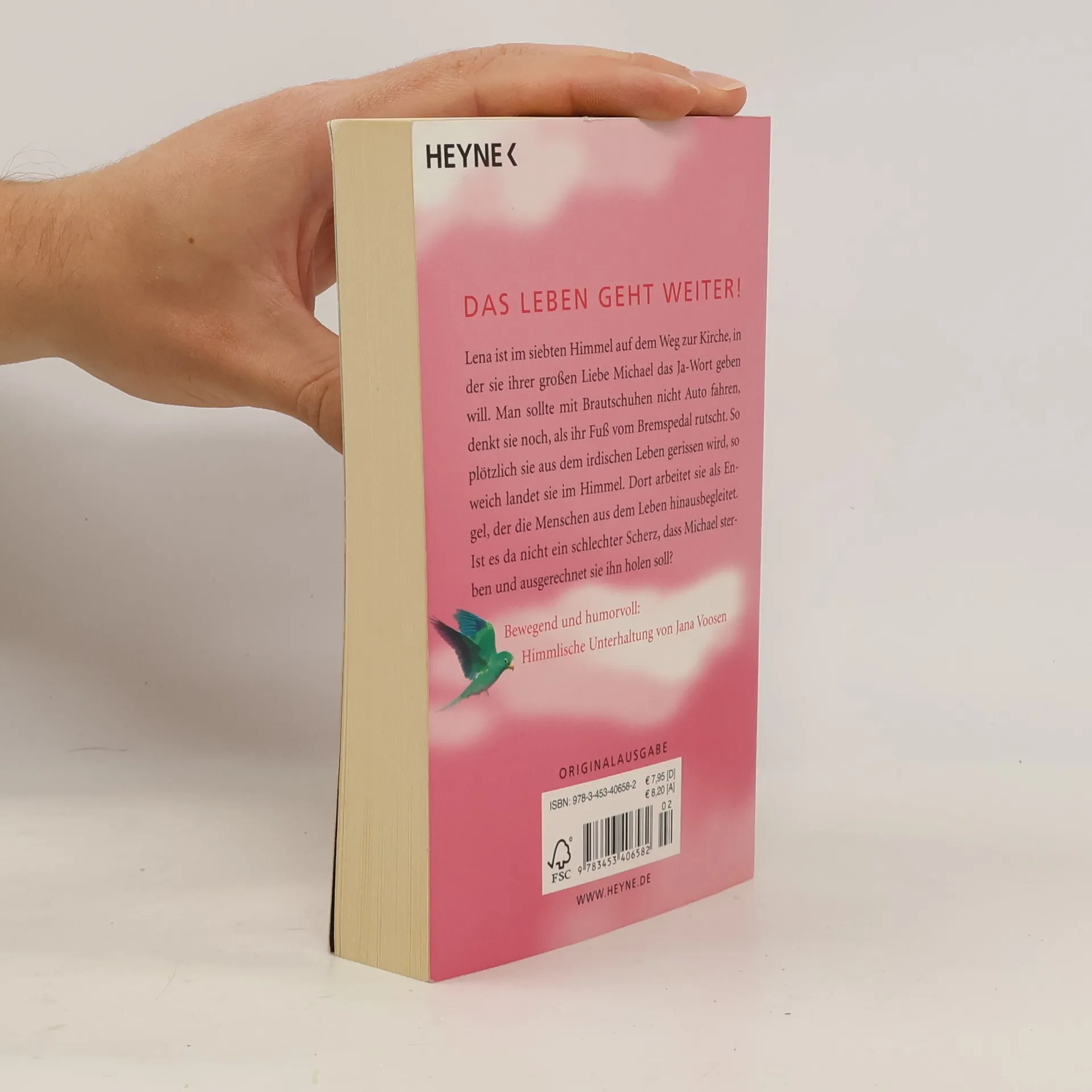 Das Leben geht weiter! Lena ist im siebten Himmel auf dem Weg zur Kirche, in der sie ihrer großen Liebe Michael das Jawort geben will. Man sollte mit Brautschuhen nicht Auto fahren, denkt sie noch, als ihr Fuß vom Bremspedal rutscht. So plötzlich sie aus dem irdischen Leben gerissen wird, so weich landet sie im Himmel. Dort arbeitet sie als Engel, der die Menschen aus dem Leben hinausbegleitet. Ist es da nicht ein schlechter Scherz, dass Michael sterben und ausgerechnet sie ihn holen soll? Himmlische Unterhaltung von Jana Voosen.