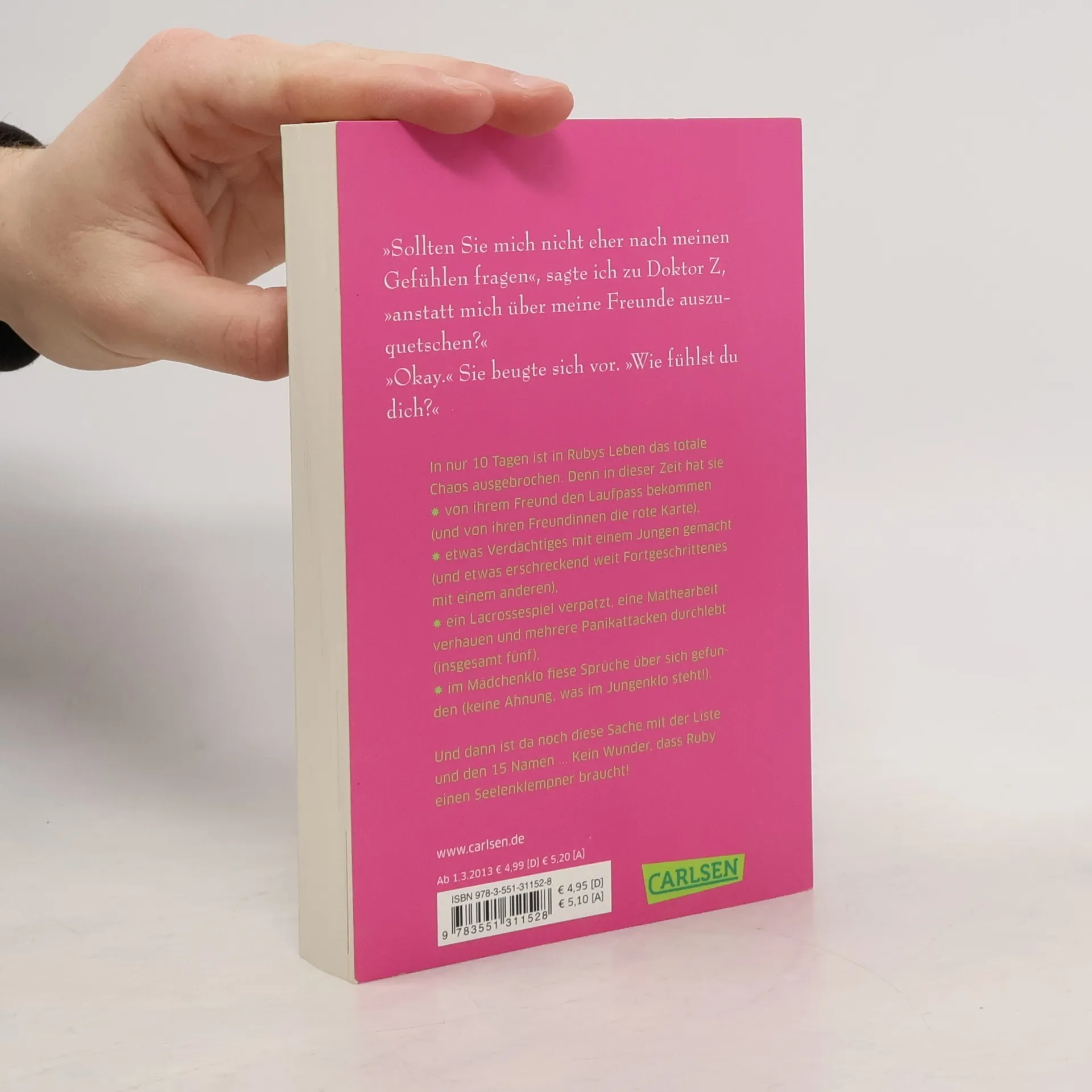 In nur 10 Tagen ist in Rubys Leben das totale Chaos ausgebrochen. Denn in dieser Zeit hat sie • von ihrem Freund den Laufpass bekommen (und von ihren Freundinnen die rote Karte), • etwas Verdächtiges mit einem Jungen gemacht (und etwas erschreckend weit Fortgeschrittenes mit einem anderen), • ein Lacrossespiel verpatzt, eine Mathearbeit verhauen und mehrere Panikattacken durchlebt (insgesamt fünf), • im Mädchenklo fiese Sprüche über sich gefunden (keine Ahnung, was im Jungenklo steht!). Und dann ist da noch diese Sache mit der Liste und den 15 Namen ... Kein Wunder, dass Ruby einen Seelenklempner braucht. Wer so viel Verrücktes erlebt, hat jede Menge zu erzählen!