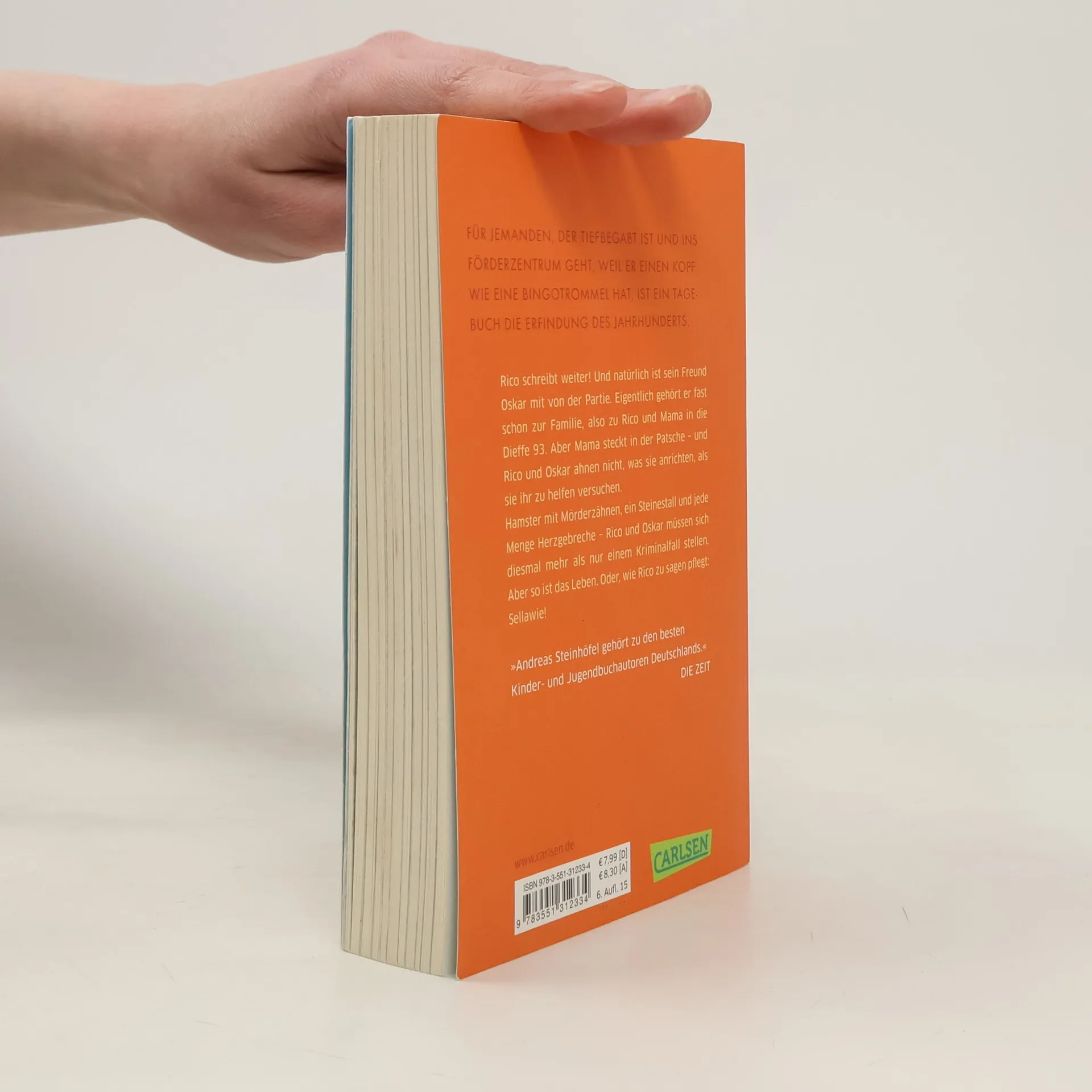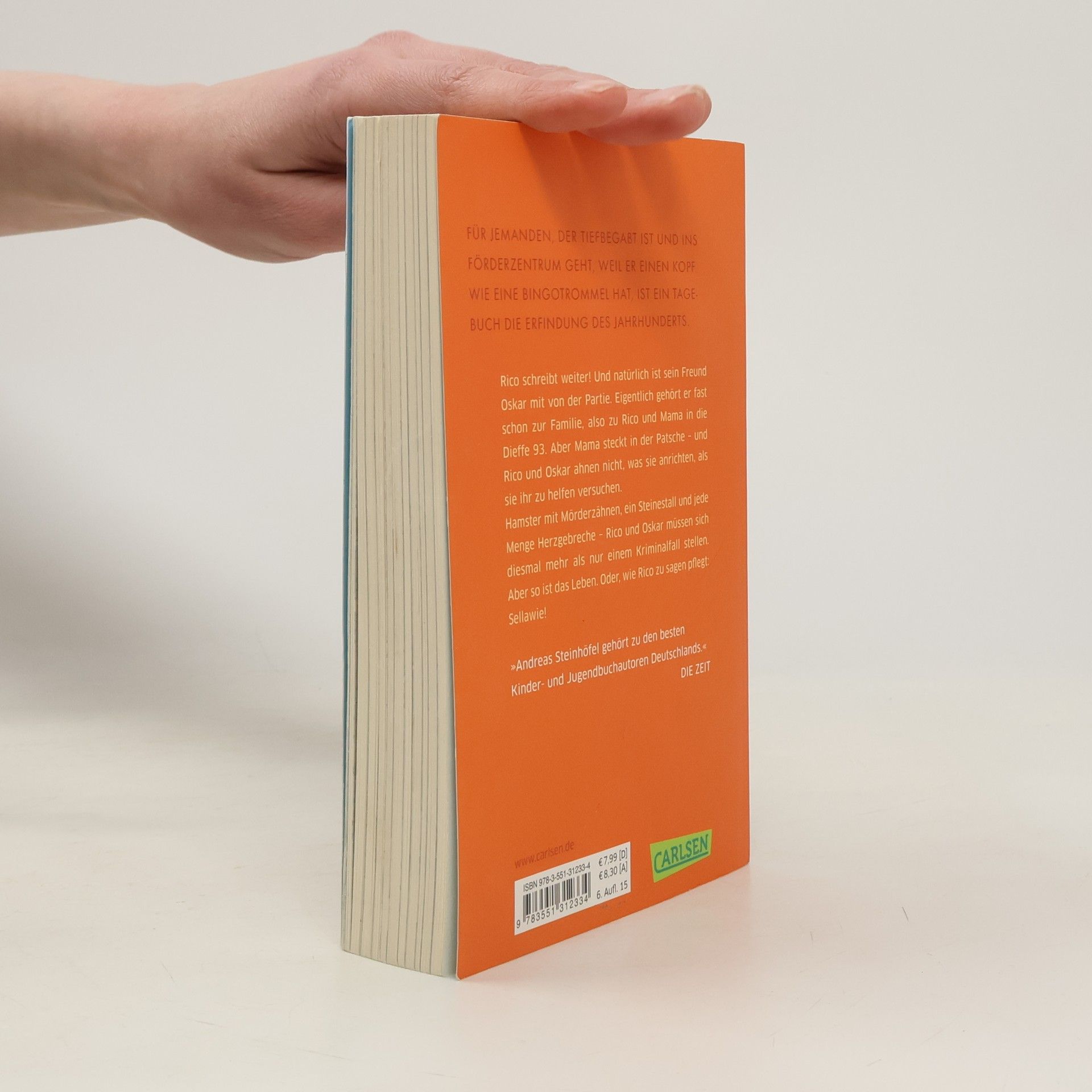 Rico schreibt weiter! Und natürlich ist sein Freund Oskar mit von der Partie. Eigentlich gehört er fast schon zur Familie, also zu Rico und Mama in die Dieffe 93. Aber Mama steckt in der Patsche – und Rico und Oskar ahnen nicht, was sie anrichten, als sie ihr zu helfen versuchen. Hamster mit Mörderzähnen, ein Steinestall und jede Menge Herzgebreche – Rico und Oskar müssen sich diesmal mehr als nur einem Krimifall stellen. Aber so ist das Leben. Oder, wie Rico zu sagen pflegt: Sellawie! Alle Bücher über Rico und Oskar: Rico, Oskar und die Tieferschatten (Band 1)Rico, Oskar und das Herzgebreche (Band 2)Rico, Oskar und der Diebstahlstein (Band 3)Rico, Oskar und das Vomhimmelhoch (Band 4) Kindercomics:Rico & Oskar – Fische aus Silber Rico & Oskar – Die RegenhütteRico & Oskar – Die perfekte ArschbombeRico & Oskar – Die Sache mit den Öhrchen