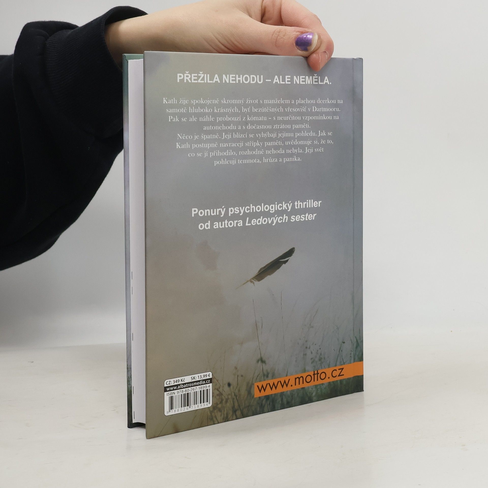 Přežila nehodu – ale neměla. Ponurý psychologický thriller od autora Ledových sester Kath žije spokojený skromný život s manželem a plachou dcerkou na samotě hluboko krásných, byť bezútěšných vřesovišť v Dartmooru. Pak se ale náhle probouzí z kómatu – s neurčitou vzpomínkou na autonehodu a s dočasnou ztrátou paměti. Něco je špatně. Její blízcí jí nepohlédnou do očí. Jak se Kath postupně navracejí střípky paměti, uvědomuje si, že to, co se jí přihodilo, rozhodně nehoda nebyla. Její svět pohlcují temnota, hrůza a panika.