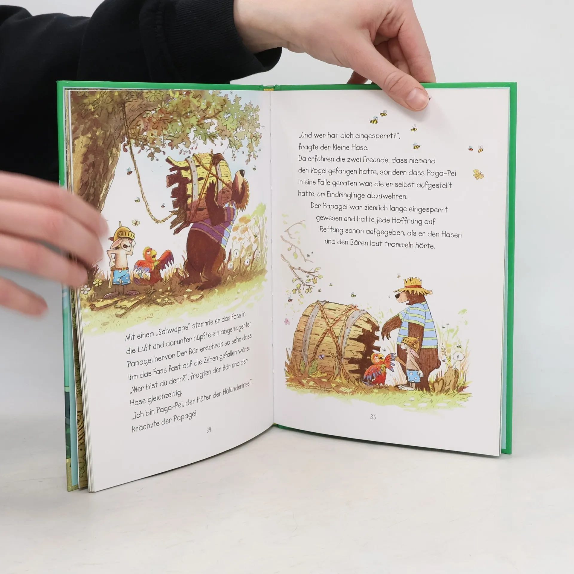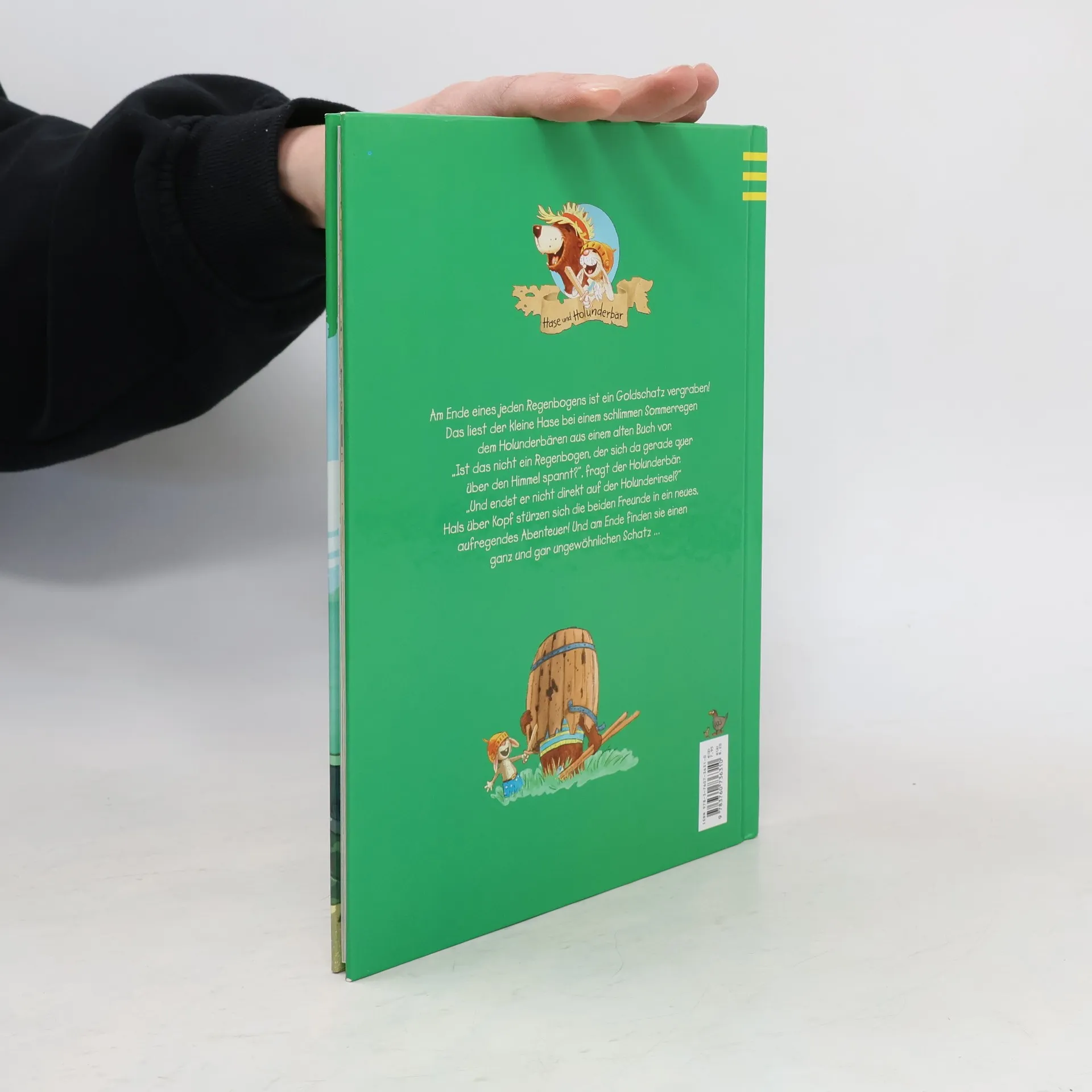 Eine Bilderbuch-Geschichte von Hase und Holunderbär, die zum Vorlesen und Lesen lernen einlädt! Voller Spannung, Einfallsreichtum und Witz, stehen Freundschaft und Hilfsbereitschaft im Mittelpunkt. Am Ende jedes Regenbogens liegt ein Goldschatz, den es zu finden gilt! Nach einem heftigen Sommerregen entdecken Hase und Holunderbär einen Regenbogen, der auf der Holunderinsel endet, und machen sich mit ihrem Boot auf die Schatzsuche. Doch die beiden Freunde erleben zunächst eine herbe Enttäuschung: Statt eines Schatzes finden sie nur Blechbüchsen, alte Flaschen und viel Erde. Zu allem Überfluss ist auch noch ihr Boot verschwunden, und die Nacht auf der dunklen, unheimlichen Insel bricht an. Glücklicherweise kennt der kleine Hase viele Pfadfindertricks, mit denen er eine Laubhütte baut und ein wärmendes Feuer entfacht. Am nächsten Morgen erwartet sie eine große Überraschung: Ein geheimnisvolles Klopfen und Trommeln ertönt aus dem Wald, und eine Stimme ist zu hören… Die mitreißende Schatzsuchergeschichte endet überraschend und zeigt, dass wahre Freundschaft mehr wert ist als jeder Goldschatz. Ideal für alle Fans von Hase und Holunderbär, zum Vor- und Selberlesen für Kinder ab sechs Jahren und jung gebliebene Erwachsene.