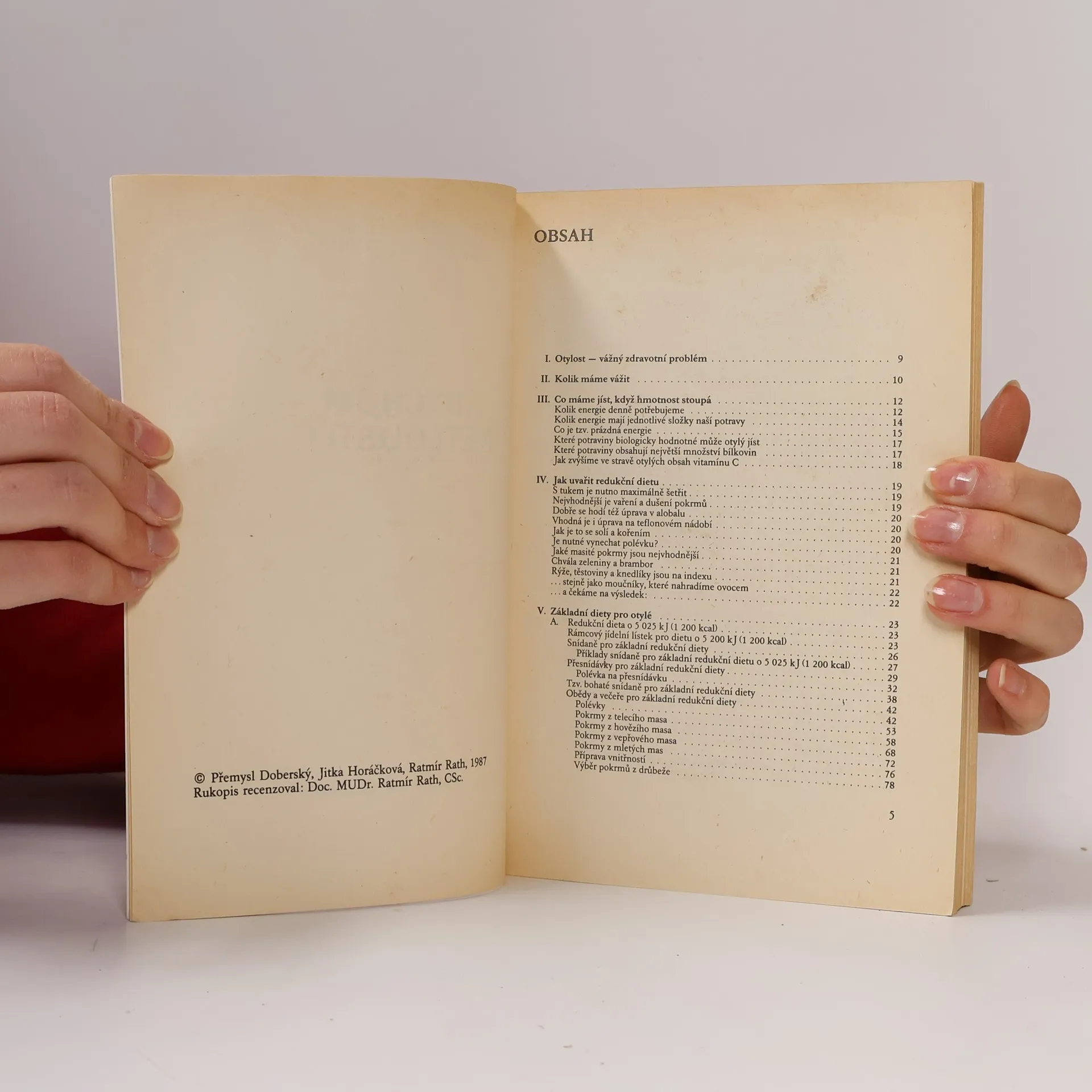 Rady a předpisy, jak bojovat proti otylosti, obsahují vedle obecností základní diety pro otylé, jídelníčky pro ovocné a zeleninové odlehčovací dny, dietní návody pro ostré redukční režimy, pro mírný odtučňovací průběh i pouze pro udržení váhy a všímají si celkového životního stylu. Připojena je tabulka kalorických a biologických hodnot hlavních potravin a nápojů. 4. vydání.
