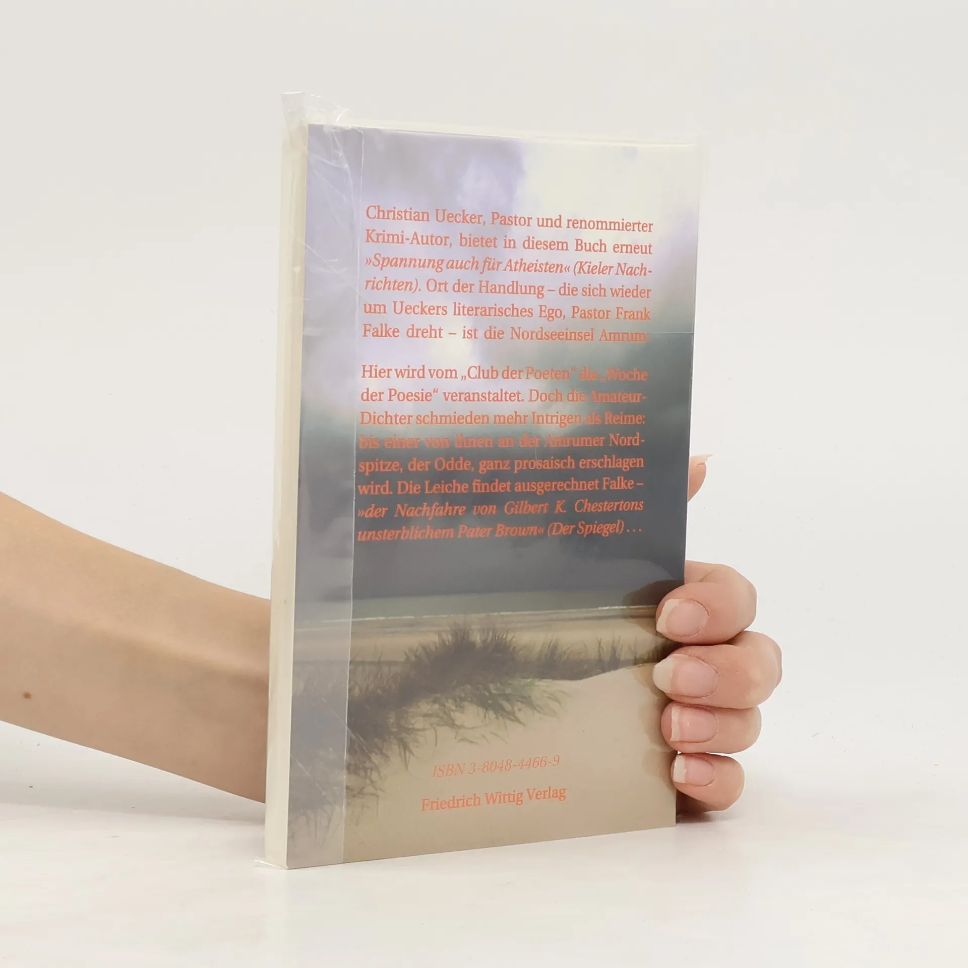 Ort der Handlung - die sich wieder um Ueckers literarisches Ego, Pastor Frank Falke dreht - ist die Nordseeinsel Amrum: Hier wird vom „Cub der Poeten“ die „Woche der Poesie“ veranstaltet. Doch die Amateurdichter schmieden mehr Intriegen als Reime: Bis einer von ihnen an der Amrumer Nordspitze, der Odde, ganz prosaisch erschlagen wird. Die Leiche findet ausgerechnet Falke - „der Nachfahre von Gilbert K. Chestertons unsterblichem Pater Brown“ (Der Spiegel)