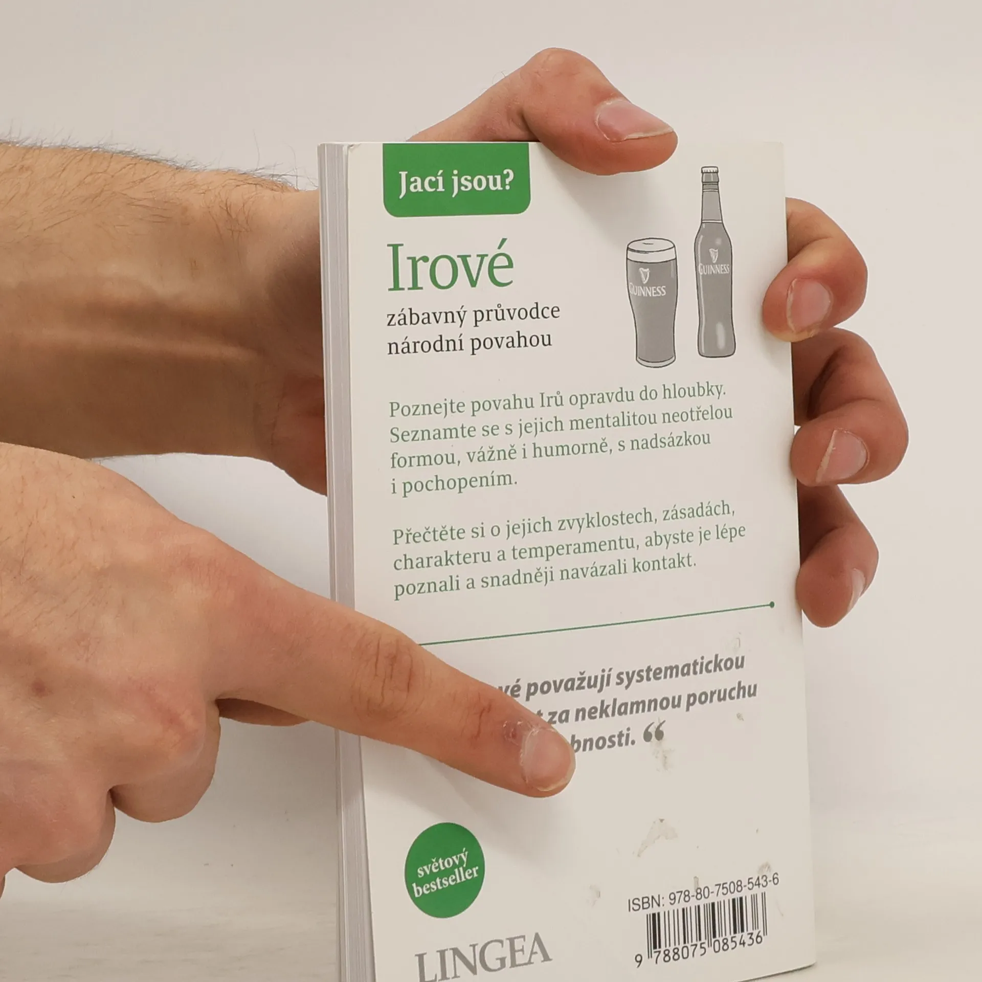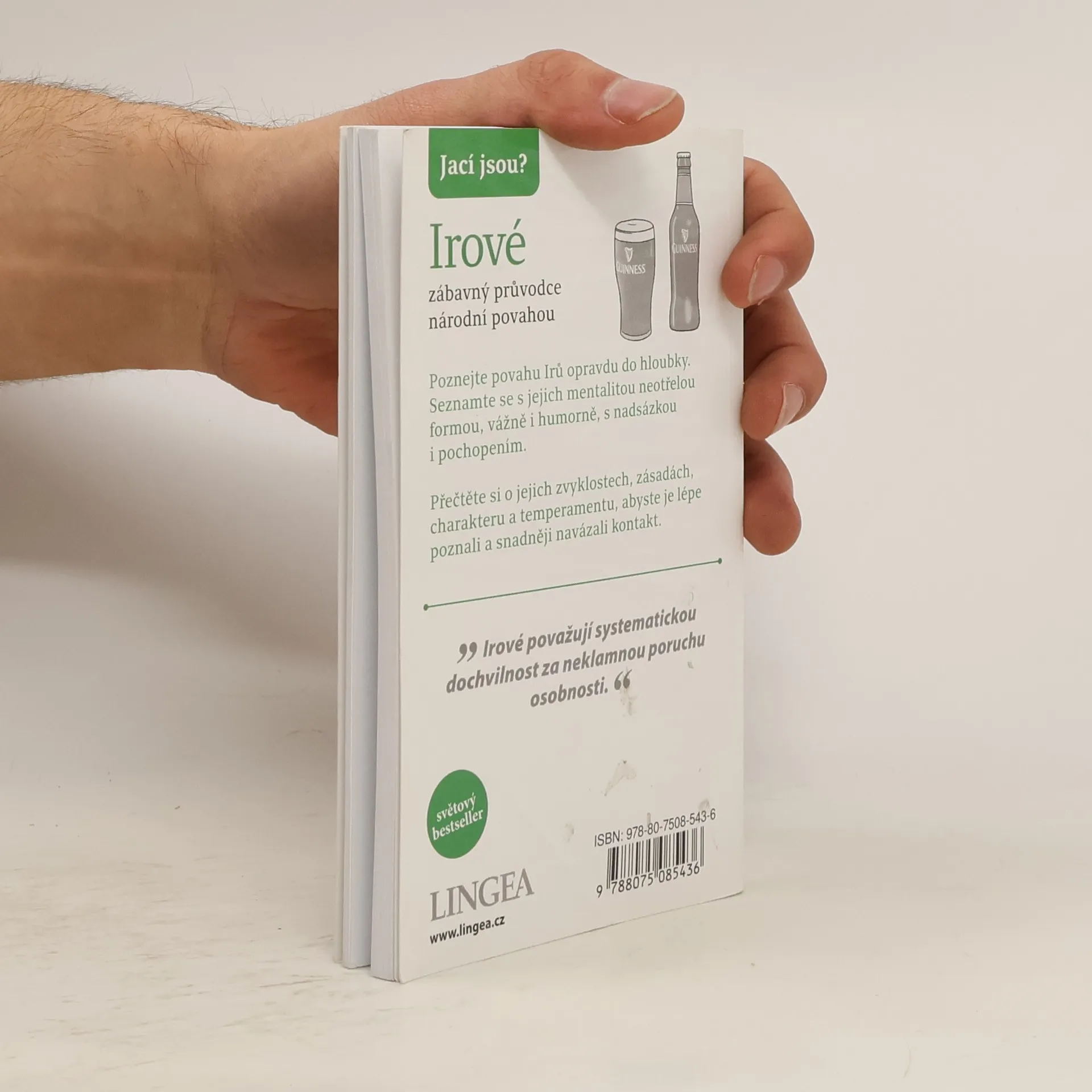 Lidé často mají stereotypní představu o Irech jako o ohnivých zrzounech, kteří se snadno rozčílí. Typický Ir však bývá hnědovlasý a modrooký, a i když jsou potomky Keltů, dnešní Irové by si dobře rozmysleli, než by se pustili do akce bez oblečení. Rádi se považují za vyrovnané osoby s silným vztahem k půdě a lhostejností k materiálním statkům. Irové mají šarm a jsou výřeční, což může souviset s jejich životem na osamělém ostrově. Milují barvité obraty a často přehánějí, což se odráží i v jejich literatuře, za kterou získali čtyři Nobelovy ceny. V zemi s málo posluchači se lidé snadno uchýlí k samomluvě, což může vést k psaní. Irský jazyk dodává angličtině vřelost. Dopravní značení v Irsku odráží každodenní mluvu, a často není cílem poskytnout jasné informace. V některých oblastech se zdá, že značky jsou navrženy tak, aby zmatek zůstával. Irové se považují za šťastlivce, přestože jejich historie je plná války, hladomoru a emigrace. „Irské štěstí“ se stalo synonymem pro přízeň osudu, ačkoli původně mohlo být myšleno sarkasticky. Irové se rádi baví, popíjejí, zpívají a tančí, a irská hospoda je známým symbolem jejich kultury.