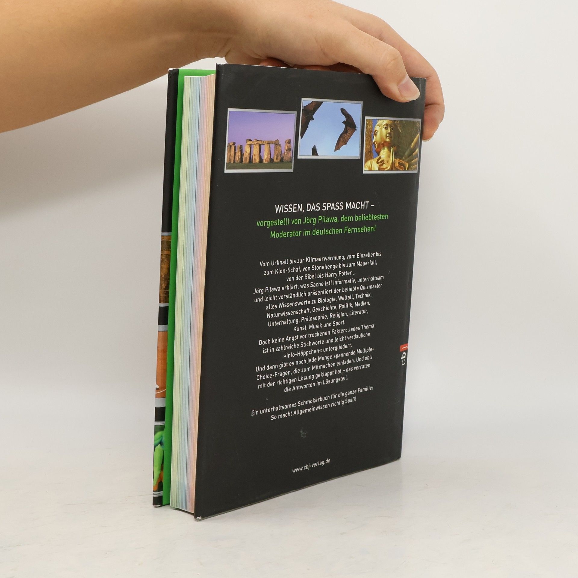Wissen, das Spaß macht - vorgestellt von Jörg Pilawa Von Stonehenge bis zum Mauerfall, vom Dalai Lama bis zum Papst, von der Entstehung des Menschen bis zur Erfindung der Dampfmaschine. Jörg Pilawa erklärt, was Sache ist! Informativ und leicht verständlich präsentiert der beliebte Quizmaster alles Wissenswerte zu Biologie, Technik, Weltall, Geschichte, Philosophie, Politik, Musik, Literatur, Medien und Sport. Doch keine Angst vor trockenen Fakten: Zu jedem Thema gibt es spannende Multiple-Choice-Quizfragen, die zum Mitmachen einladen - und ob's mit der richtigen Lösung geklappt hat, das verraten gleich darauf die verblüffenden Antworten. Ein unterhaltsames Schmökerbuch für die ganze Familie: So macht Allgemeinwissen endlich Spaß!
