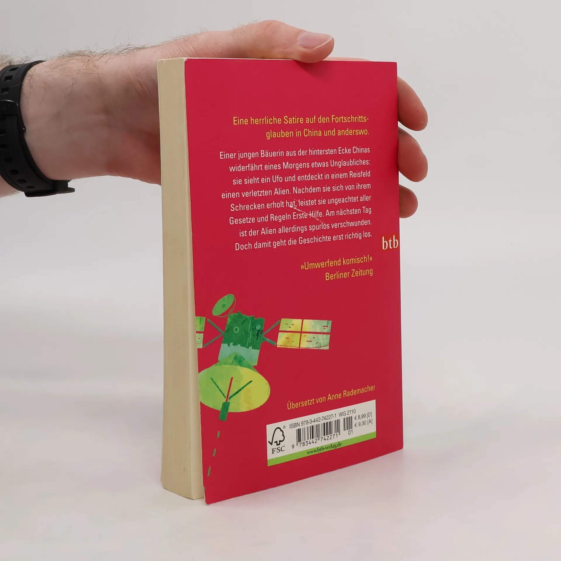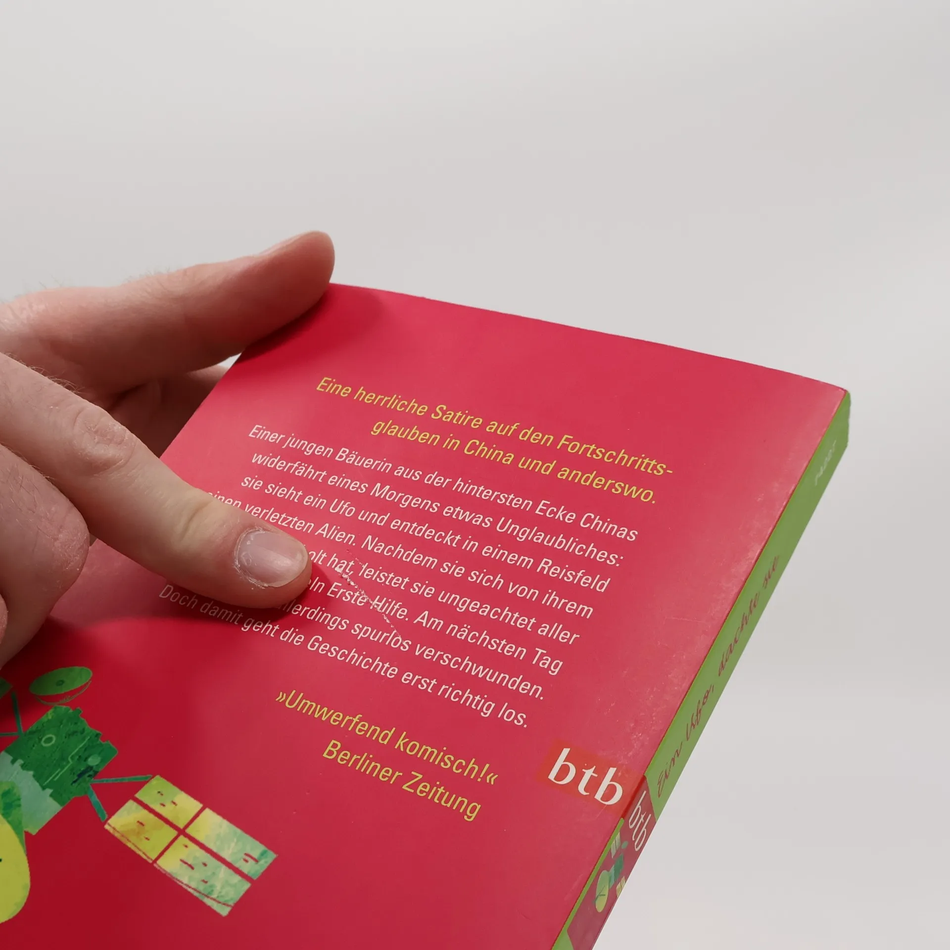 Eine herrliche Satire auf den Fortschrittsglauben in China und anderswo. Eine junge Bäuerin aus der hintersten Ecke Chinas widerfährt eines Morgens etwas Unglaubliches: Sie sieht ein Ufo und entdeckt in einem Reisfeld einen verletzten Alien. Nachdem sie sich von ihrem Schrecken erholt hat, leistet sie ungeachtet aller Gesetze und Regeln Erste Hilfe. Am nächsten Tag ist der Alien allerdings spurlos verschwunden. Doch damit geht die Geschichte erst richtig los.