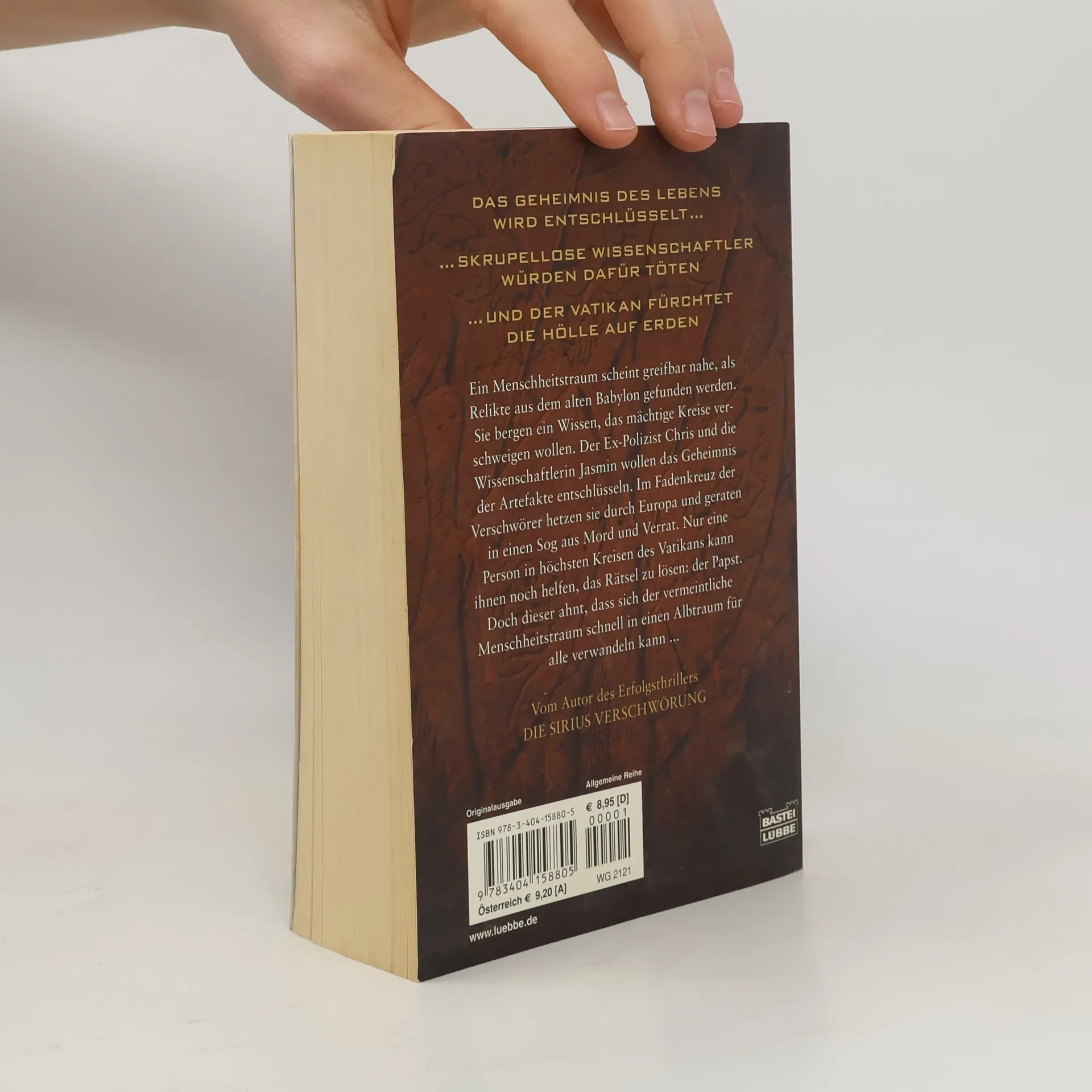 Das Geheimnis des Lebens wird entschlüsselt ... skupellose Wissenschaftler würden dafür töten ... und der Vatikan fürchtet die Hölle auf Erden. Ein Menschheitstraum scheint greifbar nahe, als Relikte aus dem alten Babylon gefunden werden. Sie bergen ein Wissen, das mächtige Kreise verschweigen wollen. Der Ex-Polizist Chris und die Wissenschaftlerin Jasmin wollen das Geheimnis der Artefakte entschlüsseln. Im Fadenkreuz der Verschwörer hetzen sie durch Europa und geraten in einen Sog aus Mord und Verrat. Nur eine Person in höchsten Kreisen des Vatikans kann ihnen noch helfen, das Rätsel zu lösen: der Papst. Doch dieser ahnt, dass sich der vermeintliche Menschheitstraum schnell in einen Albtraum für alle verwandeln kann ...