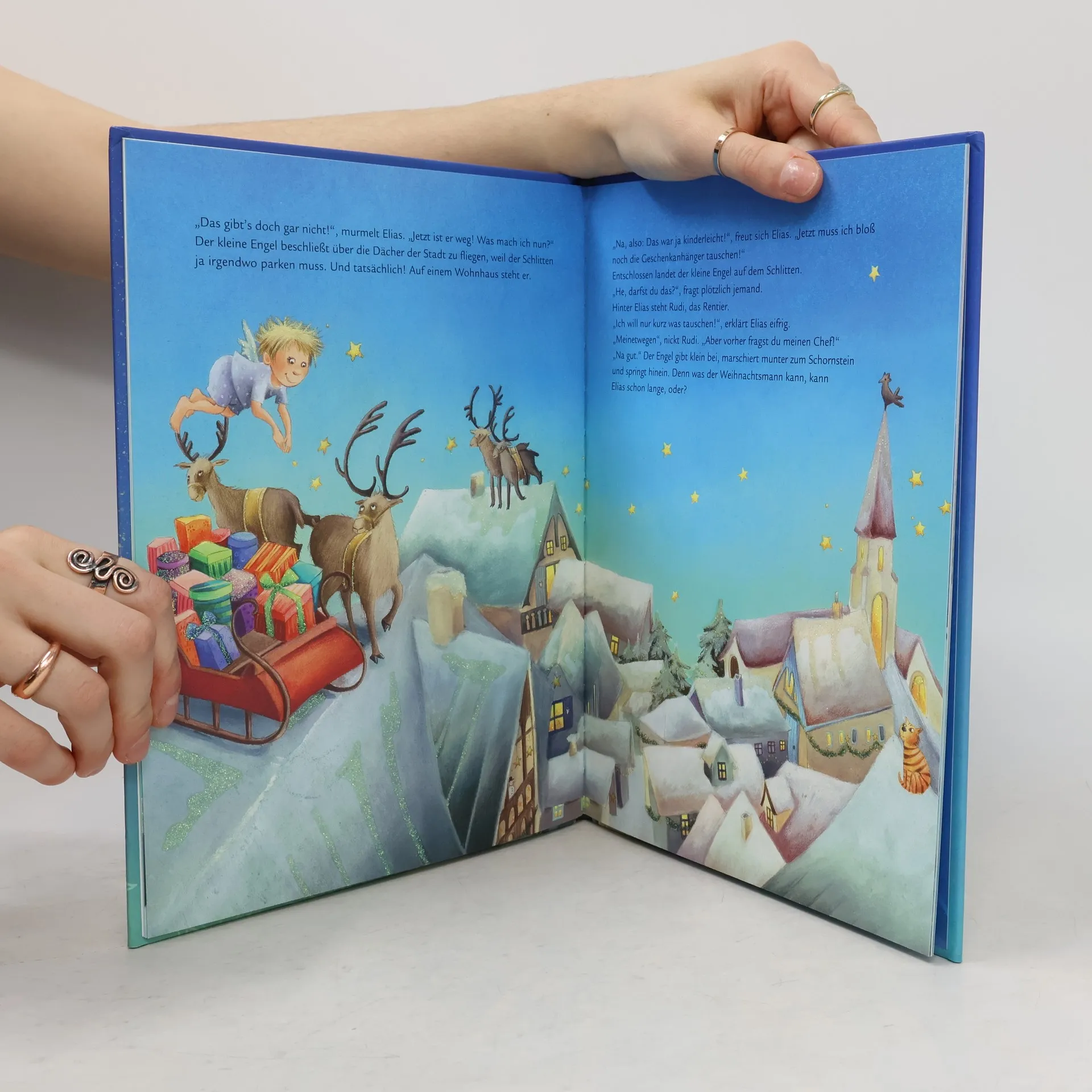 Der Weihnachtsmann ist schon längst auf dem Weg zur Erde, als Engelchen Marie bemerkt, dass sie zwei Weihnachtsgeschenke vertauscht hat. Nun bekommt Opa Emil eine Autorennbahn und die kleine Luisa eine Tabakspfeife! Doch kein Problem für Engel Elias: Kurz entschlossen startet er zu einem weiteren unerlaubten Erdeneinsatz. Das Schlittengespann des Weihnachtsmannes einzuholen ist allerdings gar nicht so einfach und auch sonst geht so einiges schief. Ob Elias es schafft, die Geschenke noch rechtzeitig vor der Bescherung zu tauschen?