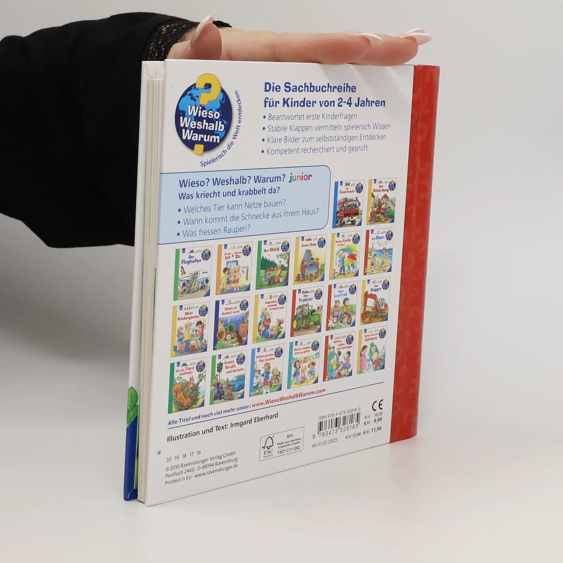 Im Garten, auf der Wiese, im Wald – überall kriecht und krabbelt es! Mit naturgetreuen Bildern und spannenden Klappen entdecken Kinder hier die interessantesten Insekten, Spinnentiere und Schnecken aus nächster Nähe. Kurze Sachtexte erklären, was es rund um die kleinen Kriech- und Krabbeltiere zu wissen gibt: Wo verkriechen sich Regenwürmer und was hat eine Raupe mit einem Schmetterling zu tun? Öffne die Klappe und finde raus, wer sich in der Mohnblüte versteckt! Wieso? Weshalb? Warum? junior Die Sachbuchreihe für Kinder von 2-4 Jahren Jeden Tag entdecken Kinder etwas Neues – und haben viele Fragen. Wann kommt die Feuerwehr? Was machen die Tiere im Winter? Warum muss ich Zähne putzen? Die beliebte Sachbuchreihe Wieso? Weshalb? Warum? junior beantwortet die Fragen der Kinder auf Augenhöhe. Sie beleuchtet unterschiedlichste Themen aus ihrer Alltags- und Interessenswelt altersgerecht und mit viel Liebe zum Detail. Die Reihe ist speziell auf kleine Hände und die Bedürfnisse der Kleinsten angepasst. Klare und liebevolle Bilder, kurze Sachtexte sowie handliche Klappen, die Bewegungen veranschaulichen und überraschende und lustige Einblicke gewähren, ermöglichen Kindern, sich ihre Themen selbst zu erschließen. Der Spaß am eigenhändigen Entdecken, die liebevolle Umsetzung und die hochwertige Ausstattung garantieren langanhaltende Freude an jedem Buch.