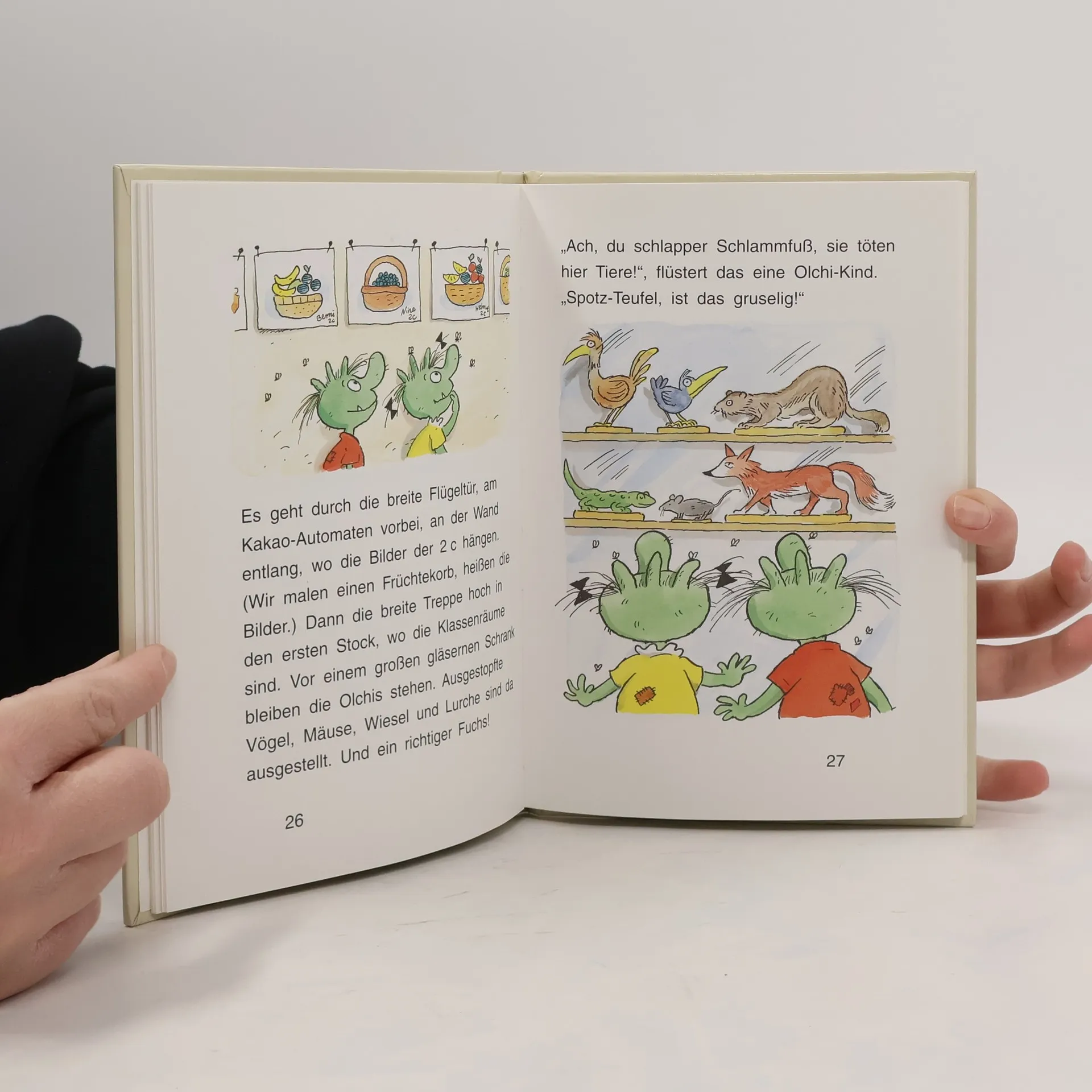 Was Olchi-Opa in seiner Jugend konnte, können Olchi-Kinder von heute schon lange, Ratten-Schwanz-und-Kröten-Furz! Also satteln sie den Reisedrachen und ab geht die Post. Nicht nach Australien, wie damals bei Olchi-Opa, sondern nur in die Grundschule von Schlamperhofen. Aber was die Olchi-Kinder da mit den Menschen-Kindern erleben - und die Menschen-Kinder mit den Olchi-Kindern -, ist mindestens genauso aufregend wie Olchi-Opas Abenteuer mit den Kängurus.