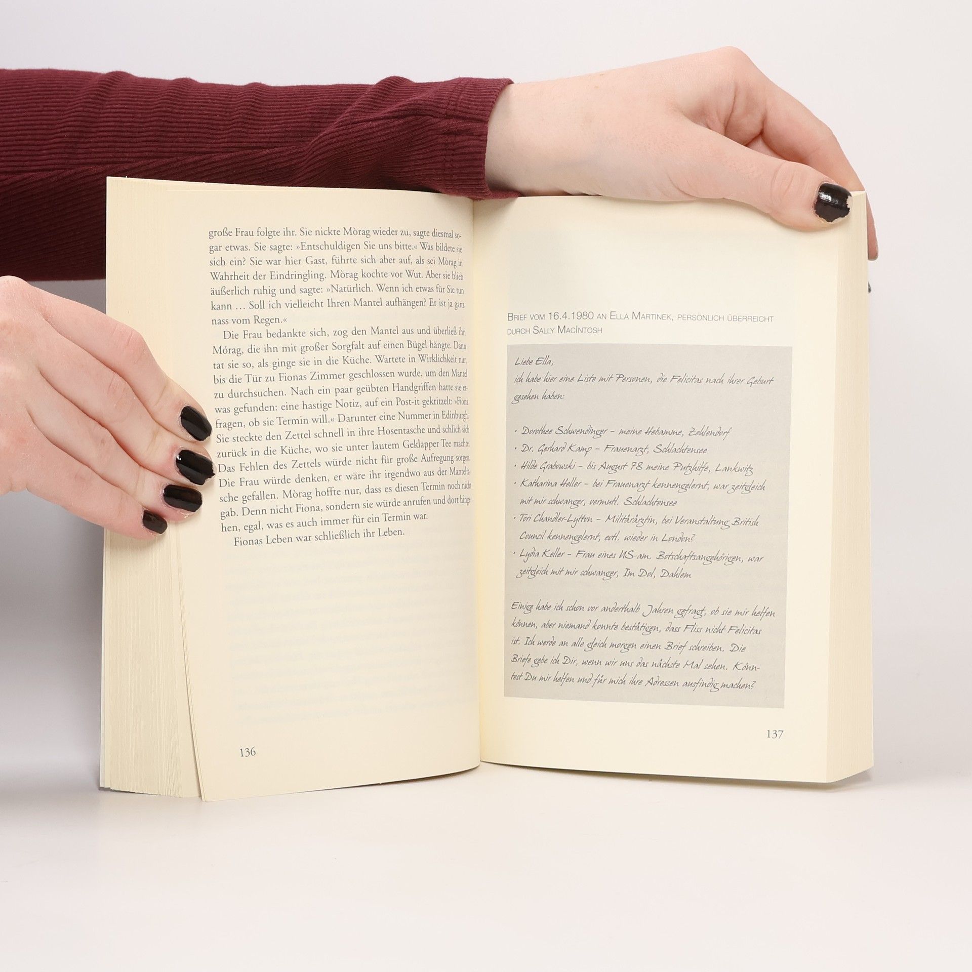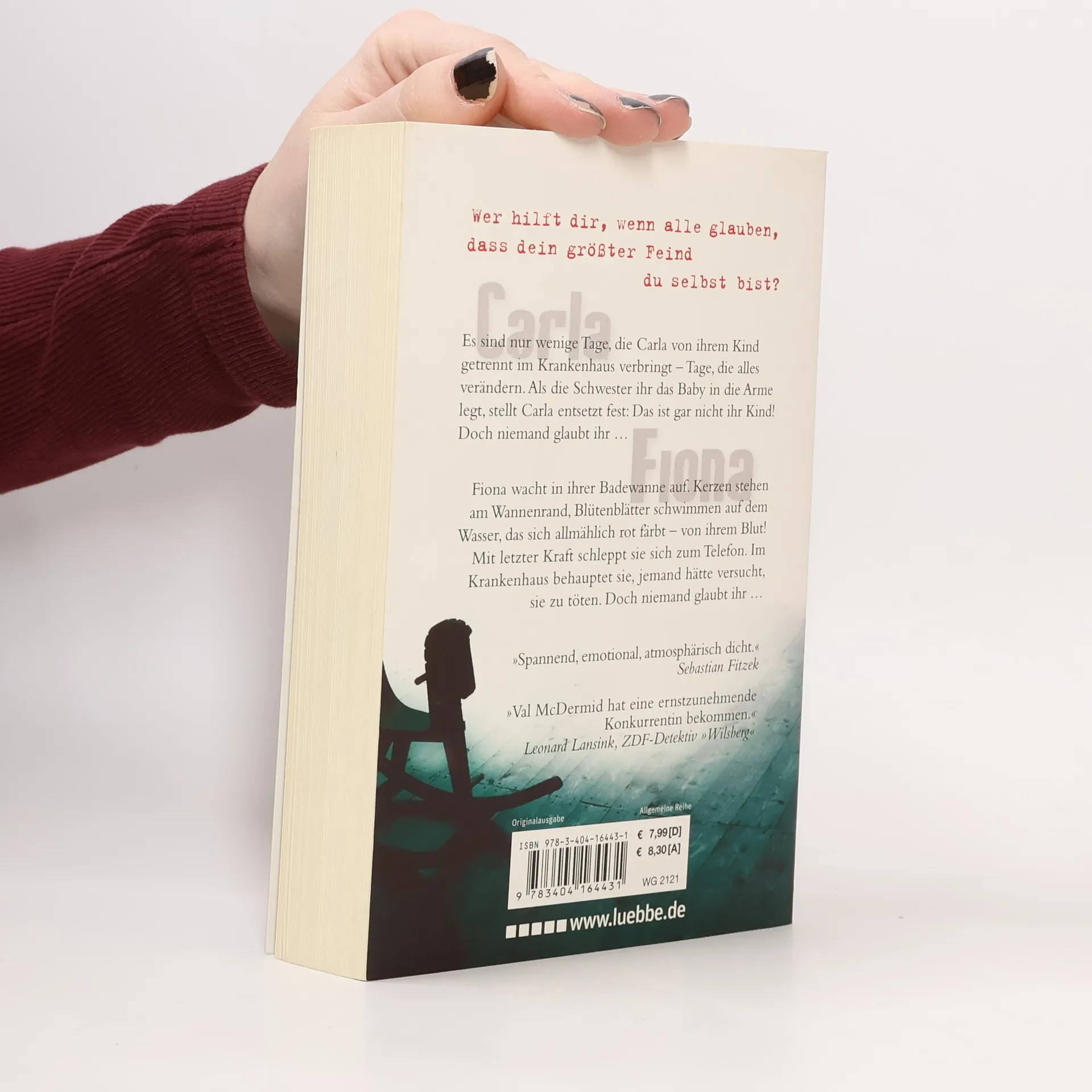 Carla Es sind nur wenige Tage, die Carla von ihrem Kind getrennt im Krankenhaus verbringt – Tage, die alles verändern. Als die Schwester ihr das Baby in die Arme legt, stellt Carla entsetzt fest: Das ist gar nicht ihr Kind! Doch niemand glaubt ihr … Fiona Fiona wacht in ihrer Badewanne auf. Kerzen stehen am Wannenrand, Blütenblätter schwimmen auf dem Wasser, das sich allmählich rot färbt – von ihrem Blut! Mit letzter Kraft schleppt sie sich zum Telefon. Im Krankenhaus behauptet sie, jemand hätte versucht, sie zu töten. Doch niemand glaubt ihr …