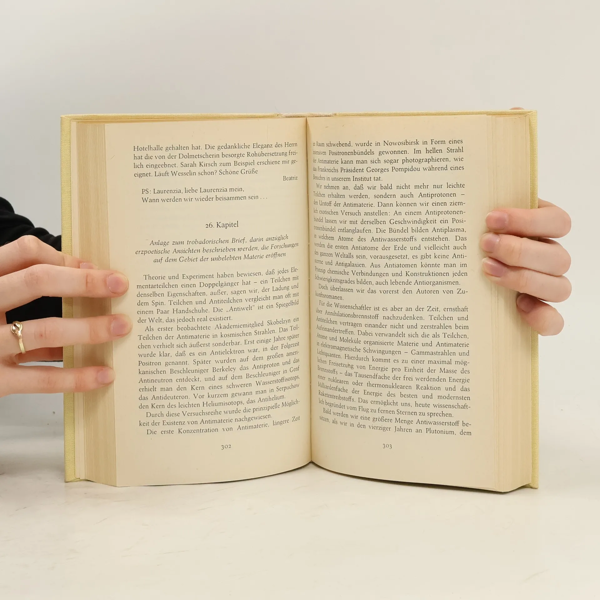 Diese Ausgabe hat keine ISBN. Wer möchte nicht erfahren, wie die Welt in ein-, zwei- oder achthundert Jahren aussieht, aus Neugier und aus Lust am Ungewissen? Doch nicht nur heute, auch vor Zeiten spürte man wohl diesen Kitzel der Phantasie. Wenn nun – so sagt Irmtraud Morgner – Beatriz de Dia, geboren 1130 in der Provence, Frau des Guilhem de Poitiers, nach achthundert-jährigem Zauberschlaf erwacht wäre, um die Gegenwart zu prüfen? Mit der Schwägerin Melusine und deren mächtigen göttlichen Verwandten im Bunde könnte sie zum Beispiel als Illusionistin im Zirkus auftreten oder gedankenschnell auf dem Rücken einer Sphinx von Erfurt nach Berlin fliegen, aber sie wäre auch Testperson; sie blickte vom Anfang des Jahrtausends her auf unsere Zeit: auf ihre Heimat Frankreich oder auf das von Touristen überschwemmte Italien und auf das "gelobte Land" zwischen Elbe und Oder... Ein Wunder also? Irmtraud Morgner läßt's geschehen; sie schickt die auferstandne Trobadora Beatriz sozusagen auf Aventüre: phantasievolles Spiel, märchenhaft und wirklichkeitsnah zugleich. Dabei zeigt sich, daß es im "gelobten Land" unter den Salmans, Pakulats, Kantus', Parnitzkes, den Zimmerleuten, Physikern, Ingenieuren, Journalisten, wunderbar, weil vernünftig zugeht. Es ist ein frauenfreundliches Land – freilich: weibliche Trobadors auch hier noch selten.