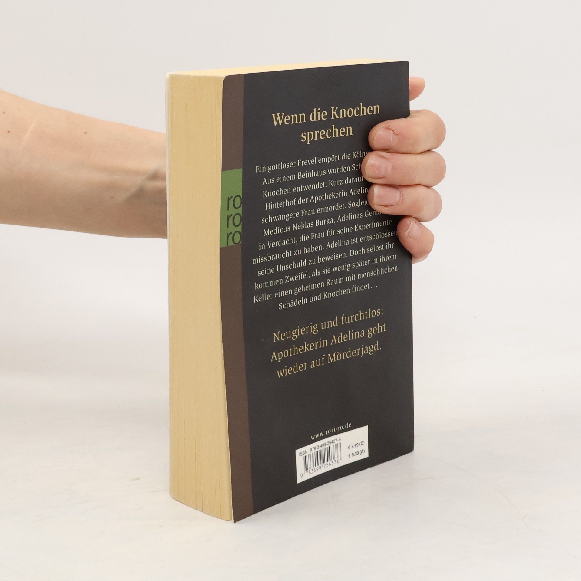 Wenn die Knochen sprechen. Ein gottloser Frevel empört die Kölner Bürger: Aus einem Beinhaus wurden Schädel und Knochen entwendet. Kurz darauf wird im Hinterhof der Apothekerin Adelina eine schwangere Frau ermordet. Sogleich gerät Medicus Neklas Burka, Adelinas Gemahl, in Verdacht, die Frau für seine Experimente missbraucht zu haben. Adelina ist entschlossen, seine Unschuld zu beweisen. Doch selbst ihr kommen Zweifel, als sie wenig später in ihrem Keller einen geheimen Raum mit menschlichen Schädeln und Knochen findet ... Neugierig und furchtlos: Apothekerin Adelina geht wieder auf Mörderjagd.