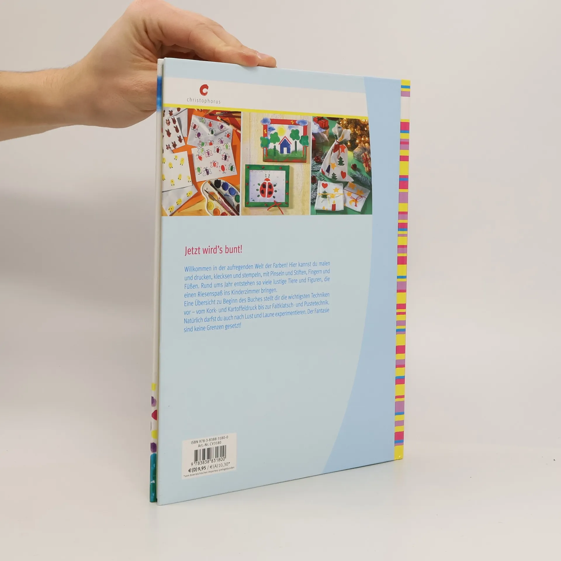Willkommen in der aufregenden Welt der Farben! Hier kannst du malen und drucken, klecksen und stempeln, mit Pinseln und Stiften, Fingern und Füßen. Rund ums Jahr entstehen so viele lustige Tiere und Figuren, die einen Riesenspaß ins Kinderzimmer bringen. Eine Übersicht zu Beginn des Buches stellt dir die wichtigsten Techniken vor – vom Kork- und Kartoffeldruck bis zur Faltklatsch- und Pustetechnik. Kleine Einfallspinsel dürfen nach Lust und Laune experimentieren. Der Fantasie sind keine Grenzen gesetzt!
