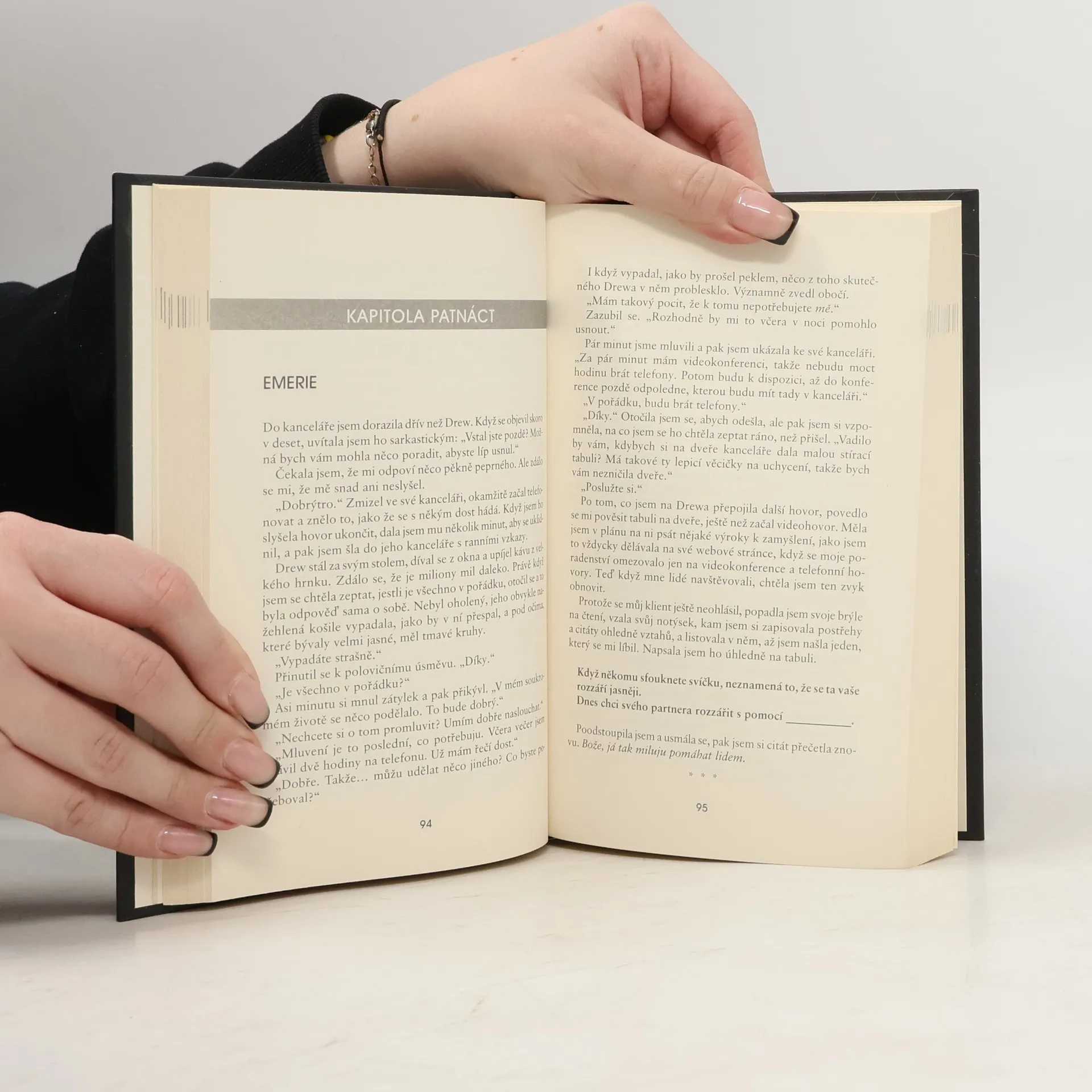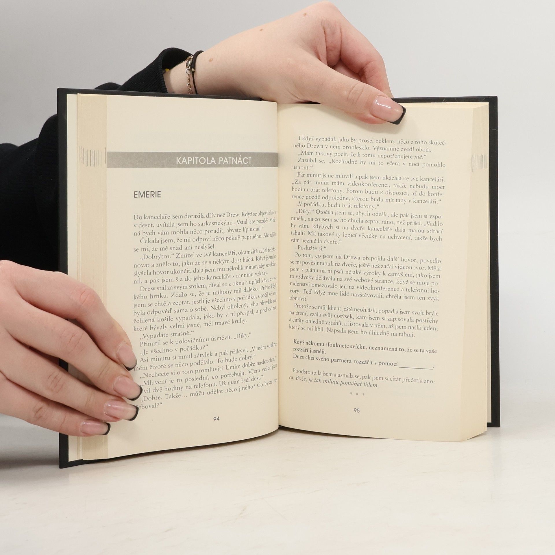 Tu noc, kdy Emerie poprvé potkala Drewa, myslela si, že se vloupal do její nové kanceláře na Park Avenue. Než stihla zavolat 911, ukázalo se, že tenhle arogantní a pekelně pohledný chlapík je skutečným majitelem kanceláře a ona jen naletěla podvodníkovi. Drew nečekal, že se bude po návratu z dovolené dohadovat s touhle temperamentní mladou ženou. Taky nečekal, že ji nebude moct dostat z hlavy. Zvlášť potom, co dovolil, aby v jeho kanceláři zůstala, než si najde něco jiného. Jak se velmi rychle ukazuje, ti dva by nemohli být rozdílnější. Zatímco Emerie zachraňuje lidem manželství, Drew je namyšlený lamač srdcí. Zatímco ona je zamilovaná do jiného, on se neplánuje zamilovat nikdy. To jediné, co je spojuje, je prostor jedné kanceláře a odzbrojující přitažlivost, která sílí každým dnem…