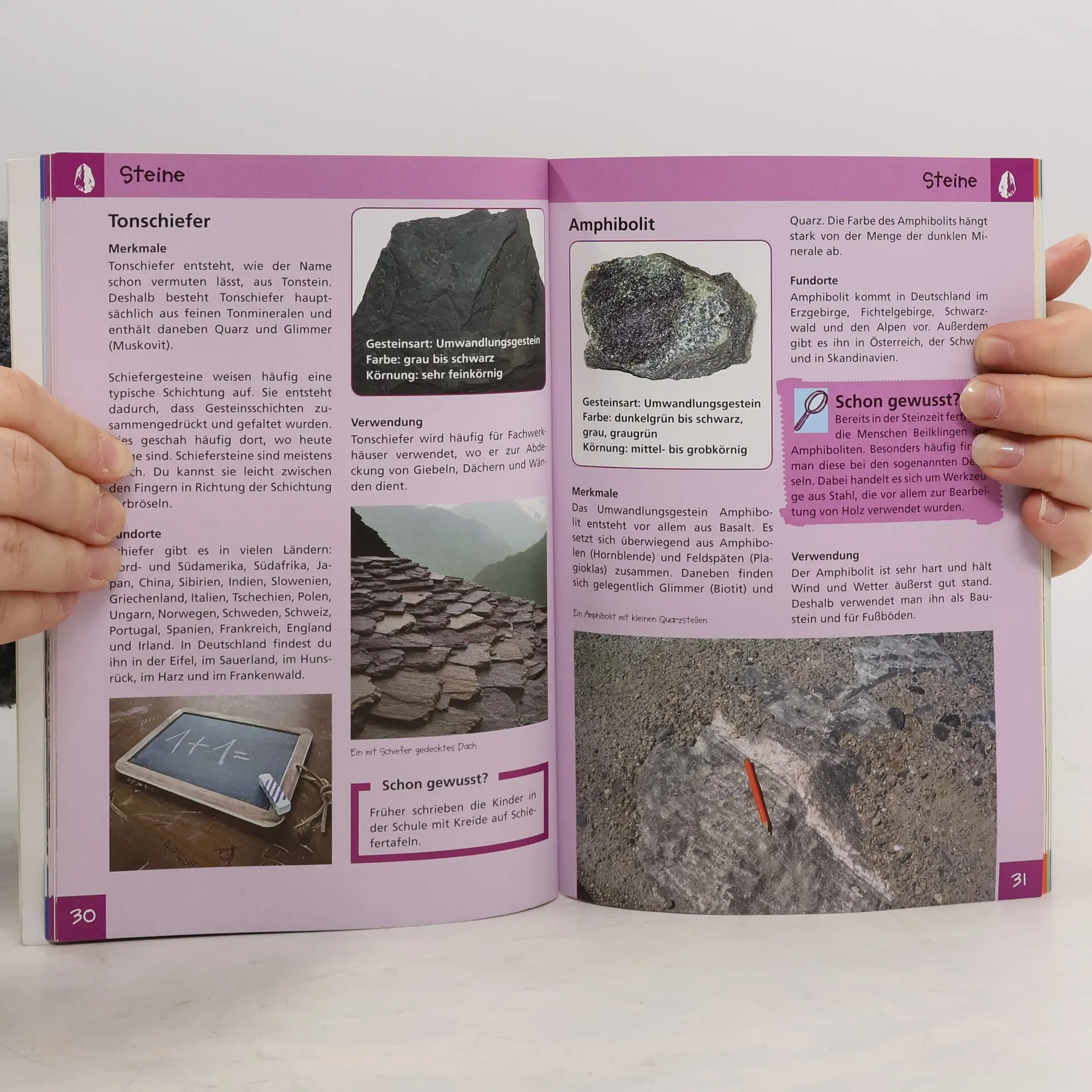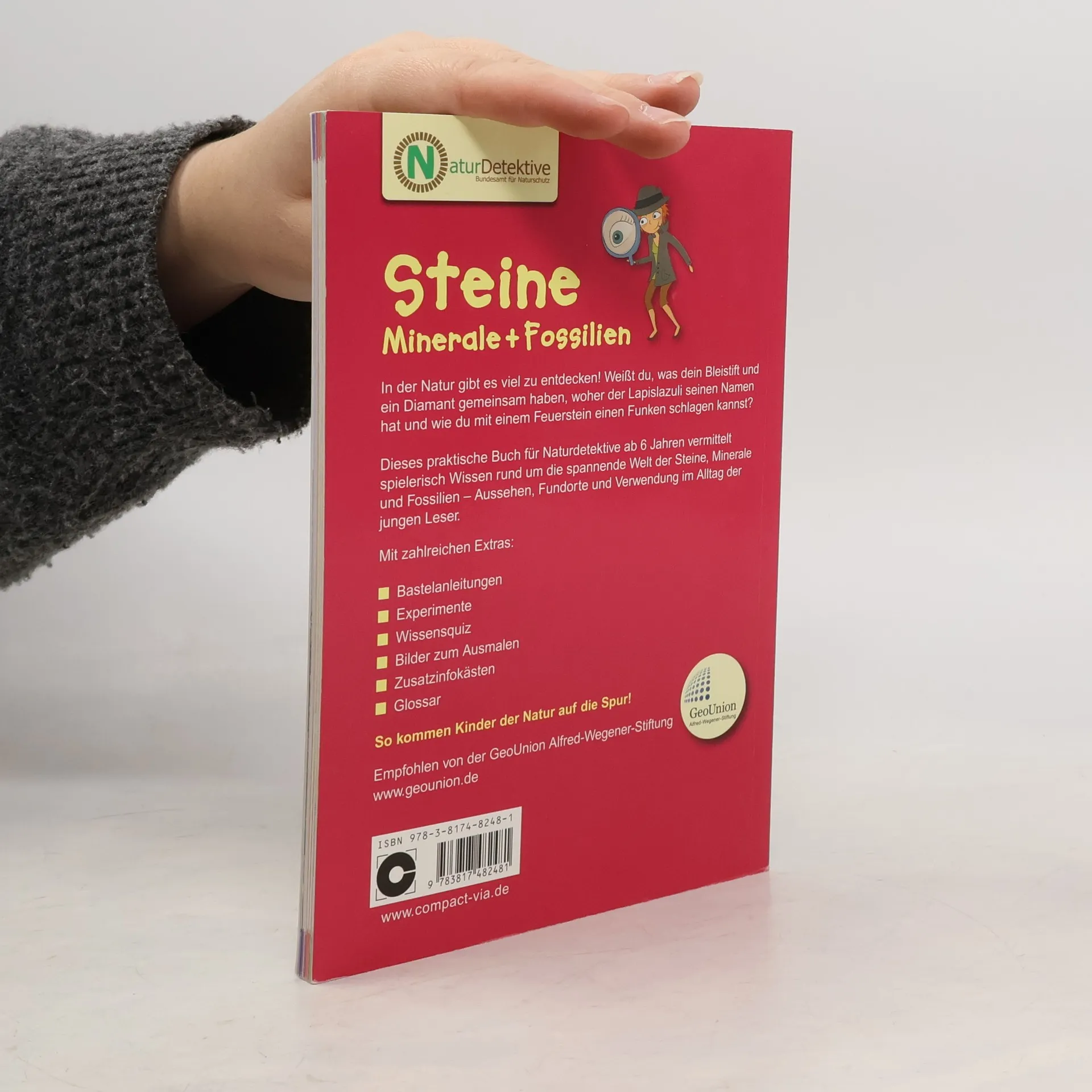Der Band Steine, Minerale & Fossilien für Naturdetektive ab sechs Jahren vermittelt spielerisch Wissen rund um die heimische Welt der Steine und Versteinerungen und hilft beim Entdecken und Bestimmen in direkter Umgebung der Kinder. Was haben eigentlich ein Bleistift und ein Diamant gemeinsam, woher hat der Lapislazuli seinen Namen und wie kann man mit einem Feuerstein einen Funken schlagen? Neben der Wissensvermittlung sind in dem Buch zahlreiche Beschäftigungselemente wie ein Quiz, Ausmalbilder, etc. So kommen Kinder der Natur auf die Spur! - zahlreiche heimische Stein, Mineral- und Fossilienarten übersichtlich dargestellt - Aussehen, Fundorte und Verwendung der Steine - kurze, informative Texte und viele Bilder - Beschäftigungsseiten mit Bastelanleitungen, Experimenten, Wissensquiz und Bildern zum Ausmalen - umfangreiches Stichwortverzeichnis - geprüft und empfohlen von GeoUnion, Alfred-Wegener-Stiftung