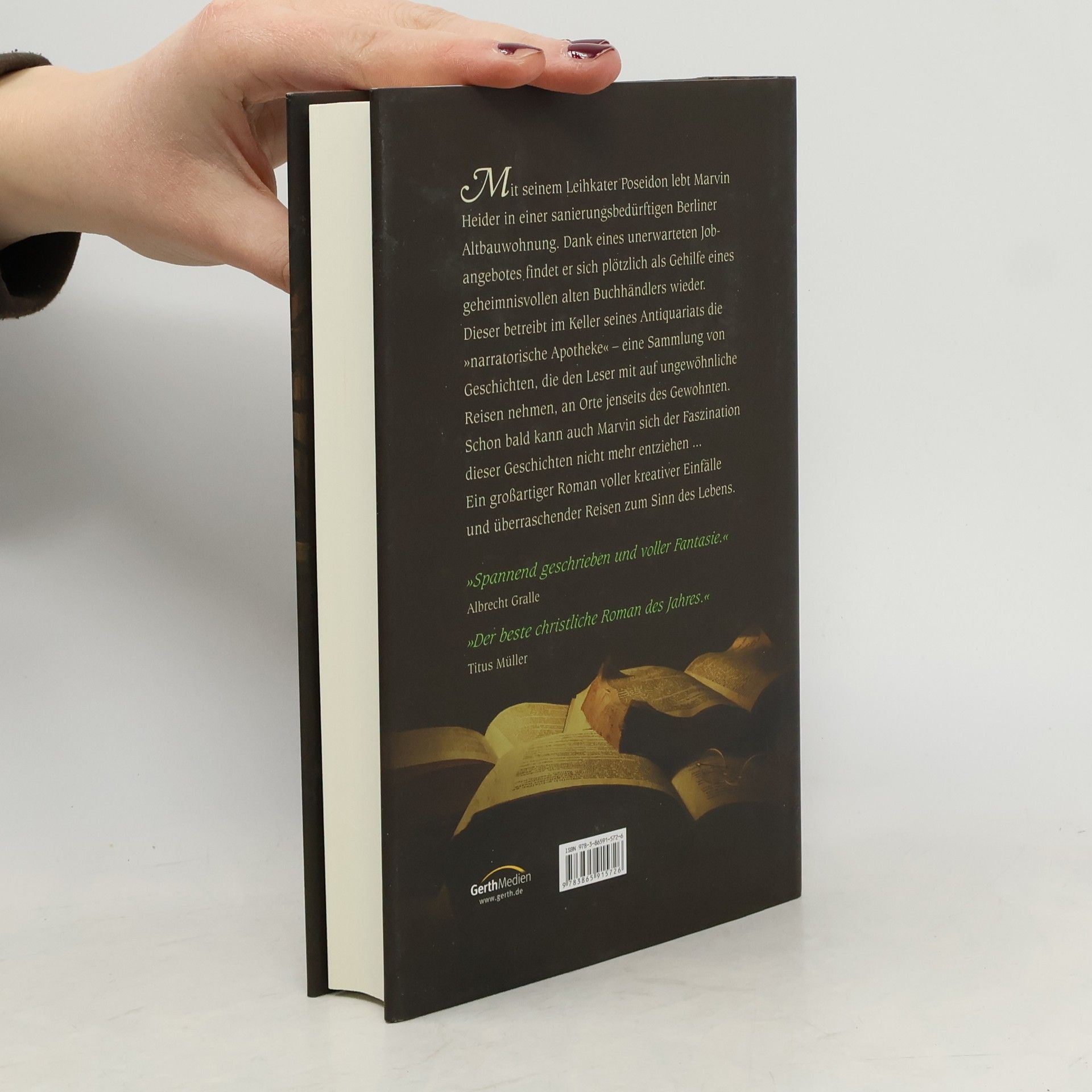 Mit seinem Leihkater Poseidon lebt Marvin Heider in einer sanierungsbedürftigen Berliner Altbauwohnung. Dank eines unerwarteten Jobangebotes findet er sich plötzlich als Gehilfe eines geheimnisvollen alten Buchhändlers wieder. Dieser betreibt im Keller seines Antiquariats die „narratorische Apotheke“ - eine Sammlung von Geschichten, die den Leser mit auf ungewöhnliche Reisen nehmen, an Orte jenseits des Gewohnten. Schon bald kann auch Marvin sich der Faszination dieser Geschichten nicht mehr entziehen ... Ein großartiger Roman voller kreativer Einfälle und überraschenden Reisen zum Sinn des Lebens.