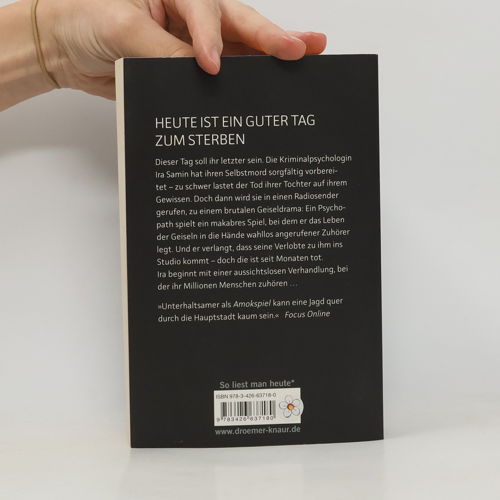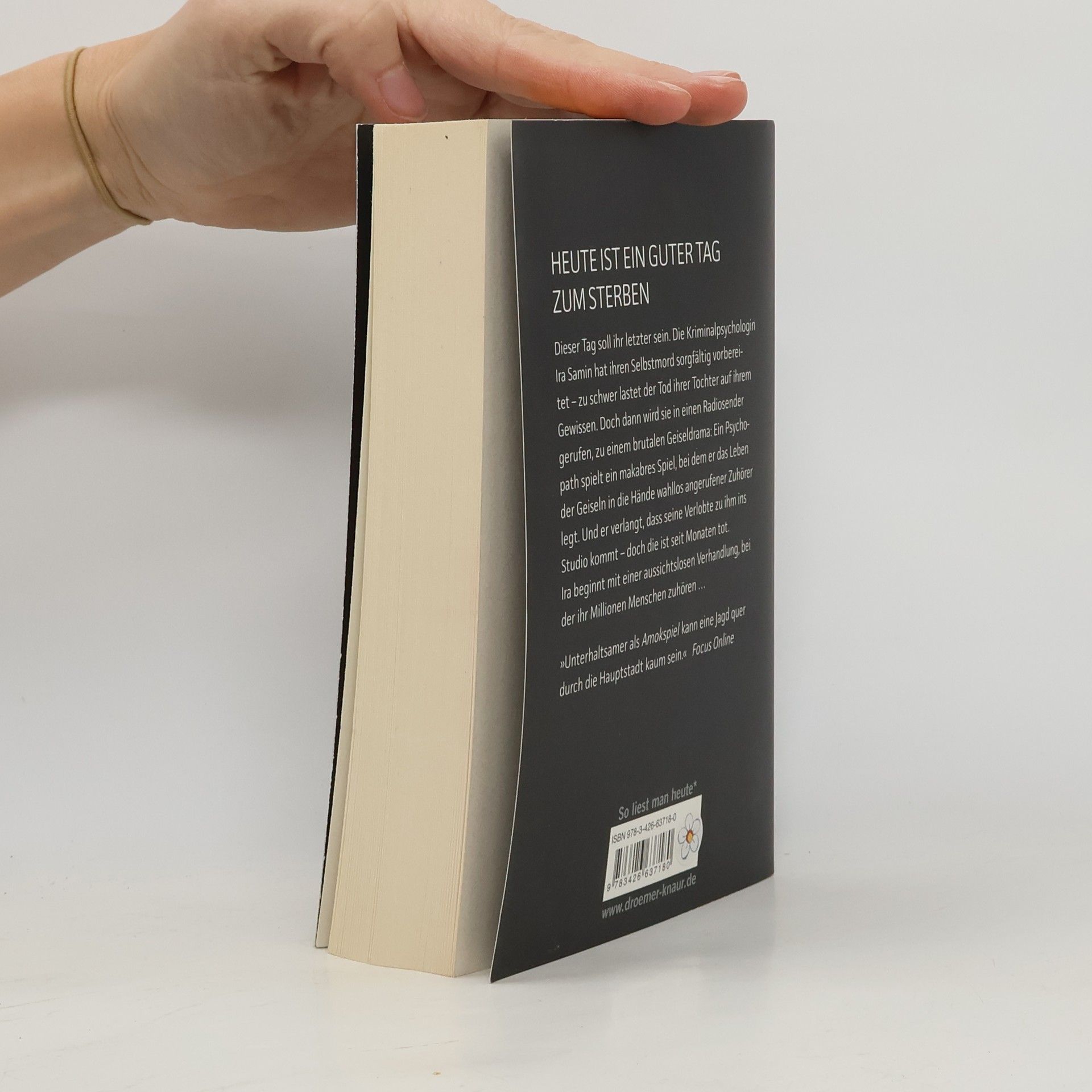 Heute ist ein guter Tag zum Sterben Dieser Tag soll ihr letzter sein. Die renommierte Kriminalpsychologin Ira Samin hat ihren Selbstmord sorgfältig vorbereitet. Zu schwer lastet der Tod ihrer ältesten Tochter auf ihrem Gewissen. Doch dann wird sie zu einem brutalen Geiseldrama in einem Radiosender gerufen. Ein Psychopath spielt ein makaberes Spiel: Bei laufender Sendung ruft er wahllos Menschen an. Melden die sich am Telefon mit einer bestimmten Parole, wird eine Geisel freigelassen. Wenn nicht, wird eine erschossen. Der Mann droht, so lange weiterzuspielen, bis seine Verlobte zu ihm ins Studio kommt. Doch die ist seit Monaten tot. Ira beginnt mit einer aussichtslosen Verhandlung, bei der ihr Millionen Menschen zuhören …