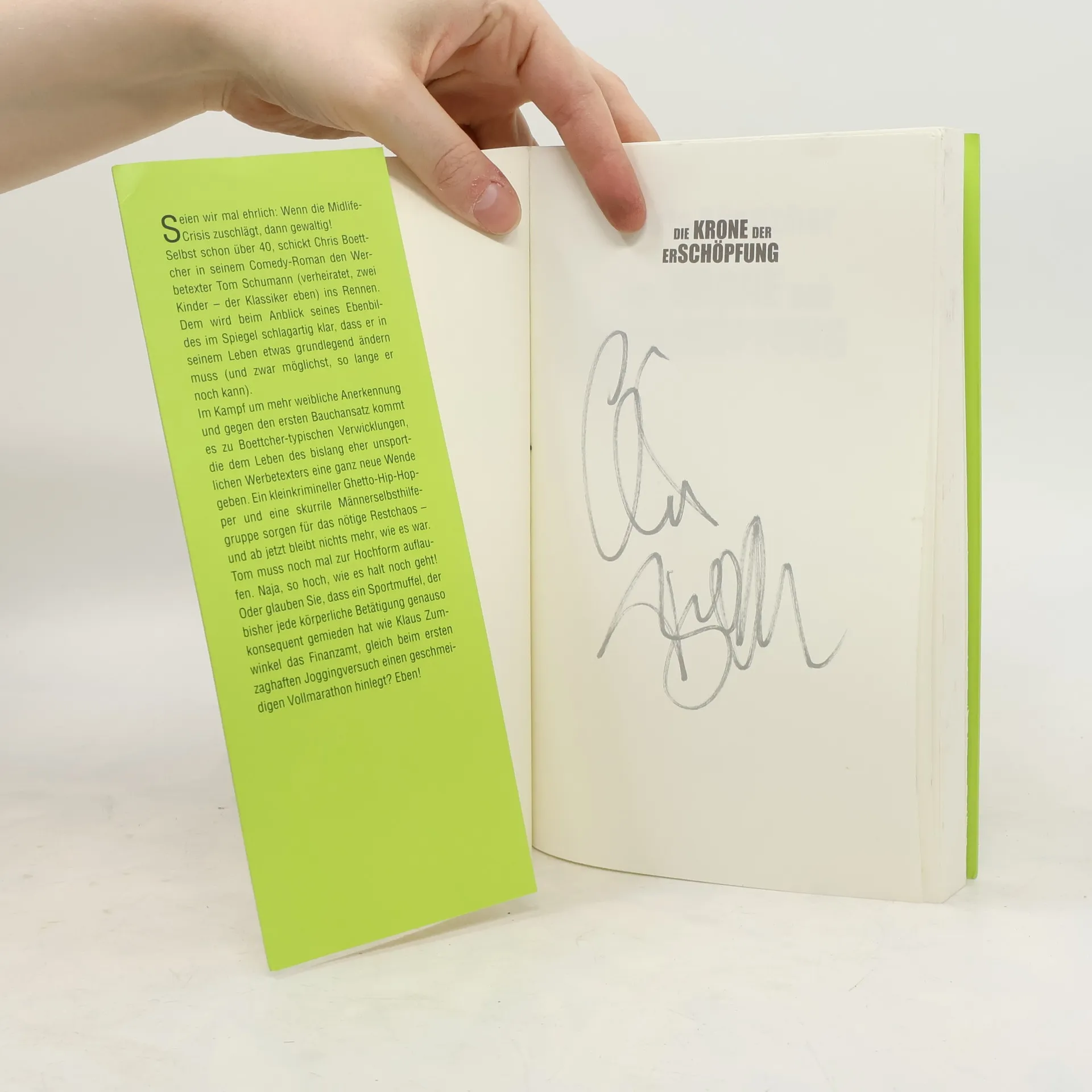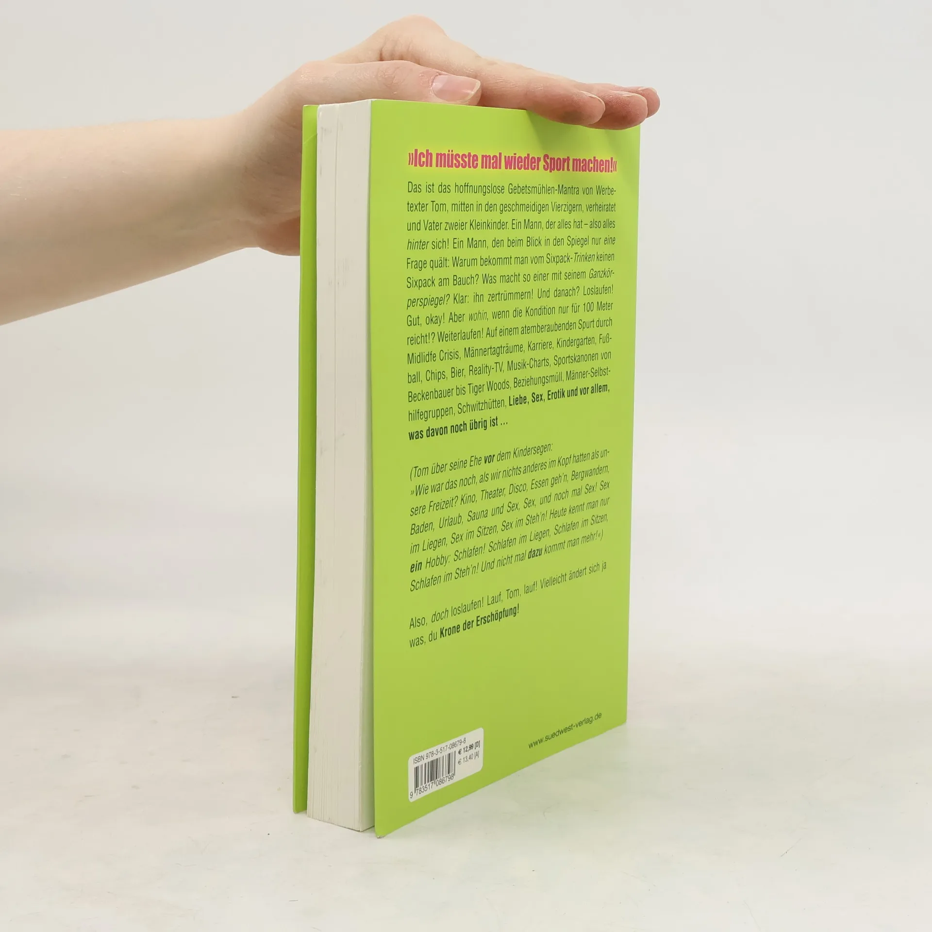 Das lesenswerte Buch des Comedy-Senkrechtstarters Chris Boettcher weiß, wovon er schreibt. Selbst schon über 40 schickt er in seinem Buch allerdings einen Werbetexter (verheiratet, zwei Kinder – den Klassiker eben) ins Rennen. Auf der Suche nach mehr (weiblicher) Anerkennung und im Kampf gegen den (drohenden) Bauchansatz, kommt es zu boettcher-typischen Verwicklungen. Am Anfang steht ein zertrümmerter Ganzkörper-Spiegel – und damit nimmt das Drama seinen Lauf: Dann kommt unweigerlich der Moment, in dem man beschließt: „Ich muss etwas ändern!” Was er getan hat. Doch glauben Sie, dass ein Sportmuffel, der bisher jede körperliche Betätigung genauso konsequent gemieden hat wie Klaus Zumwinkel das Finanzamt, gleich beim ersten zaghaften Joggingversuch einen geschmeidigen Vollmarathon hinlegt?