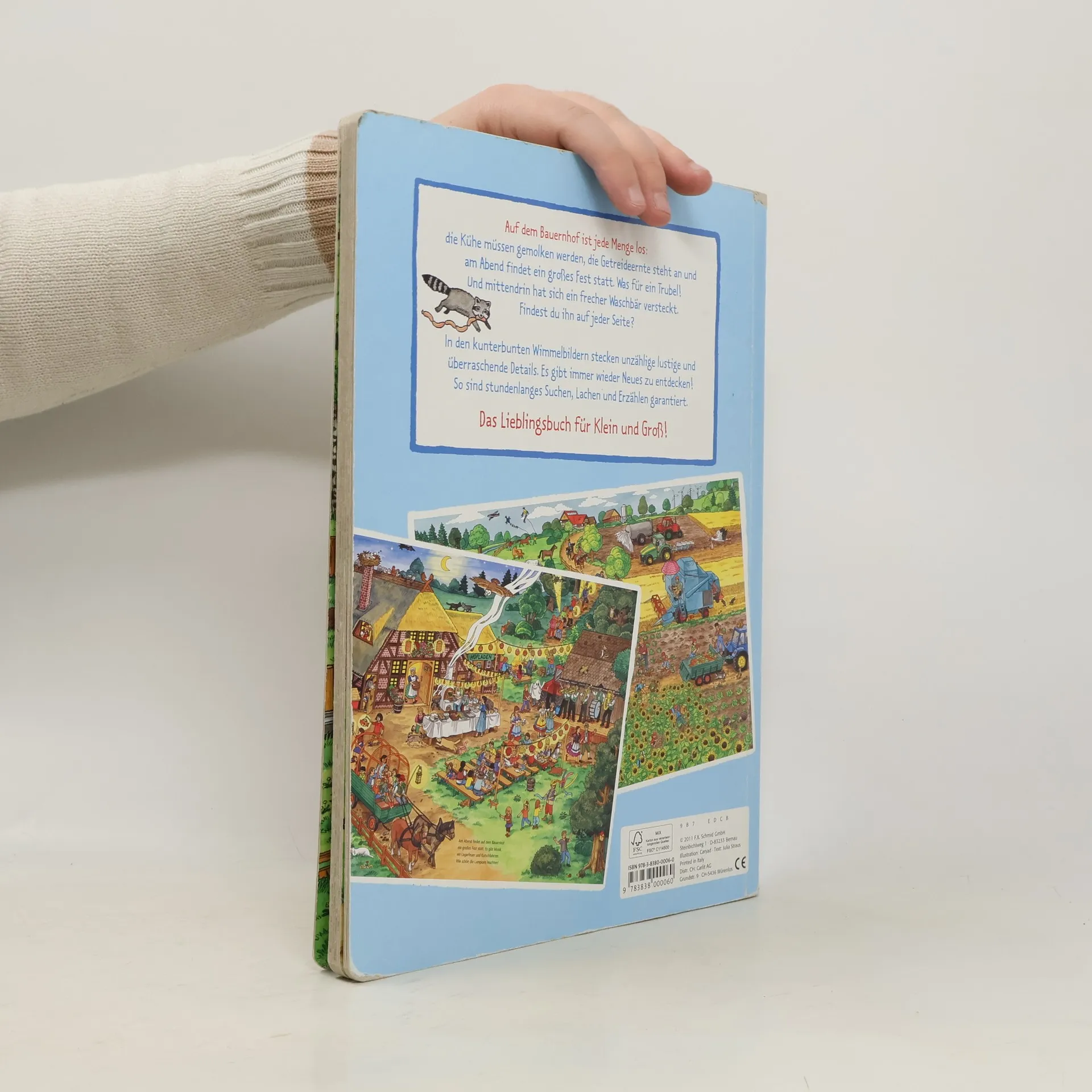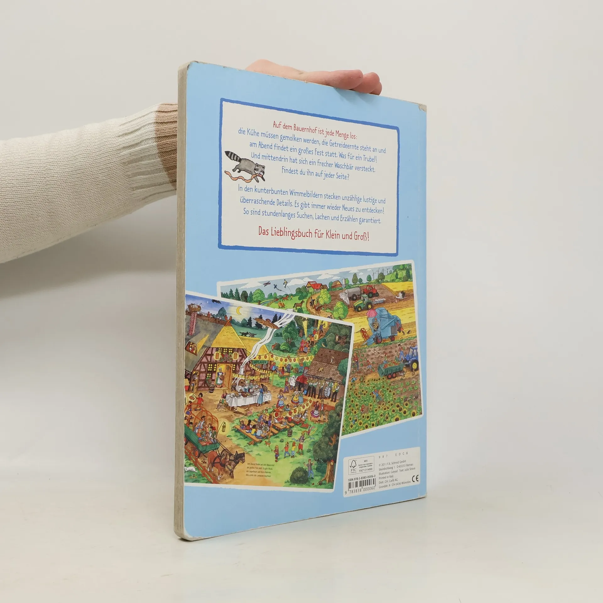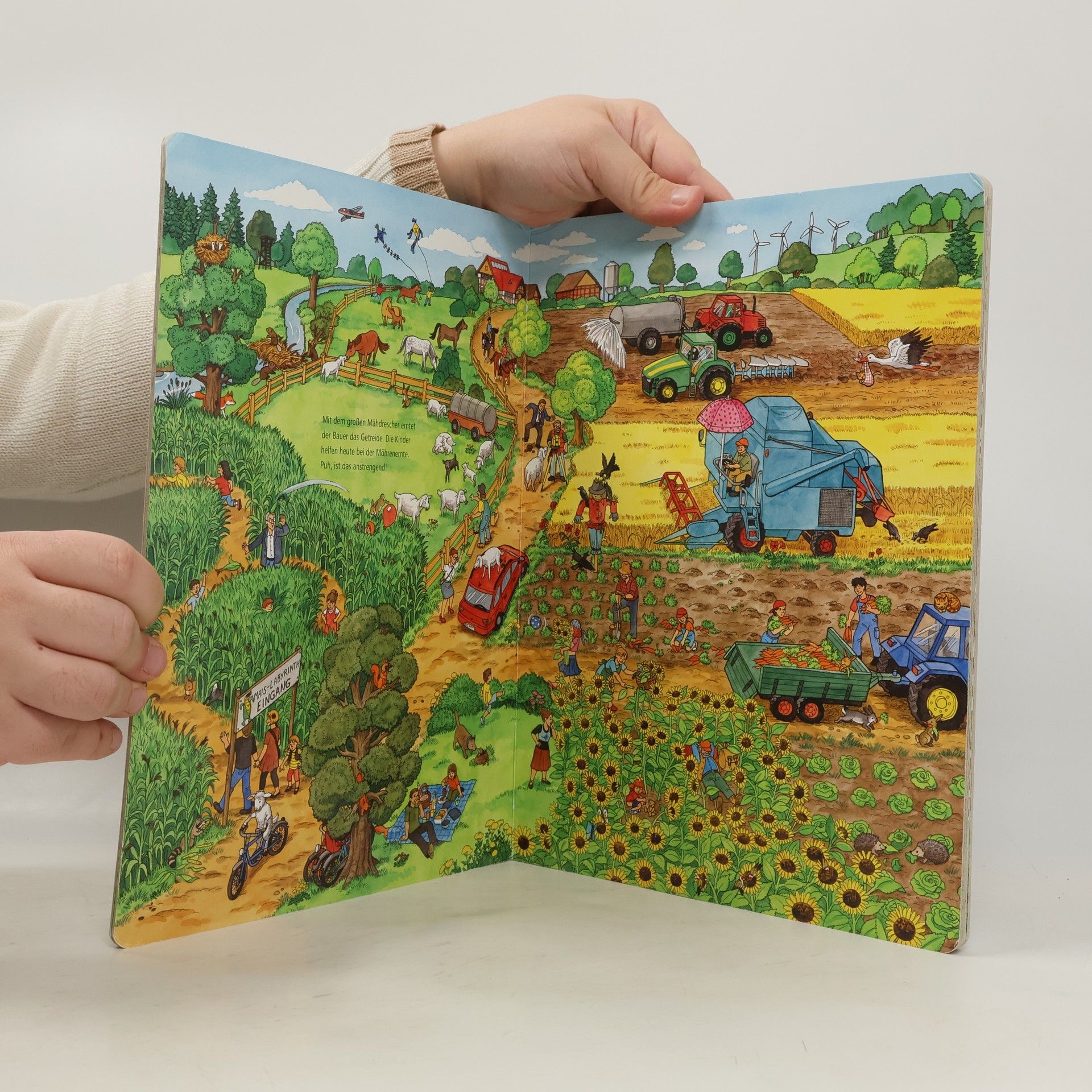 Auf dem Bauernhof ist viel los: die Kühe müssen gemolken werden, die Getreideernte steht an und am Abend findet ein Fest statt. In den bunten Wimmelbildern stecken unzählige lustige und überraschende Details. Es gibt immer wieder Neues zu entdecken!