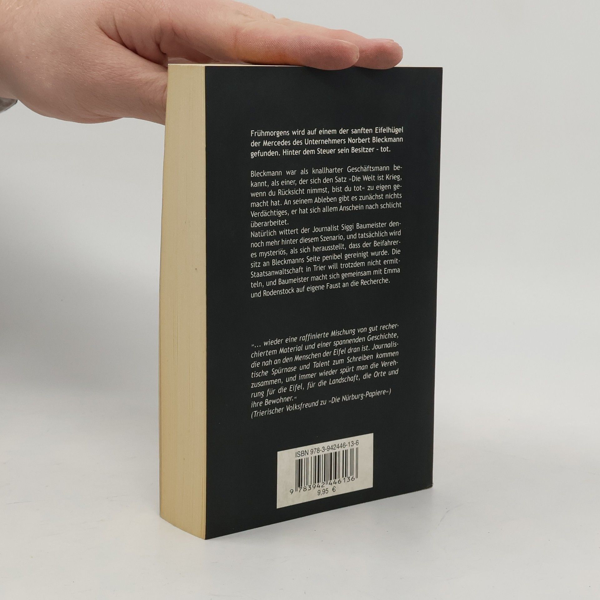 Von 2 eher unspektakulären Todesfällen lassen sich der Journalist Siggi Baumeister und seine Freundin, die ehemalige Kriminalbeamtin Rodenstock, zunächst nicht aufscheuchen. Doch die Äusserungen der jungen Witwe lassen sie vermuten, dass der Eifel wieder einmal Gefahr droht.