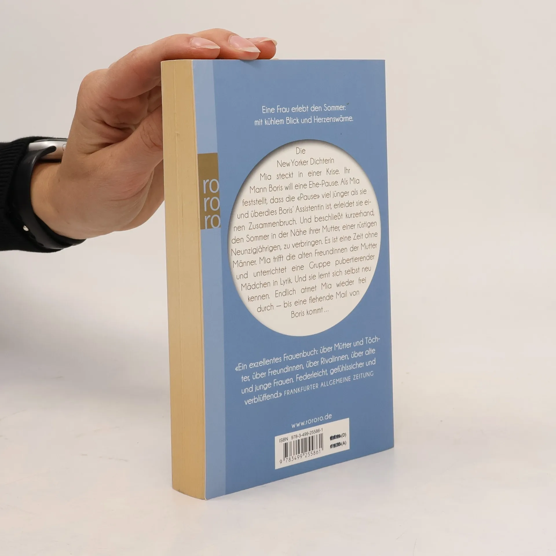 Eine Frau erlebt den Sommer: mit kühlem Blick und Herzenswärme. Die New Yorker Dichterin Mia steckt in einer Krise. Ihr Mann Boris will eine Ehe-Pause. Als Mia feststellt, dass die «Pause» viel jünger als sie und überdies Boris’ Assistentin ist, erleidet sie einen Zusammenbruch. Und beschließt kurzerhand, den Sommer in der Nähe ihrer Mutter, einer rüstigen Neunzigjährigen, zu verbringen. Es ist eine Zeit ohne Männer. Mia trifft die alten Freundinnen der Mutter und unterrichtet eine Gruppe pubertierender Mädchen in Lyrik. Und sie lernt sich selbst neu kennen. Endlich atmet Mia wieder frei durch — bis eine flehende Mail von Boris kommt ...