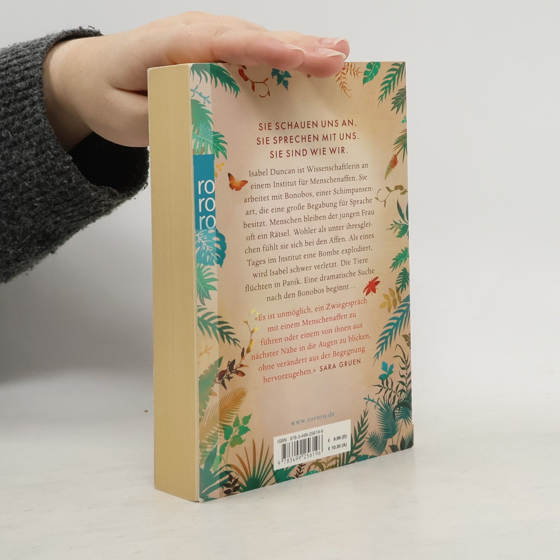 Sie schauen uns an. Sie sprechen mit uns. Sie sind wie wir. Isabel Duncan ist Wissenschaftlerin an einem Institut für Menschenaffen. Sie arbeitet mit Bonobos, einer Schimpansenart, die eine große Begabung für Sprache besitzt. Menschen bleiben der jungen Frau oft ein Rätsel. Wohler als unter ihresgleichen fühlt sie sich bei den Affen. Als eines Tages im Institut eine Bombe explodiert, wird Isabel schwer verletzt. Die Tiere flüchten in Panik. Eine dramatische Suche nach den Bonobos beginnt ... «Es ist unmöglich, ein Zwiegespräch mit einem Menschenaffen zu führen oder einem von ihnen aus nächster Nähe in die Augen zu blicken, ohne verändert aus der Begegnung hervorzugehen.» SARA GRUEN