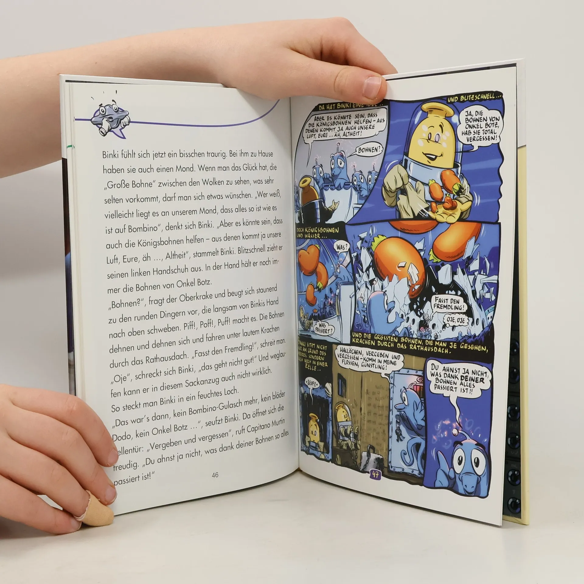Wie weit ist die Erde von der Sonne entfernt? Wie viele Planeten hat unser Sonnensystem? Was ist die Milchstraße? Auf diese und andere Fragen gibt das Buch Antwort. Weit, weit weg, in irgendeiner Galaxie, gibt es den Planeten Bambino. Dort lebt Binki. Er wäre gern größer. Heimlich setzt er sich über ein Verbot seines Onkels Plotz hinweg und gerät in ein großes Abenteuer. ab 8 Jahren interessantes Sachwissen spannende Geschichte zum Thema spritziger Comic mit Wissensquiz
