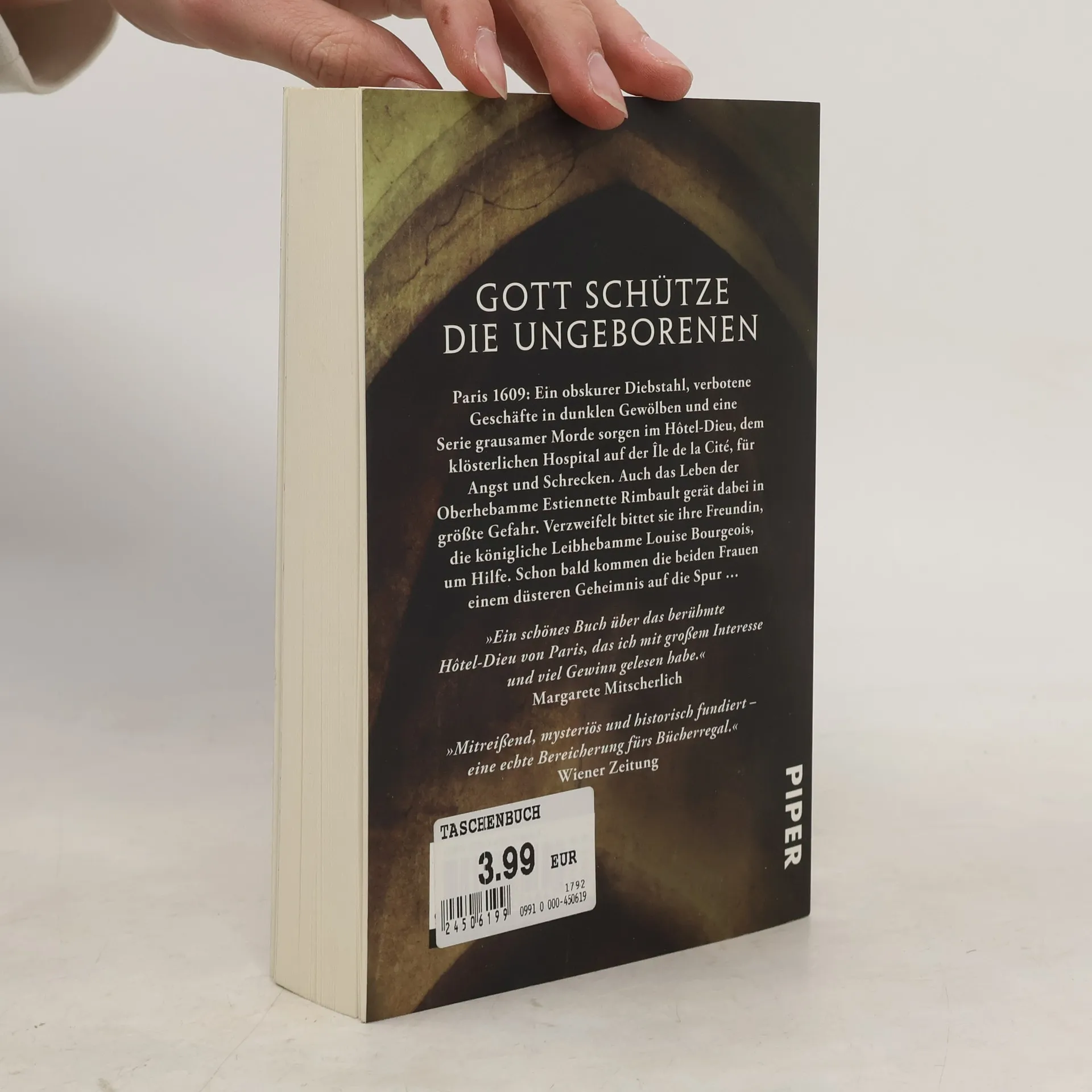 Paris 1609: ein obskurer Diebstahl, verbotene Geschäfte in dunklen Gewölben und eine Serie von grausamen Morden sorgen im Hôtel-Dieu, dem klösterlichen Hospital auf der Île de la Cité, für Angst und Schrecken. Auch das Leben der Oberhebamme Estiennette Rimbault gerät dabei in größte Gefahr. Verzweifelt bittet sie ihre Freundin, die königliche Leibhebamme Louise Bourgeois, um Hilfe. Schon bald kommen die beiden Frauen einem düsteren Geheimnis auf die Spur …