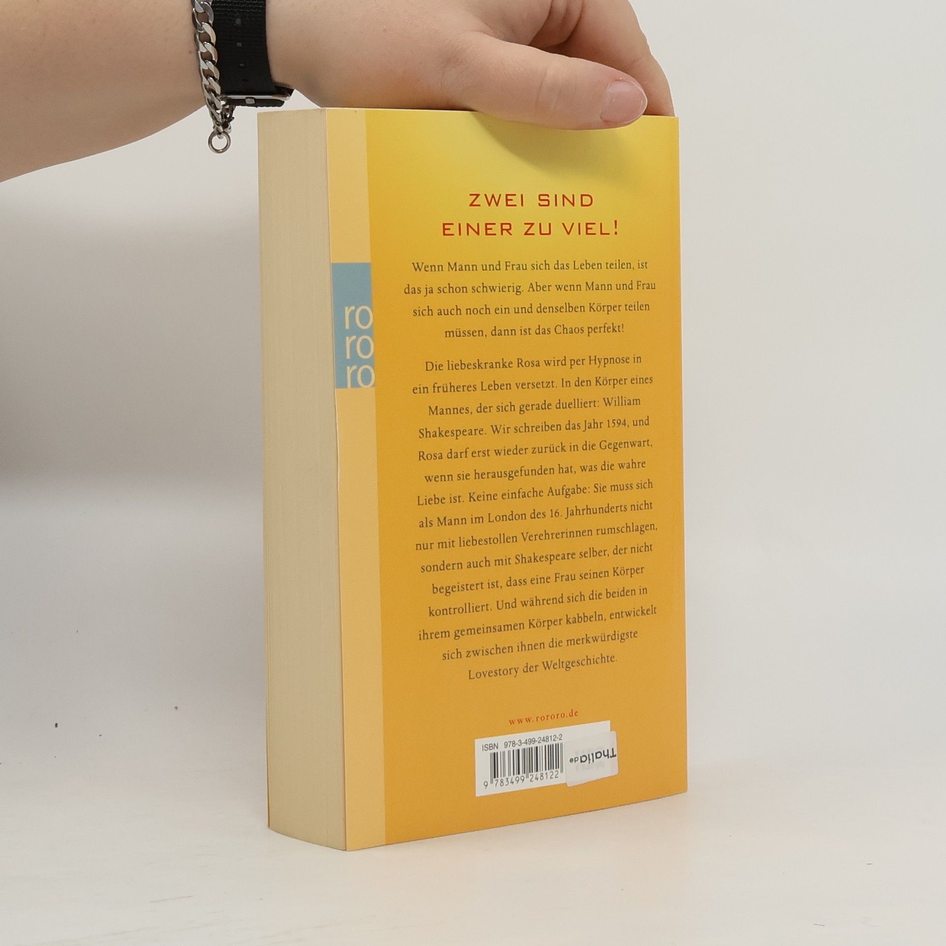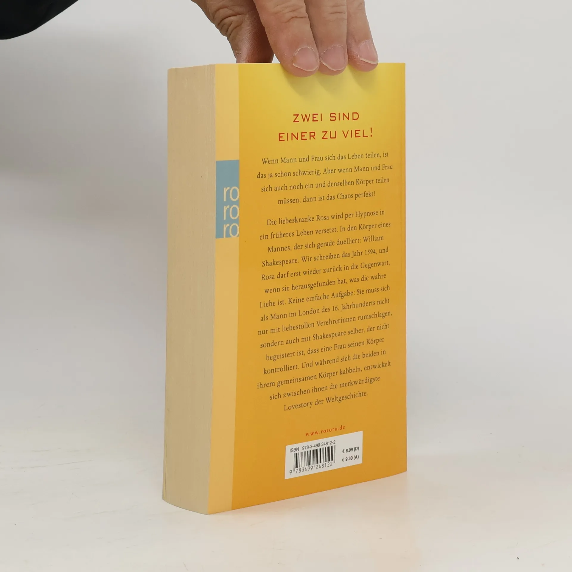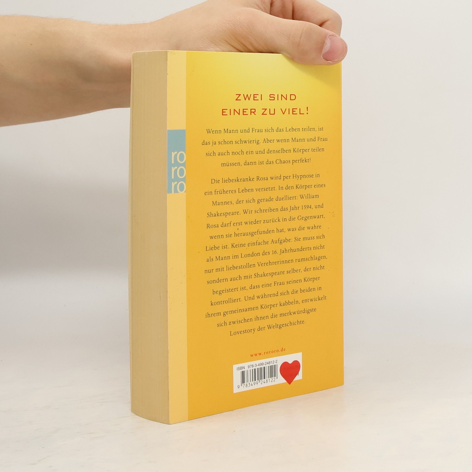 ZWEI SIND EINER ZU VIEL! Wenn Mann und Frau sich das Leben teilen, ist das ja schon schwierig. Aber wenn Mann und Frau sich auch noch ein und denselben Körper teilen müssen, dann ist das Chaos perfekt! Die liebeskranke Rosa wird per Hypnose in ein früheres Leben versetzt. In den Körper eines Mannes, der sich gerade duelliert: William Shakespeare. Wir schreiben das Jahr 1594, und Rosa darf erst wieder zurück in die Gegenwart, wenn sie herausgefunden hat, was die wahre Liebe ist. Keine einfache Aufgabe: Sie muss sich als Mann im London des 16. Jahrhunderts nicht nur mit liebestollen Verehrerinnen rumschlagen, sondern auch mit Shakespeare selber, der nicht begeistert ist, dass eine Frau seinen Körper kontrolliert. Und während sich die beiden in ihrem gemeinsamen Körper kabbeln, entwickelt sich zwischen ihnen die merkwürdigste Lovestory der Weltgeschichte.