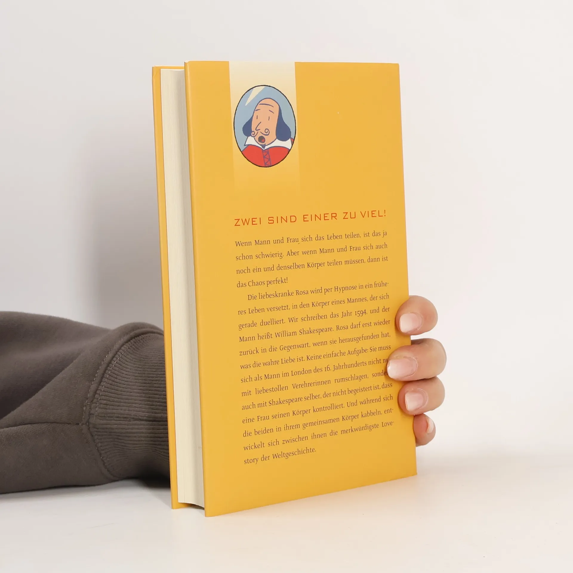 ZWEI SIND EINER ZU VIEL! Wenn Mann und Frau sich das Leben teilen, ist das ja schon schwierig. Aber wenn Mann und Frau sich auch noch ein und denselben Körper teilen müssen, dann ist das Chaos perfekt! Die liebeskranke Rosa wird per Hypnose in ein früheres Leben versetzt. In den Körper eines Mannes, der sich gerade duelliert: William Shakespeare. Wir schreiben das Jahr 1594, und Rosa darf erst wieder zurück in die Gegenwart, wenn sie herausgefunden hat, was die wahre Liebe ist. Keine einfache Aufgabe: Sie muss sich als Mann im London des 16. Jahrhunderts nicht nur mit liebestollen Verehrerinnen rumschlagen, sondern auch mit Shakespeare selber, der nicht begeistert ist, dass eine Frau seinen Körper kontrolliert. Und während sich die beiden in ihrem gemeinsamen Körper kabbeln, entwickelt sich zwischen ihnen die merkwürdigste Lovestory der Weltgeschichte.