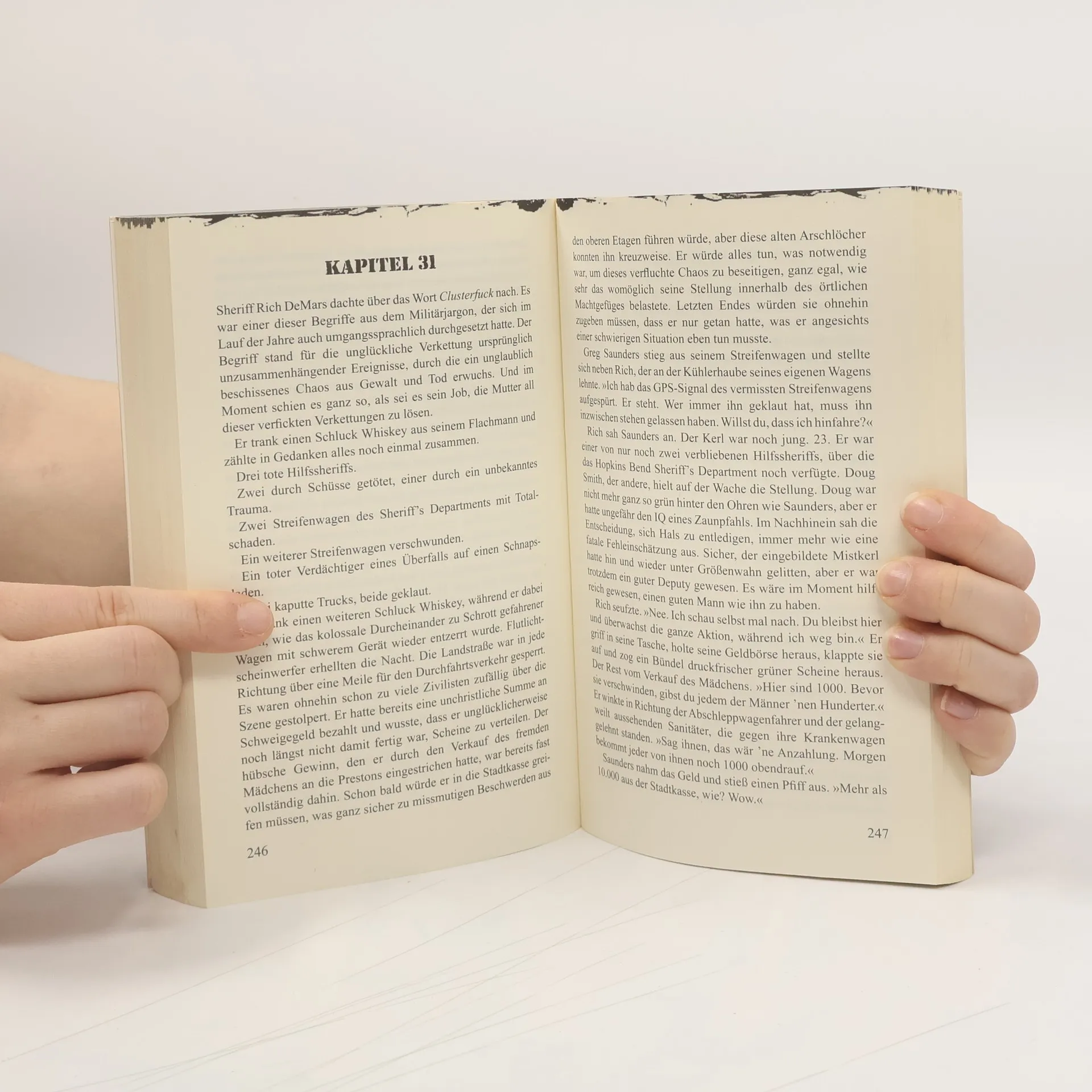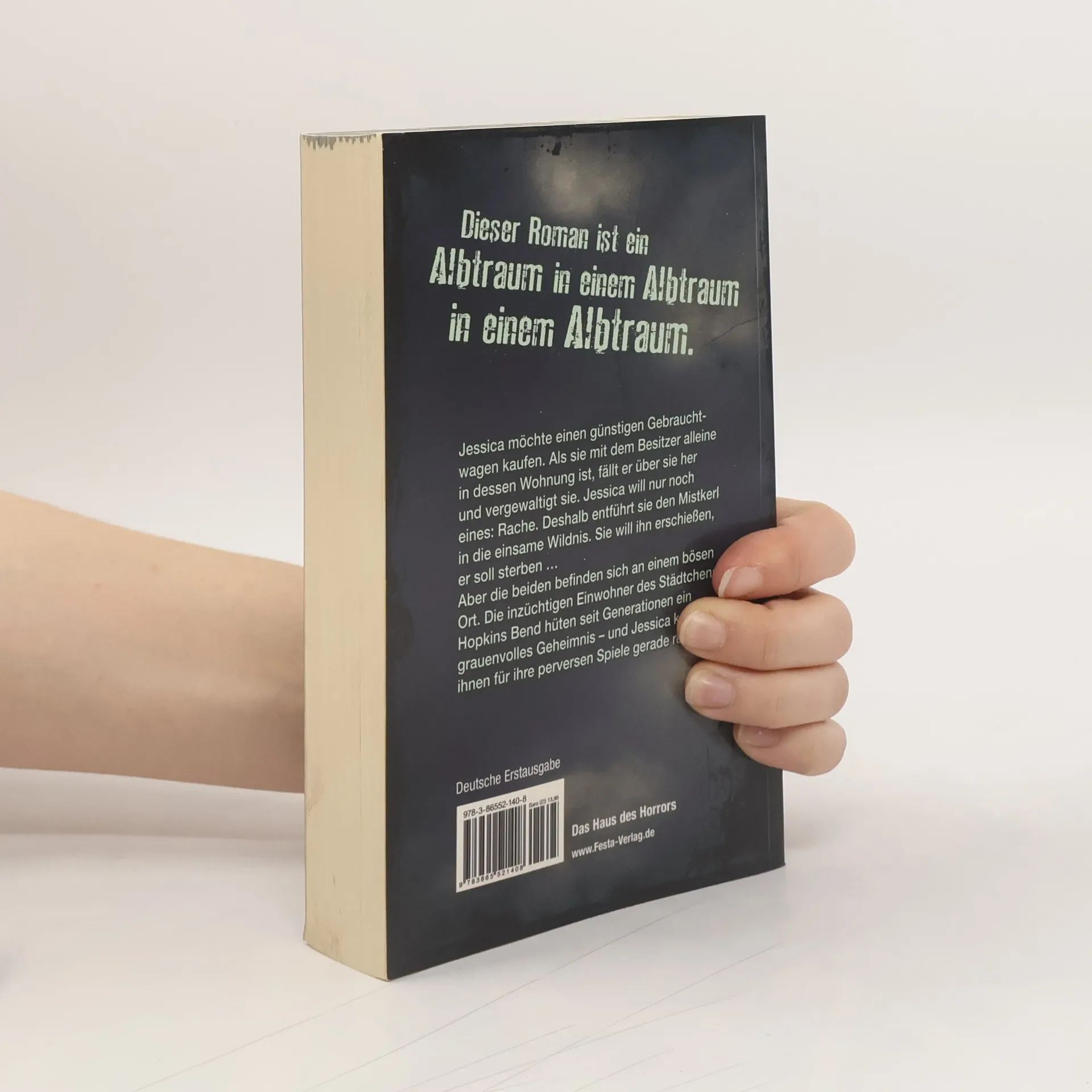 Jessica möchte einen günstigen Gebrauchtwagen kaufen. Als sie mit dem Besitzer alleine in dessen Wohnung ist, fällt er über sie her und vergewaltigt sie. Jessica will nur noch eines: Rache. Deshalb entführt sie den Mistkerl in die einsame Wildnis. Sie will ihn erschießen, er soll sterben … Aber die beiden befinden sich an einem bösen Ort. Die inzüchtigen Einwohner des Städtchens Hopkins Bend hüten seit Generationen ein grauenvolles Geheimnis – und Jessica kommt ihnen für ihre perversen Spiele gerade recht … Dieser Roman ist ein Albtraum in einem Albtraum in einem Albtraum. Deutsche Erstausgabe. Broschur 19 x 12 cm, Umschlag in Lederoptik.
