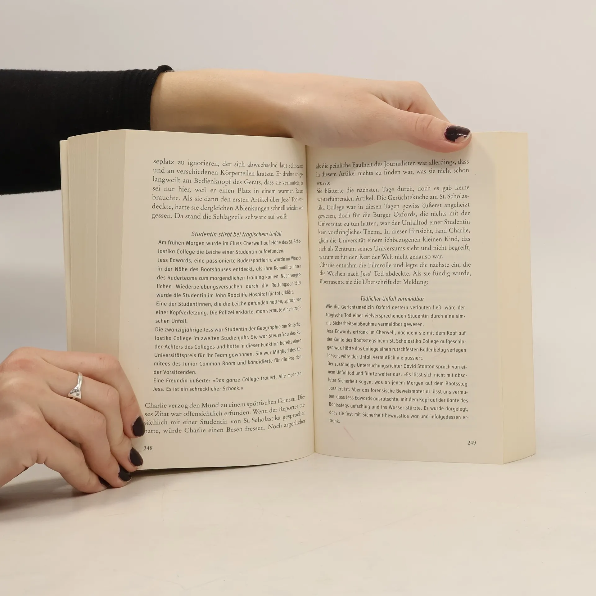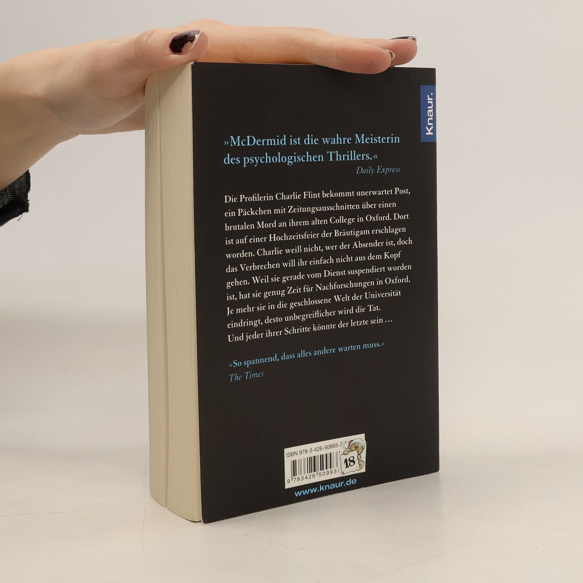Die Profilerin Charlie Flint bekommt unerwartet Post, ein Päckchen mit Zeitungsausschnitten über einen brutalen Mord an ihrem alten College in Oxford. Dort ist auf einer Hochzeitsfeier der Bräutigam erschlagen worden. Während die Gäste sich den Champagner schmecken ließen, hat man seine blutüberströmte Leiche in den nahen Fluss geworfen. Charlie weiß nicht, wer der Absender ist, doch das Verbrechen will ihr einfach nicht aus dem Kopf gehen. Weil sie gerade vom Dienst suspendiert worden ist, hat sie genug Zeit für Nachforschungen in Oxford. Je mehr sie in die geschlossene Welt der Universität eindringt, desto unbegreiflicher wird die Tat. Und jeder ihrer Schritte könnte einer zu viel sein …