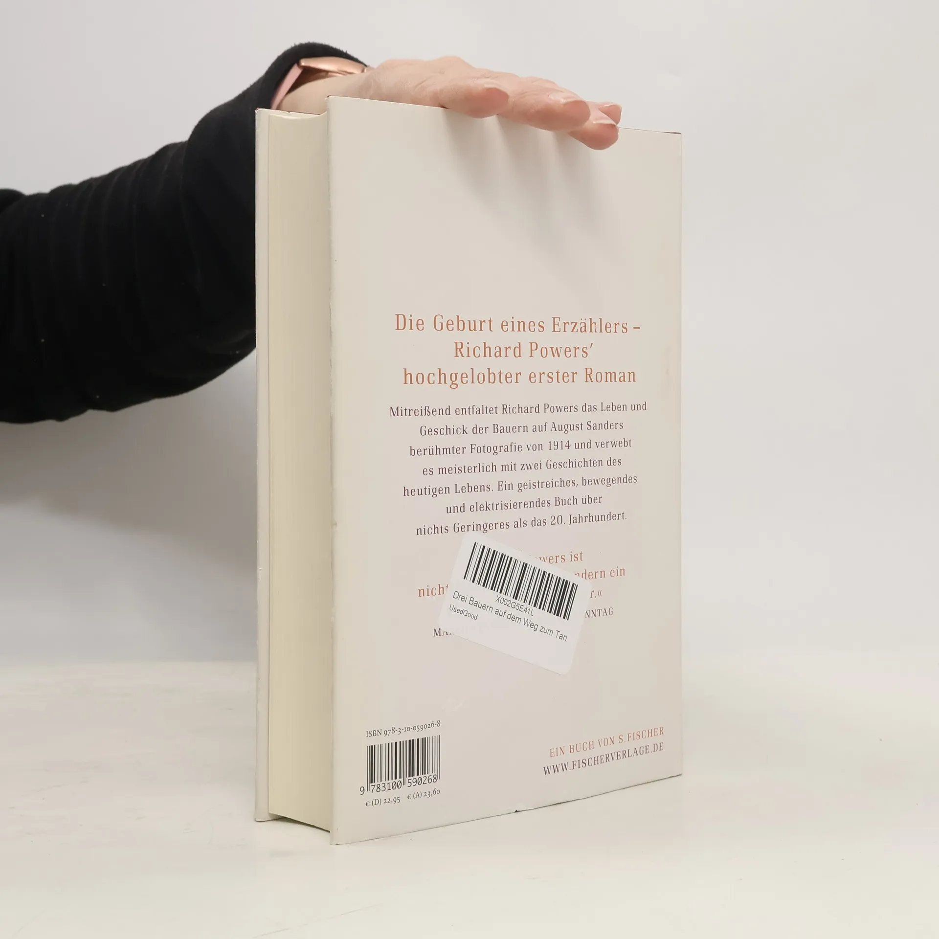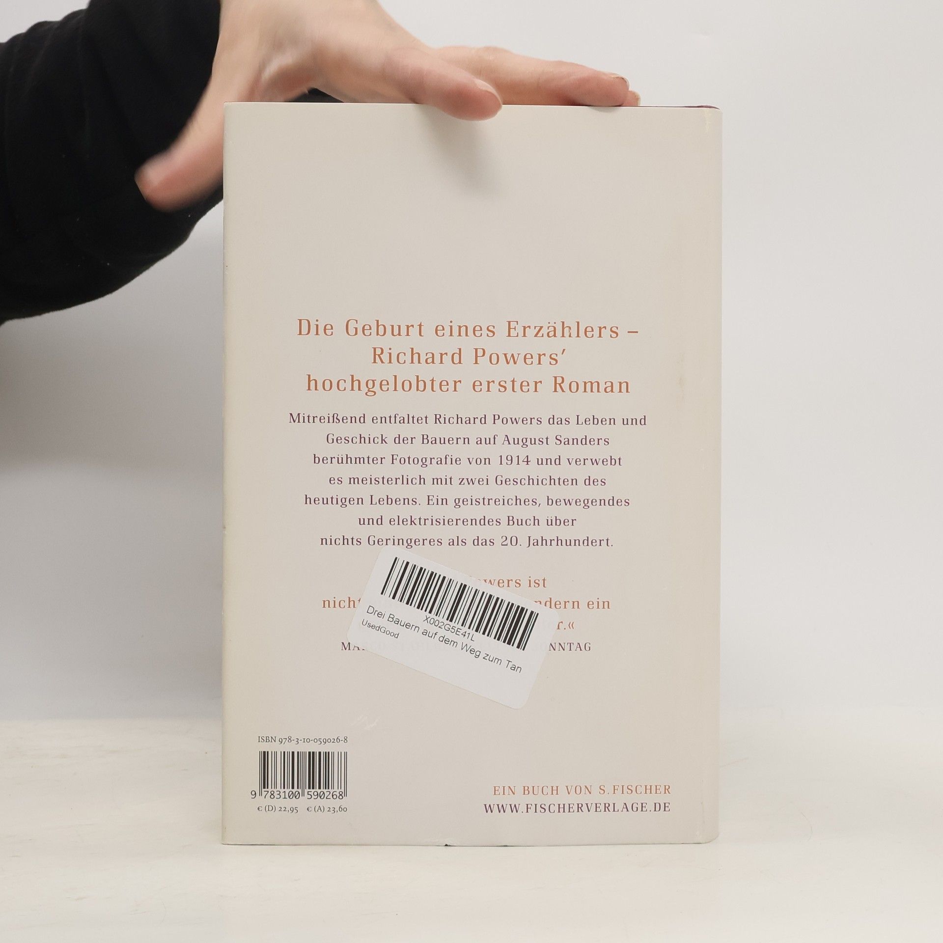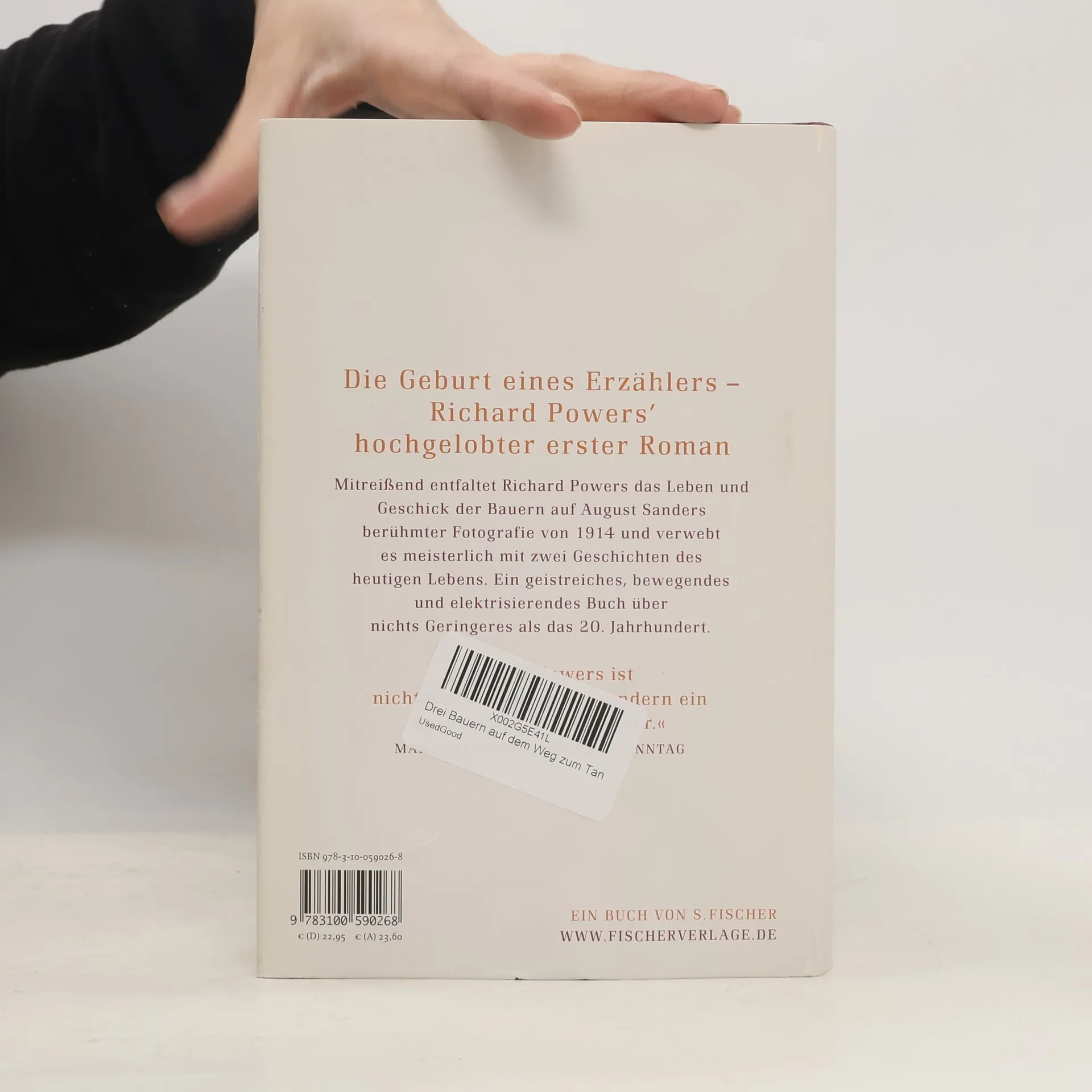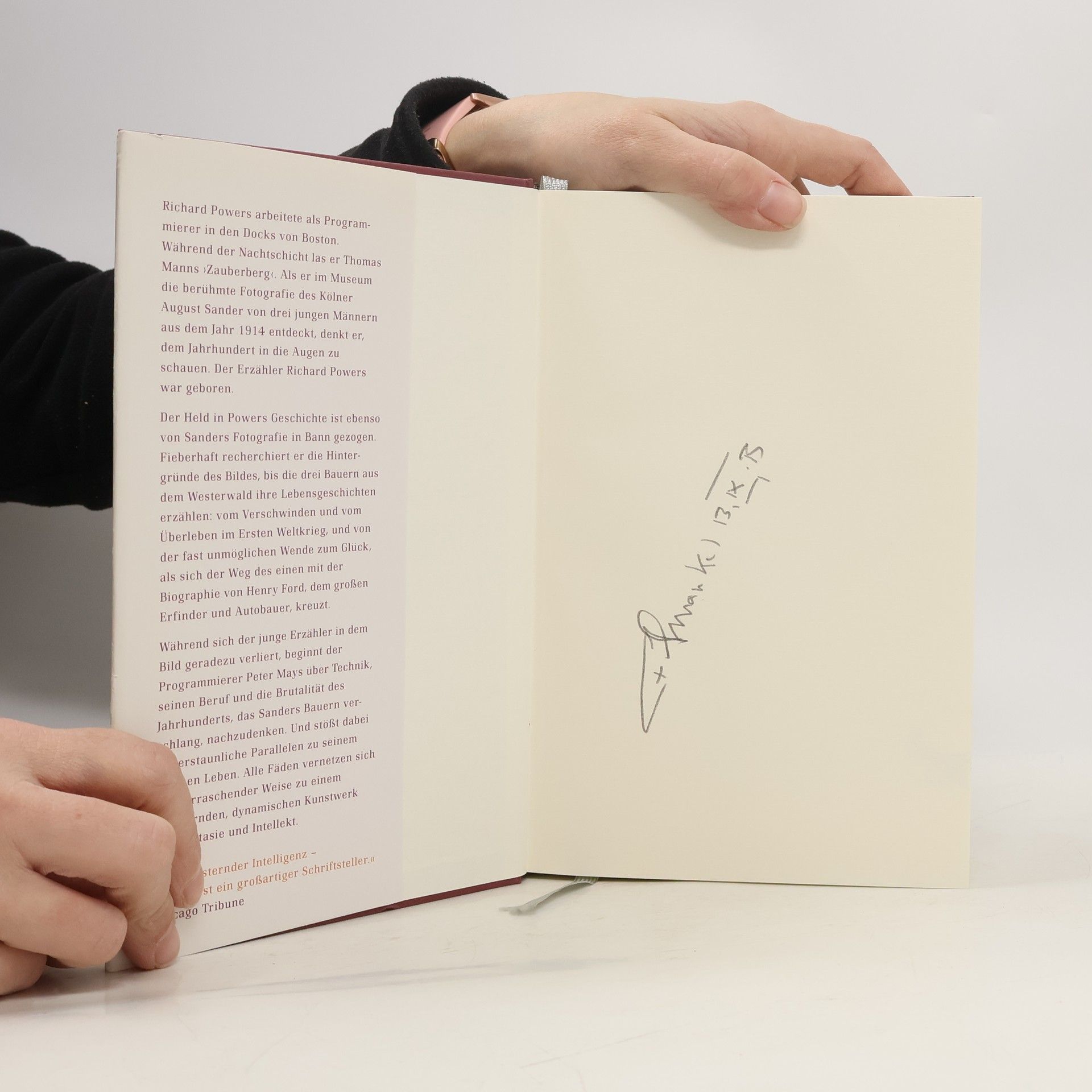 Richard Powers arbeitete als Programmierer in den Docks von Boston. Während der Nachtschicht las er Thomas Manns »Zauberberg«. Als er im Museum die berühmte Fotografie des Kölner August Sanders von drei jungen Männer aus dem Jahr 1914 entdeckt, denkt er, dem Jahrhundert in die Augen zu schauen. Der Erzähler Richard Powers war geboren. Der Held in Powers Geschichte ist ebenso von Sanders Fotografie in Bann gezogen. Fieberhaft recherchiert er die Hintergründe der Bildes, bis die drei Bauern aus dem Westerwald ihre Lebensgeschichten erzählen: vom Verschwinden und vom Überleben im Ersten Weltkrieg, und von der fast unmöglichen Wende zum Glück, als sich der Weg des einen mit der Biographie von Henry Ford, dem großen Erfinder und Autobauer, kreuzt.