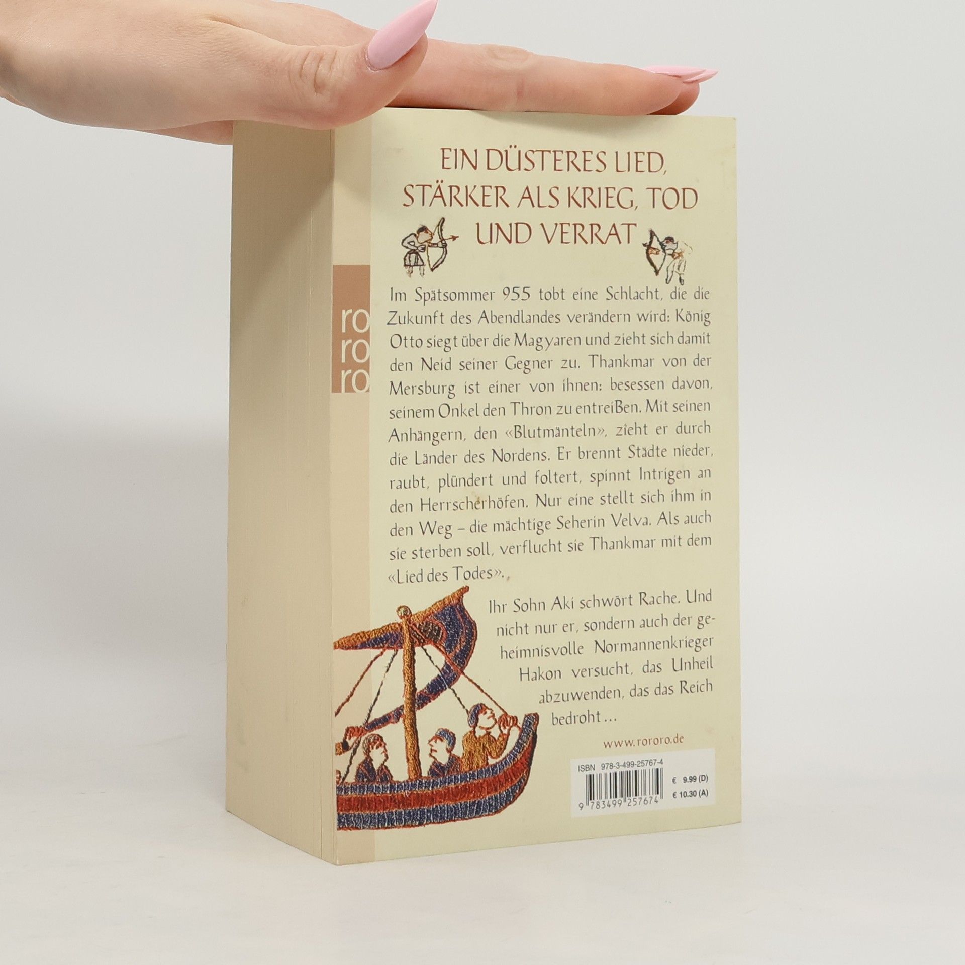 Ein düsteres Lied, stärker als Krieg, Tod und Verrat Im Spätsommer 955 tobt eine Schlacht, die die Zukunft des Abendlandes verändern wird: König Otto siegt über die Magyaren und zieht sich damit den Neid seiner Gegner zu. Thankmar von der Mersburg ist einer von ihnen: besessen davon, seinem Onkel den Thron zu entreißen. Mit seinen Anhängern, den «Blutmänteln», zieht er durch die Länder des Nordens. Er brennt Städte nieder, raubt, plündert und foltert, spinnt Intrigen an den Herrscherhöfen. Nur eine stellt sich ihm in den Weg – die mächtige Seherin Velva. Als auch sie sterben soll, verflucht sie Thankmar mit dem «Lied des Todes». Ihr Sohn Aki schwört Rache. Und nicht nur er, sondern auch der geheimnisvolle Normannenkrieger Hakon versucht, das Unheil abzuwenden, das das Reich bedroht ...