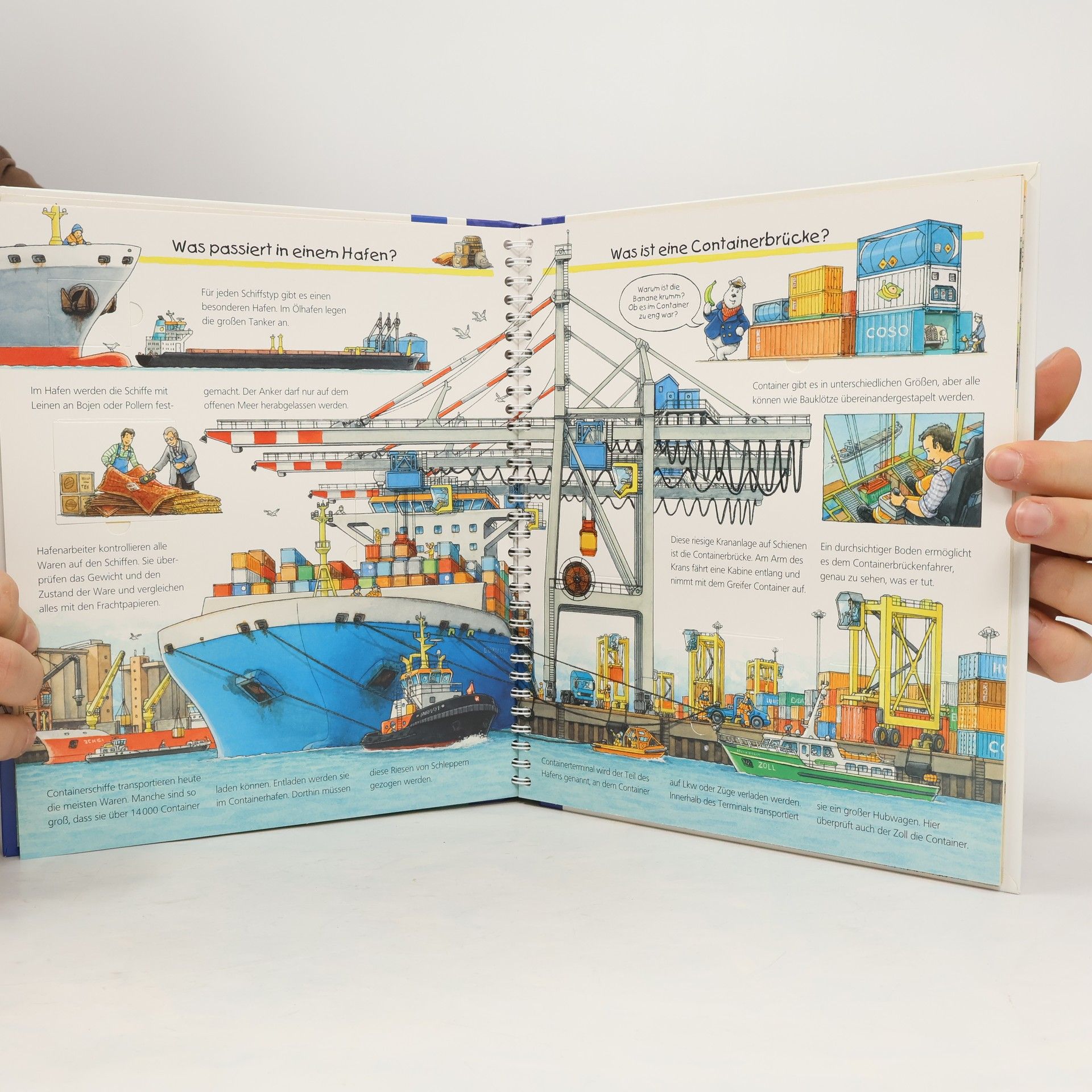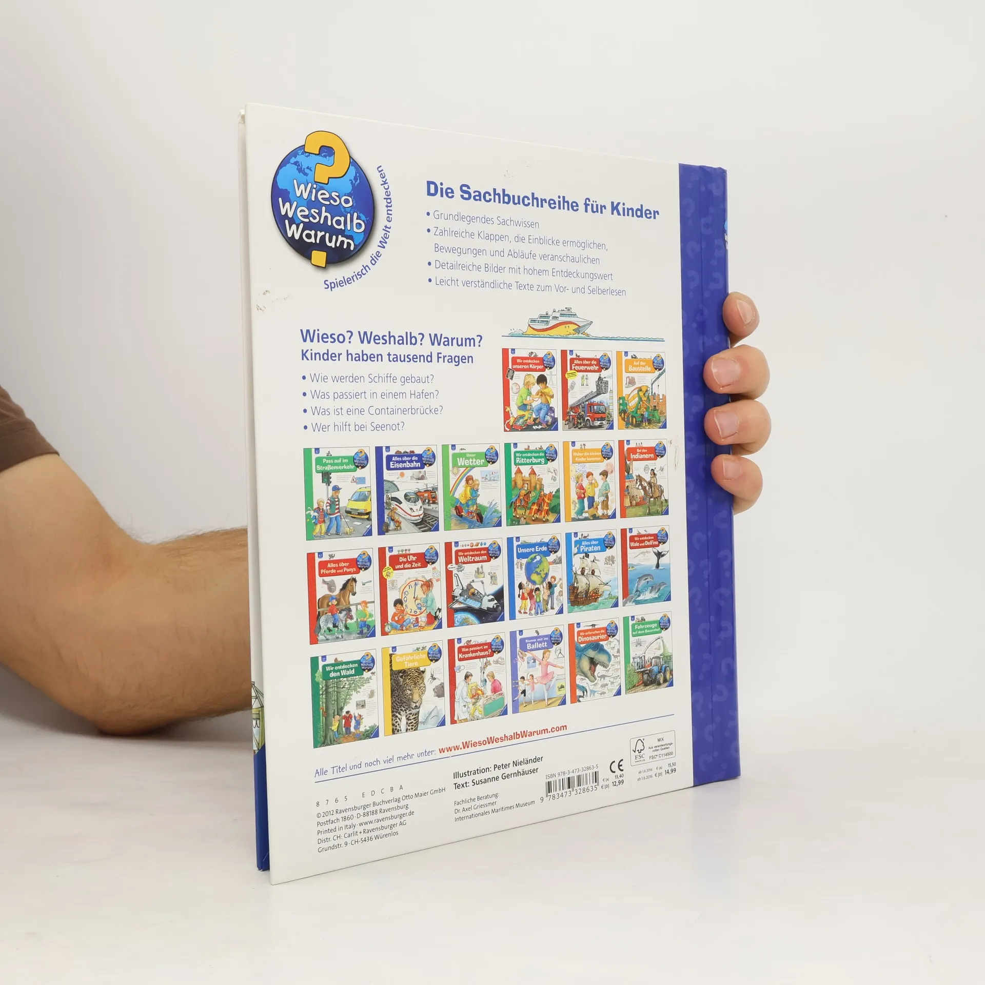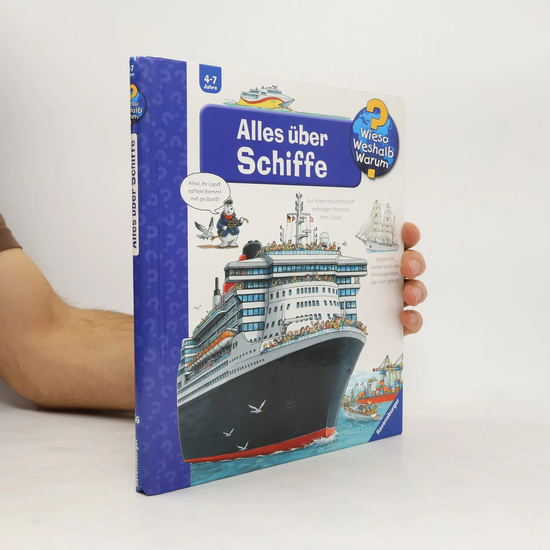 Schiff ahoi! In diesem Buch erfahren Badewannenkapitäne und Technikfans alles rund um die Schifffahrt auf Meeren und Flüssen: Wie werden Schiffe angetrieben und gesteuert? Wer gehört zur Besatzung? Und wer hilft bei Seenot? Mithilfe spannender Klappen erkunden die Kinder eine Werft und einen Containerhafen, wie Schiffe getauft werden und wie Schleusen funktionieren. Außerdem lernen sie das Flaggenalphabet kennen und erfahren, wie man die wichtigsten Knoten knüpft. Wieso? Weshalb? Warum? Die Sachbuchreihe für Kinder von 4–7 Jahren Jeden Tag entdecken Kinder etwas Neues – da kommen viele Fragen auf. Warum sind die Dinosaurier ausgestorben? Wo ist die Sonne in der Nacht? Wozu brauchen wir das Blut? Die beliebte Sachbuchreihe Wieso? Weshalb? Warum? gibt Kindern Antworten auf Augenhöhe. Dabei werden die unterschiedlichsten Themen aus der Alltags- und Interessenswelt der Kinder altersgerecht und mit viel Liebe zum Detail unter die Lupe genommen. Detailreiche Bilder, verständliche Sachtexte und überraschende Klappen, die Bewegungen oder Abläufe veranschaulichen und hinter die Dinge blicken lassen, ermöglichen Kindern, sich ihre Themen selbst zu erschließen. Der Spaß am eigenhändigen Entdecken, die liebevolle Umsetzung und die qualitativ hochwertige Ausstattung garantieren langanhaltende Freude an jedem einzelnen Buch.
