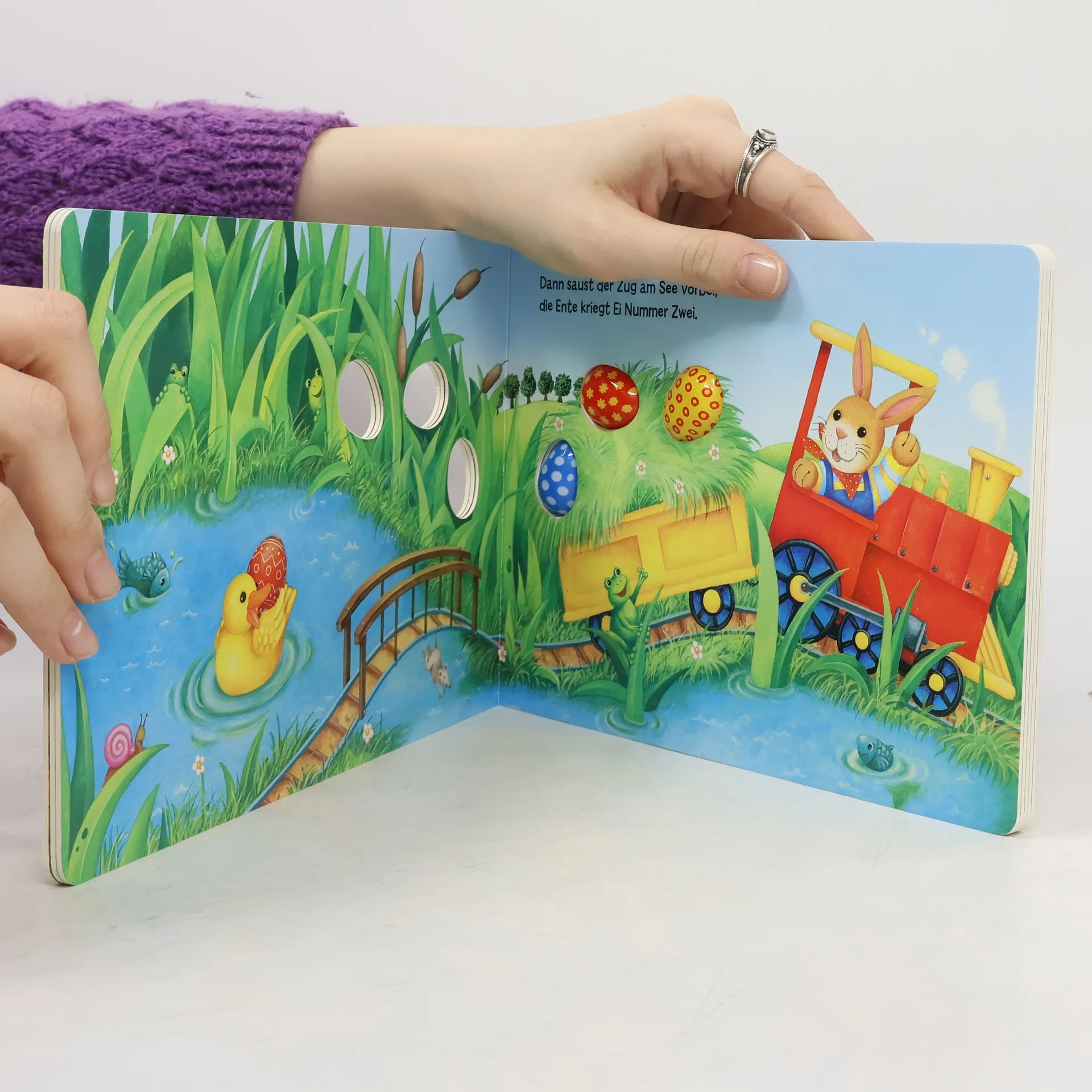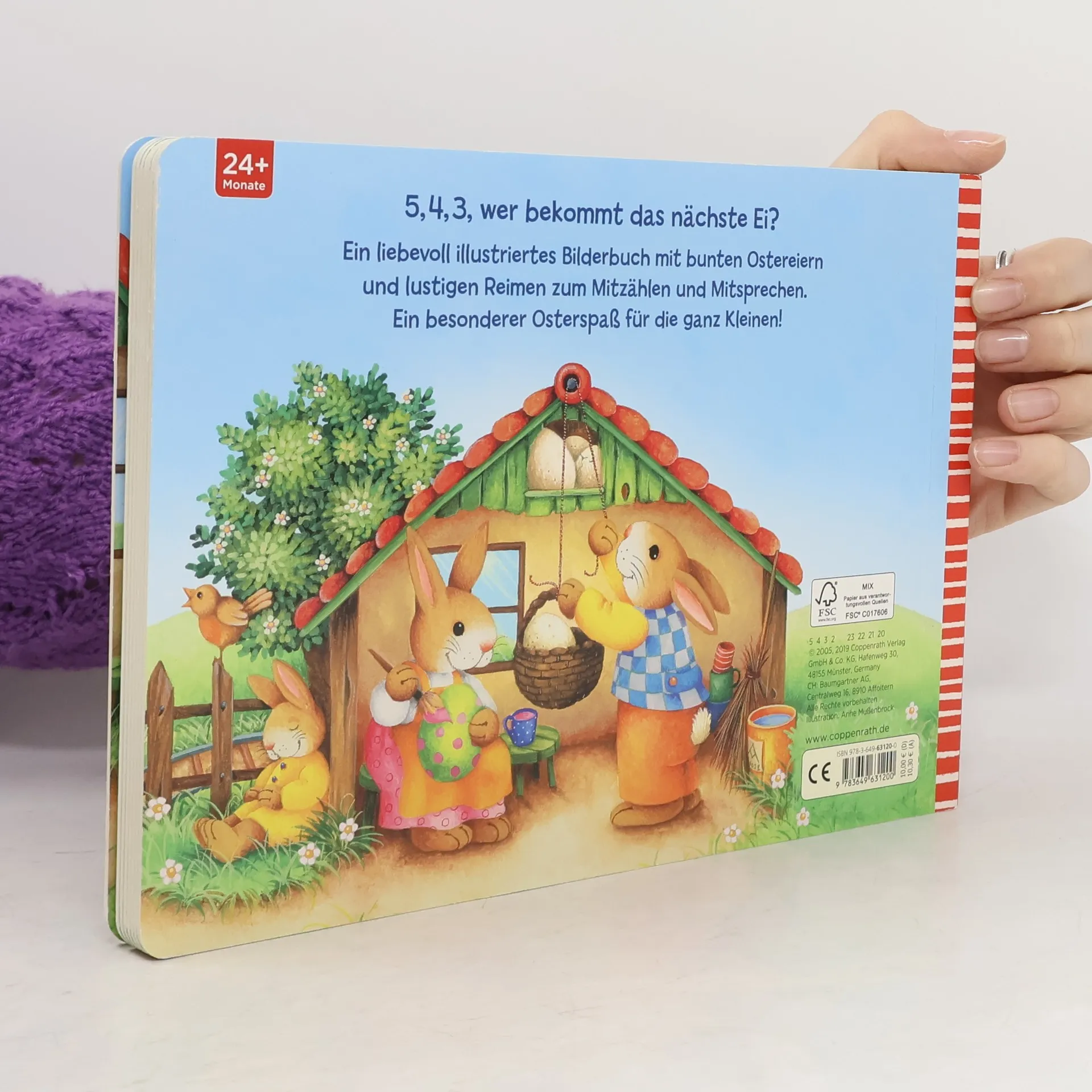 5,4,3, wer bekommt das nächste Ei? Ein liebevoll illustriertes Pappbilderbuch mit bunten Ostereiern und lustigen Reimen zum Mitzählen und Mitsprechen. Ein besonderer Osterspaß für die ganz Kleinen!
