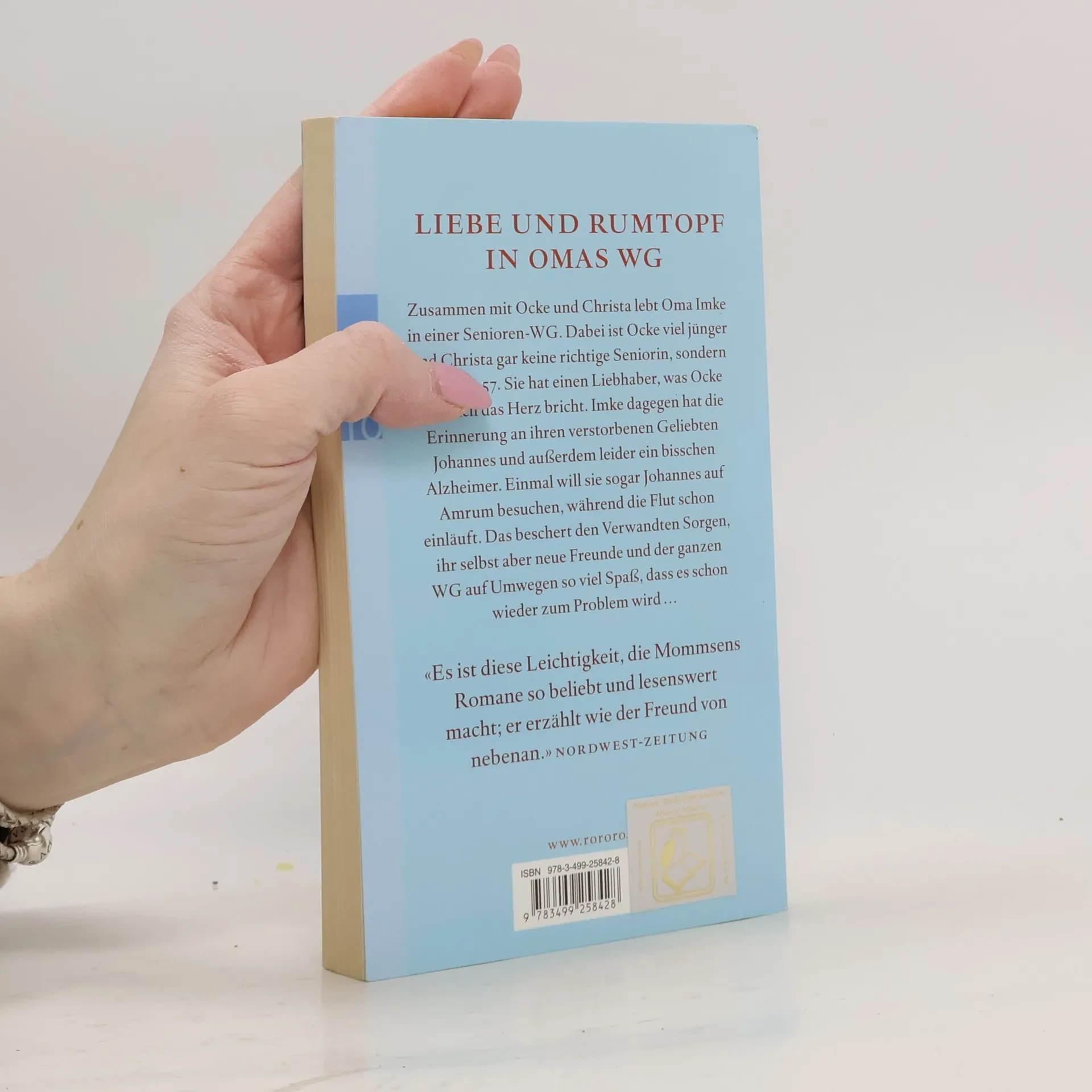 LIEBE UND RUMTOPF IN OMAS WG. Zusammen mit Ocke und Christa lebt Oma Imke in einer Senioren-WG. Dabei ist Ocke viel jünger und Christa gar keine richtige Seniorin, sondern knackige 57. Sie hat einen Liebhaber, was Ocke heimlich das Herz bricht. Imke dagegen hat die Erinnerung an ihren verstorbenen Geliebten Johannes und außerdem leider ein bisschen Alzheimer. Einmal will sie sogar Johannes auf Amrum besuchen, während die Flut schon aufläuft. Das beschert den Verwandten Sorgen, ihr selbst aber neue Freunde und der ganzen WG auf Umwegen so viel Spaß, dass es schon wieder zum Problem wird. «Es ist diese Leichtigkeit, die Mommsens Romane so beliebt und lesenswert macht; er erzählt wie der Freund von nebenan.» (Nordwest-Zeitung)