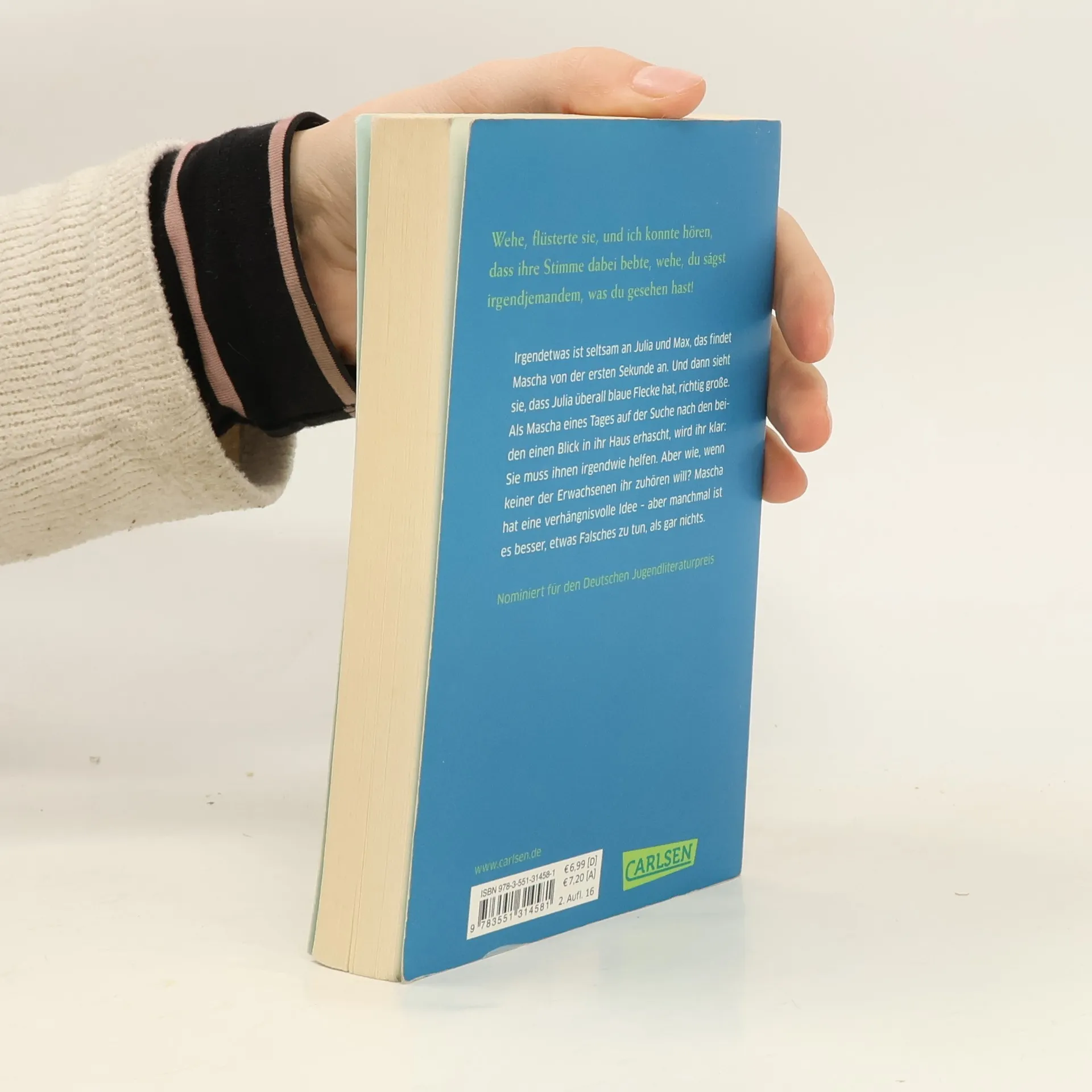Irgendetwas ist seltsam an Julia und Max, das findet Mascha von der ersten Sekunde an. Und dann sieht sie, dass Julia überall blaue Flecke hat, richtig große. Als Mascha schließlich eines Tages auf der Suche nach den beiden vom Garten aus einen Blick in ihr Haus erhascht, ist ihr klar: Sie muss ihnen irgendwie helfen. Aber wie, wenn keiner der Erwachsenen ihr zuhören will? Mascha hat eine verhängnisvolle Idee – aber manchmal ist es besser, etwas Falsches zu tun, als gar nichts.