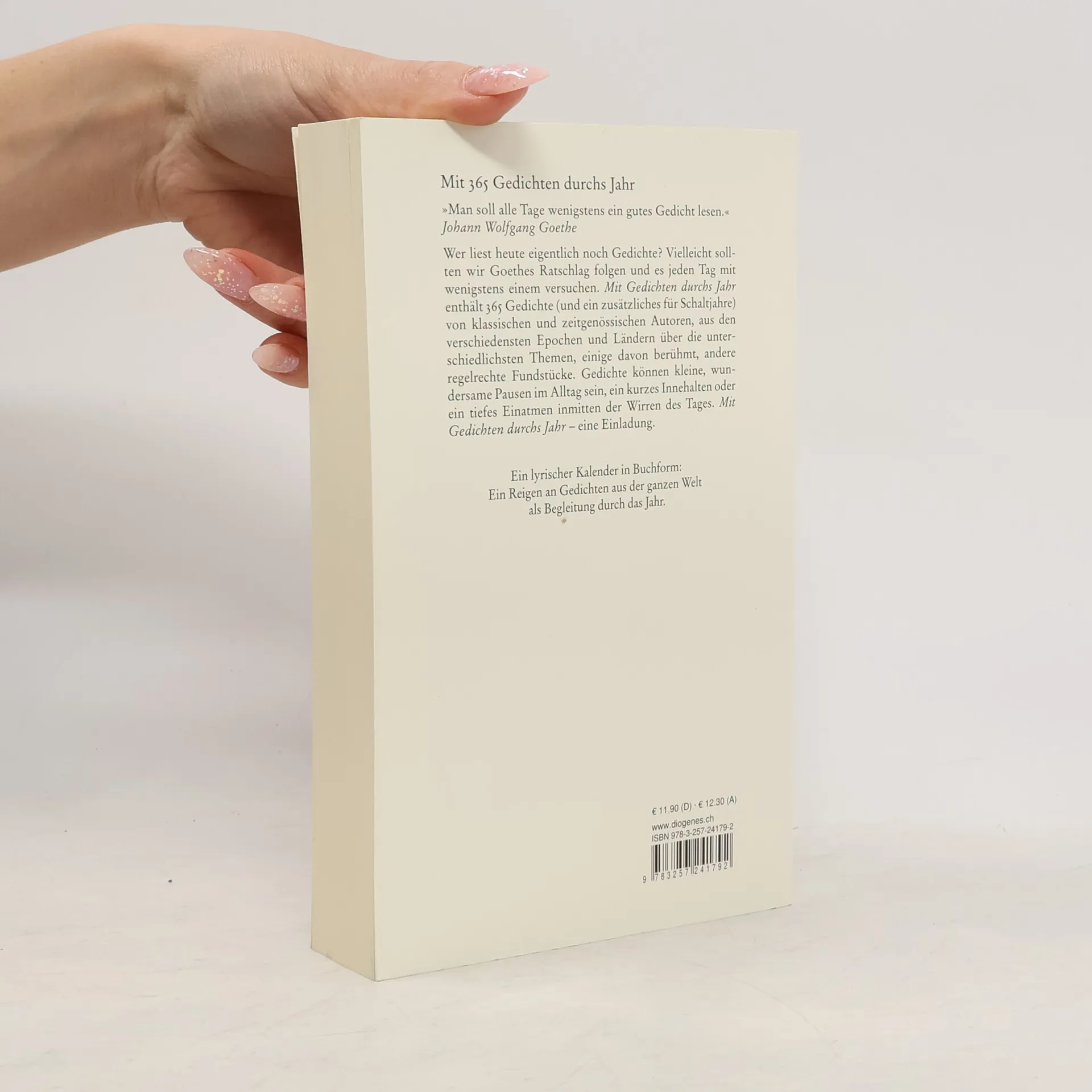 Wer liest heute eigentlich noch Gedichte? Vielleicht sollten wir Goethes Ratschlag folgen und es jeden Tag mit wenigstens einem versuchen. Mit Gedichten durchs Jahr enthält 365 Gedichte von klassischen und zeitgenössischen Autoren, einige davon berühmt, andere regelrechte Fundstücke, aus den verschiedensten Epochen und Ländern über die unterschiedlichsten Themen. Gedichte können kleine, wundersame Pausen im Alltag sein, ein kurzes Innehalten oder ein tiefes Einatmen inmitten der Wirren des Tages. Mit Gedichten durchs Jahr eine Einladung."