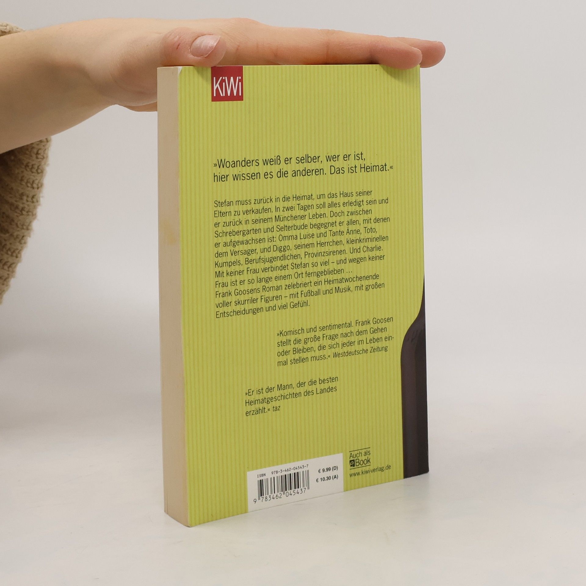»Er ist der Mann, der die besten Heimatgeschichten des Landes erzählt.« taz »Woanders weiß er selber, wer er ist, hier wissen es die anderen. Das ist Heimat.« Stefan muss zurück nach Bochum, um das Haus seiner Eltern zu verkaufen. In zwei Tagen soll alles abgewickelt sein und er zurück in seinem Münchener Leben. Doch in der alten Heimat trifft er auf alle, mit denen er aufgewachsen ist: Omma Luise und Tante Änne, Toto, der Versager, Diggo, sein Herrchen, Frank, der Statthalter, Karin, die Verwirrmaschine, kleinkriminelle Kumpels, Berufsjugendliche, Provinzsirenen. Und Charlie. Mit keiner Frau verbindet Stefan so viel – und wegen keiner Frau ist er so viele Jahre einem Ort ferngeblieben … Cool und sentimental, urkomisch und warmherzig: Frank Goosens Roman zelebriert ein Heimatwochenende voller skurriler Figuren – mit Fußball und Musik, mit großen Entscheidungen und viel Gefühl. Ein Roman voller Wehmut und Tiefgang.