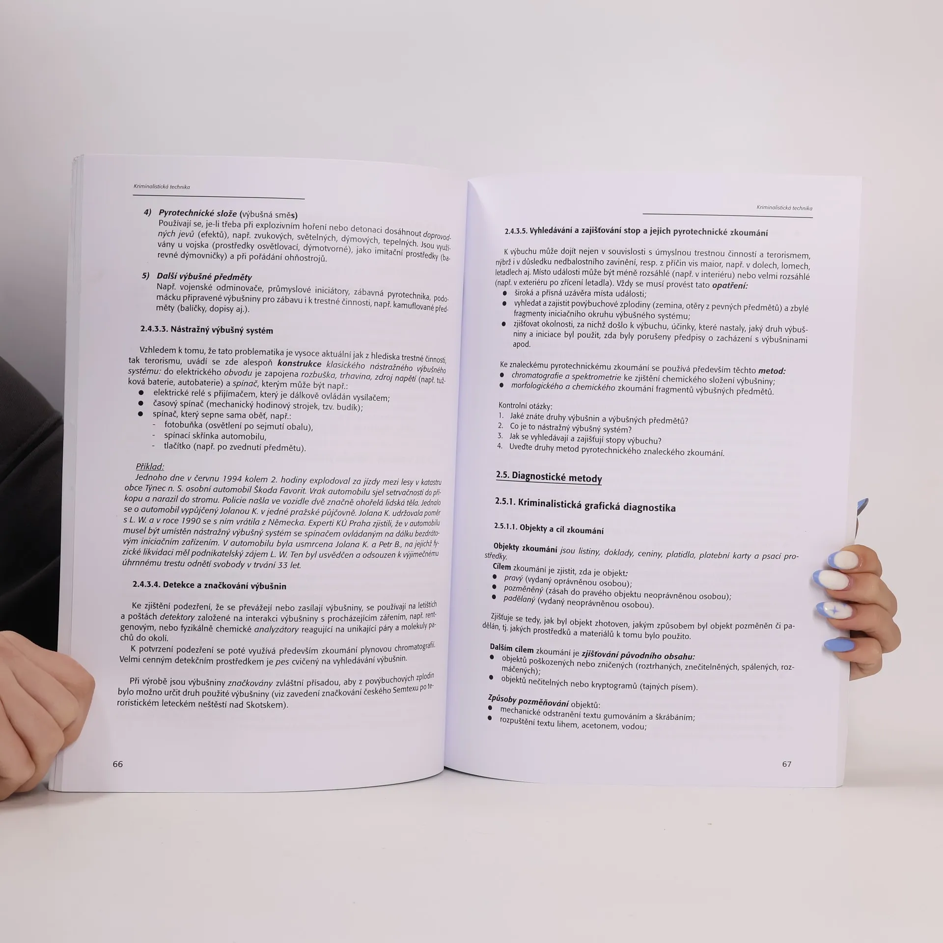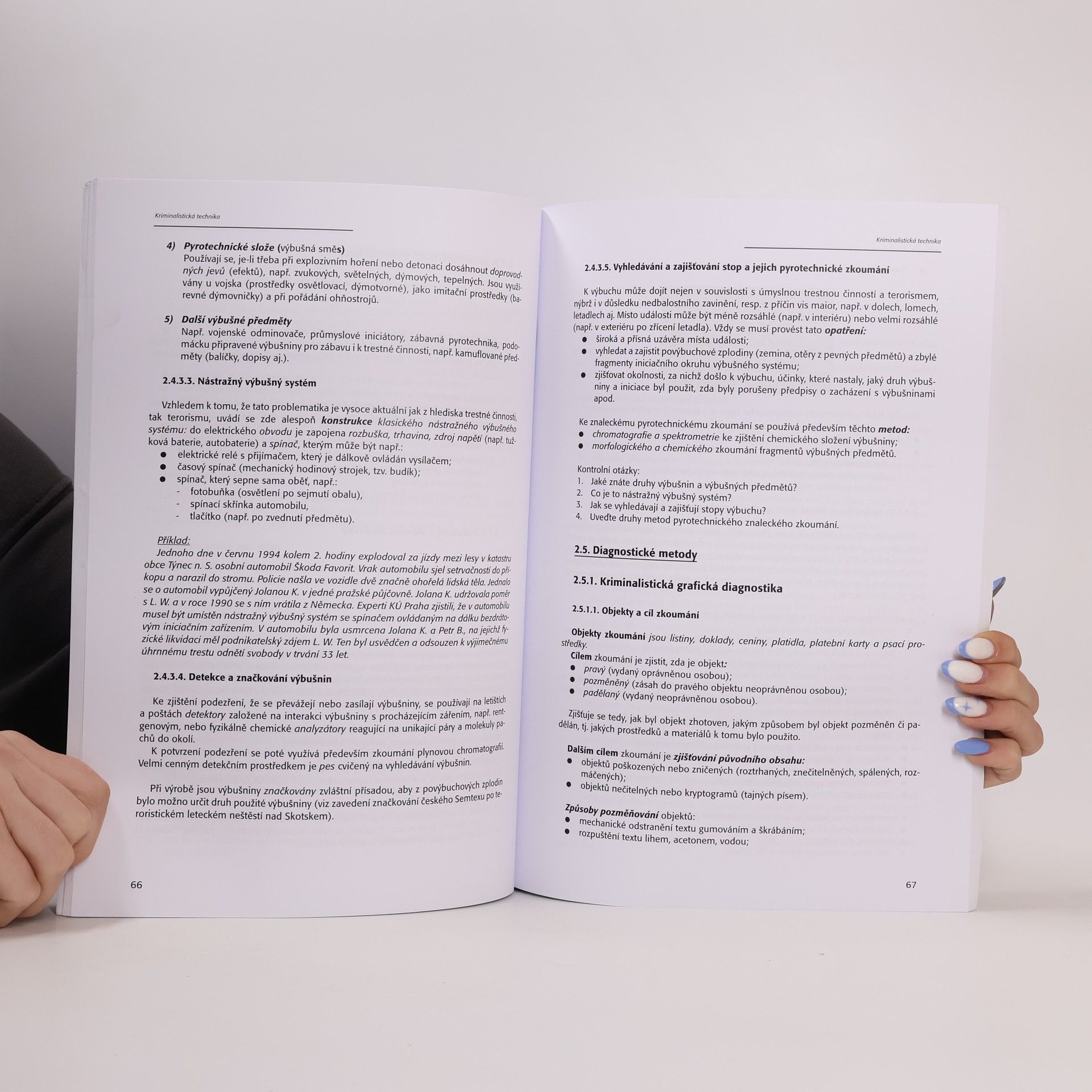 Autoři skripta se velice přehlednou formou zabývájí nejdůležitějšími oblastmi kriminalistiky, rozebírají jednotlivé kriminalistické techniky jako je např. daktyloskopie, fonoskopie, trasologie atp. Další část publikace se zabývá kriminalistickou taktikou, kam spadá např. ohledání, výslech, rekognice apod. Poslední kapitola pojednává o metodice vyšetřování jednotlivých druhů trestných činů (např. krádeže, loupeže, drogová kriminalita).