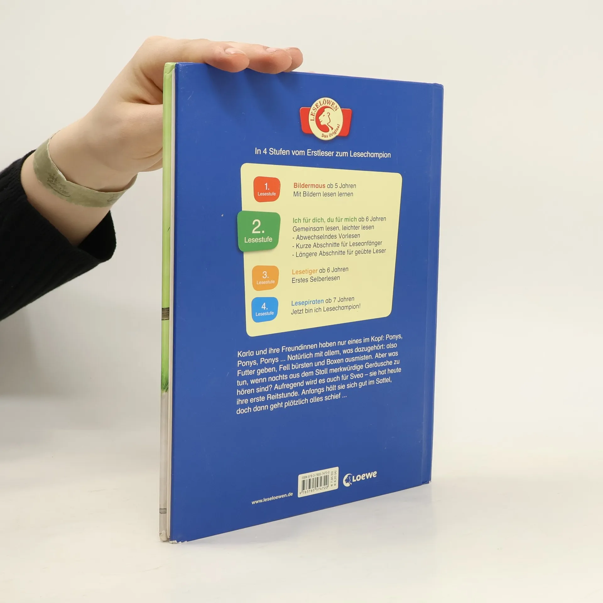 Karla und ihre Freundinnen haben nur eins im Kopf: Ponys, Ponys, Ponys. Natürlich mit allem, was dazu gehört: also Futter geben, Fell bürsten und Boxen ausmisten. Aber was tun, wenn nachts aus dem Stall merkwürdige Geräusche zu hören sind? Aufregend wird es auch für Svea - sie hat heute ihre erste Reitstunde. Anfangs hält sie sich gut im Sattel, doch dann geht plötzlich alles schief. Mehr Infos rund um die Leselöwen - Das Original unter: www. leseloewen. de