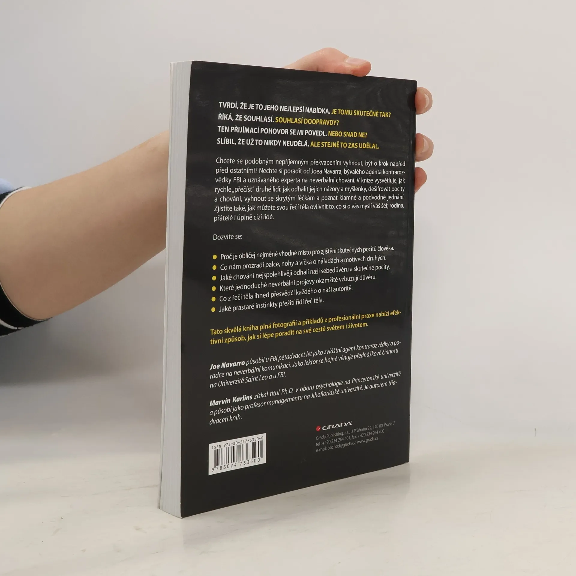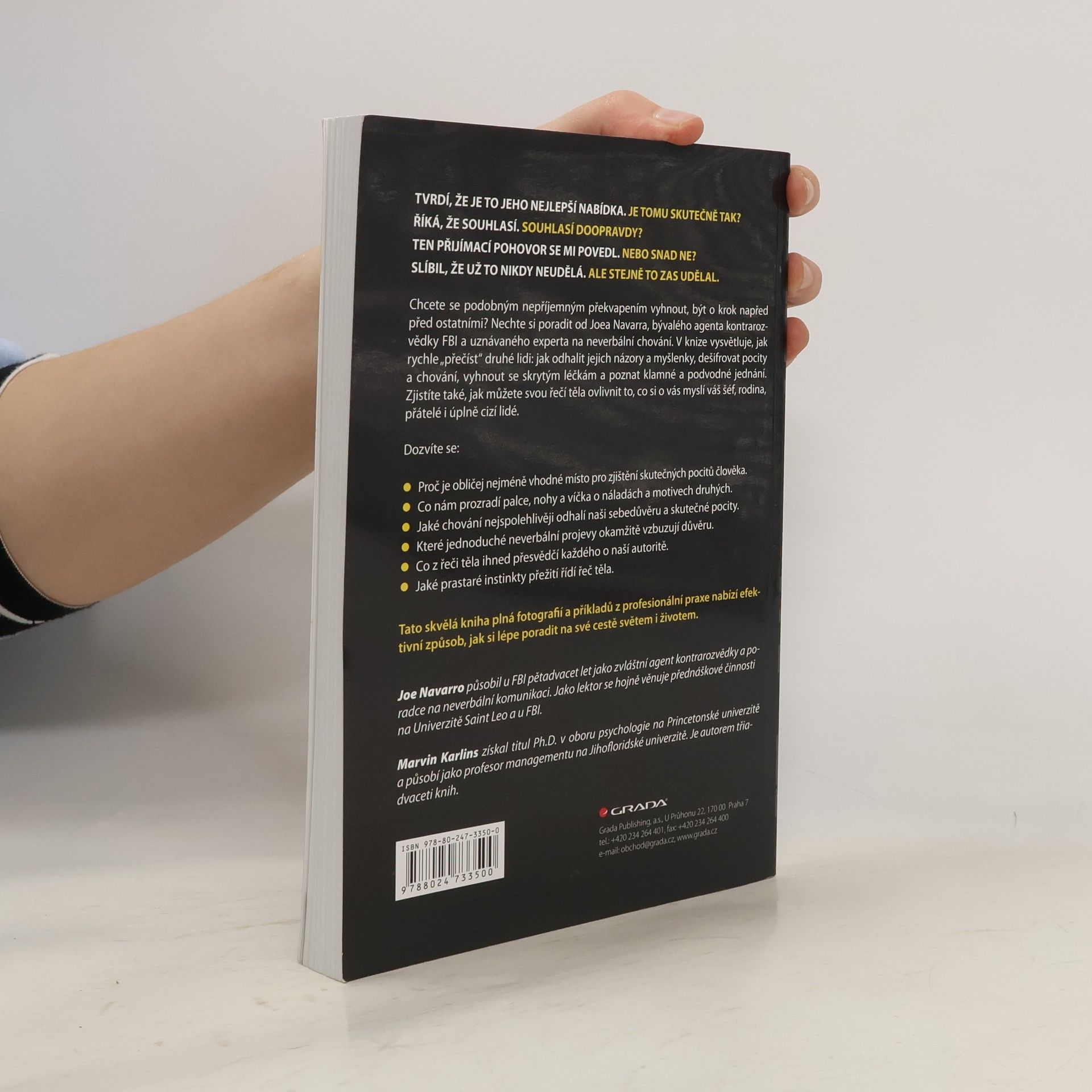 Tvrdí, že je to jeho nejlepší nabídka. Je tomu ale skutečně tak? Říká, že souhlasí. Opravdu? Slibuje, že už to nikdy neudělá. Ale stejně to zase udělal... Chcete se podobným nepříjemným překvapením vyhnout, být o krok napřed před ostatními? Nechte si poradit od Joea Navarra, bývalého agenta kontrarozvědky FBI a uznávaného experta na neverbální chování. V knize vysvětluje, jak rychle "přečíst" druhé lidi: jak odhalit jejich názory a myšlenky, dešifrovat pocity a chování, vyhnout se skrytým léčkám a poznat klamné a podvodné jednání. Dozvíte se například, proč je tvář nejméně spolehlivá oblast pro odhalení skutečných pocitů druhého člověka, co o našich náladách a motivech vyzradí palce, nohy nebo oční víčka, jaké chování prozrazuje naši sebedůvěru a pocity nebo s jakou neverbální komunikací podpoříte vzájemnou důvěru a svou autoritu. Zjistíte také, jak můžete svou řečí těla ovlivnit to, co si o vás myslí váš šéf, rodina, přátelé i úplně cizí lidé.